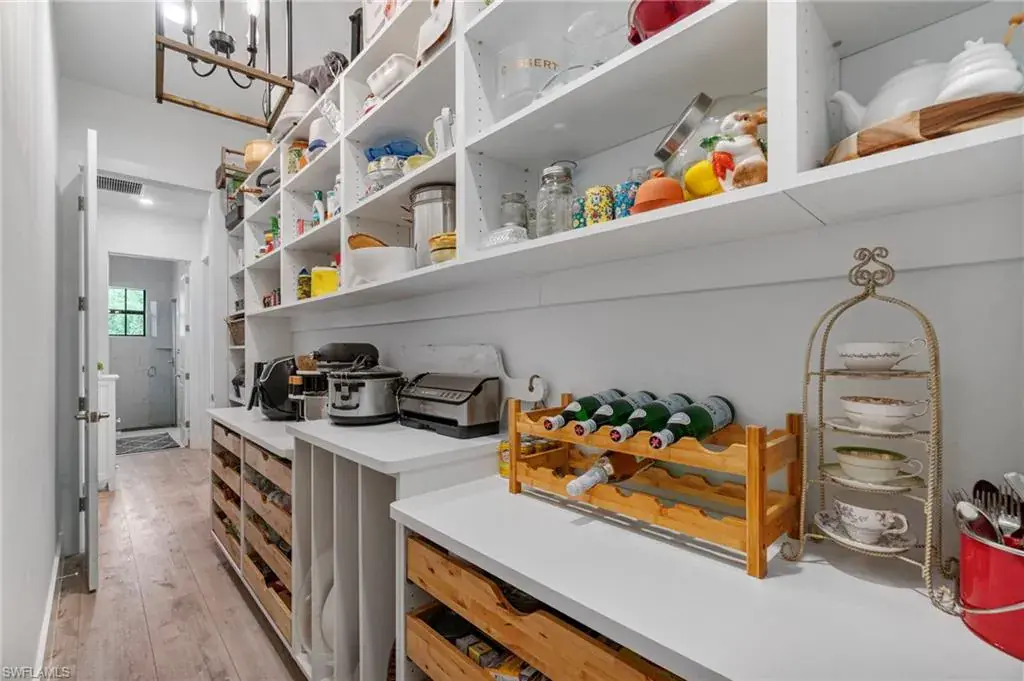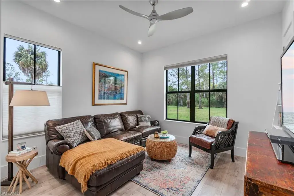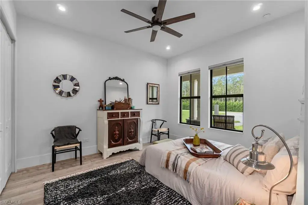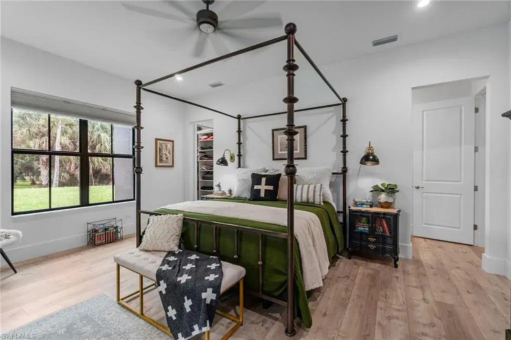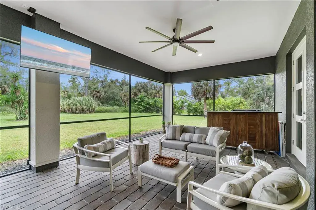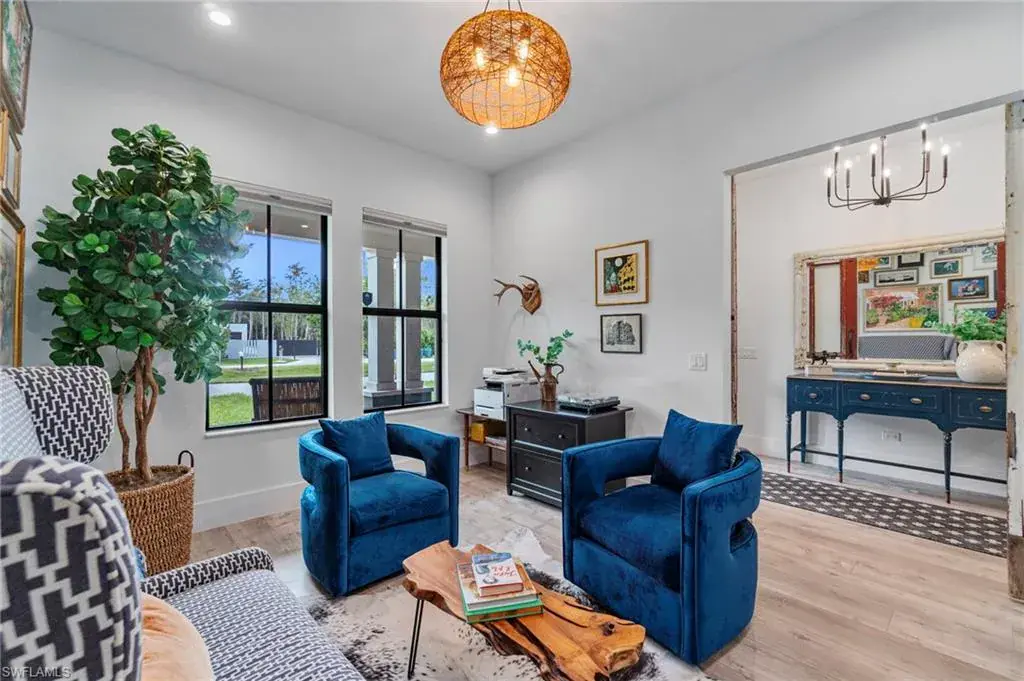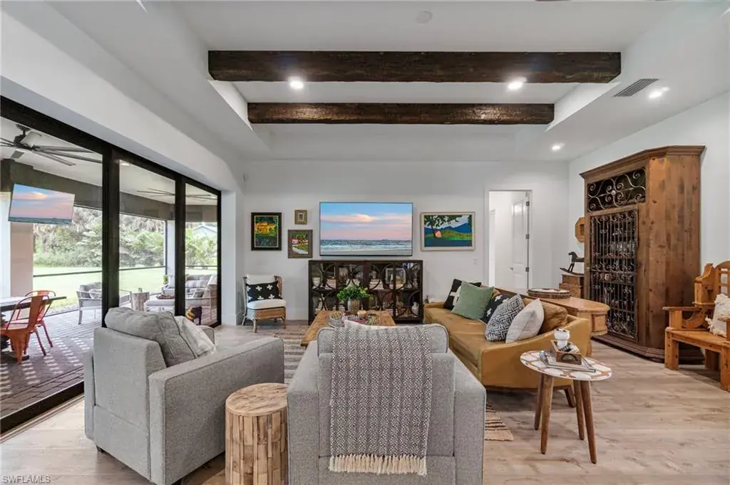 Experience the best of in-town acreage living with this stunning 2022-built estate home nestled on 2.73 acres of serene privacy in Logan Woods. Designed with timeless French countryside charm, this 5-bedroom + den residence showcases warm wooden beams in the great room, a split-bedroom floor plan, and an open-concept layout that blends elegance with everyday comfort. The chef’s kitchen is a true showstopper, anchored by a Thermador 48” range with six gas burners, flattop, and double ovens—along with a hidden, dual-access butler’s pantry that keeps everything organized and out of sight. From the kitchen and great room, walls of glass open to a sprawling screened lanai, where you’ll sip morning coffee while soaking in tranquil views of lush greenery. The primary suite is thoughtfully tucked away for peace and privacy, while additional bedrooms are positioned on the opposite side of the home, each with custom closet built-ins and ceiling fans. Every detail has been considered, including hurricane-impact windows and doors, whole-home reverse osmosis water system, tankless water heater, and upgraded 400-amp electrical with generator hookup. Outside, the possibilities are endless. The 20’x40’ metal-roofed garage/warehouse includes a workshop and could easily be converted into a 4-car garage. A newly paved driveway offers generous guest parking—and even potential space for your very own pickleball court. With a pre-wired pool panel, propane hookup for an outdoor kitchen, and storm-tested durability, this home is ready for generations to come. Don’t miss your chance to own this rare Naples treasure where privacy, elegance, and functionality come together in perfect harmony.