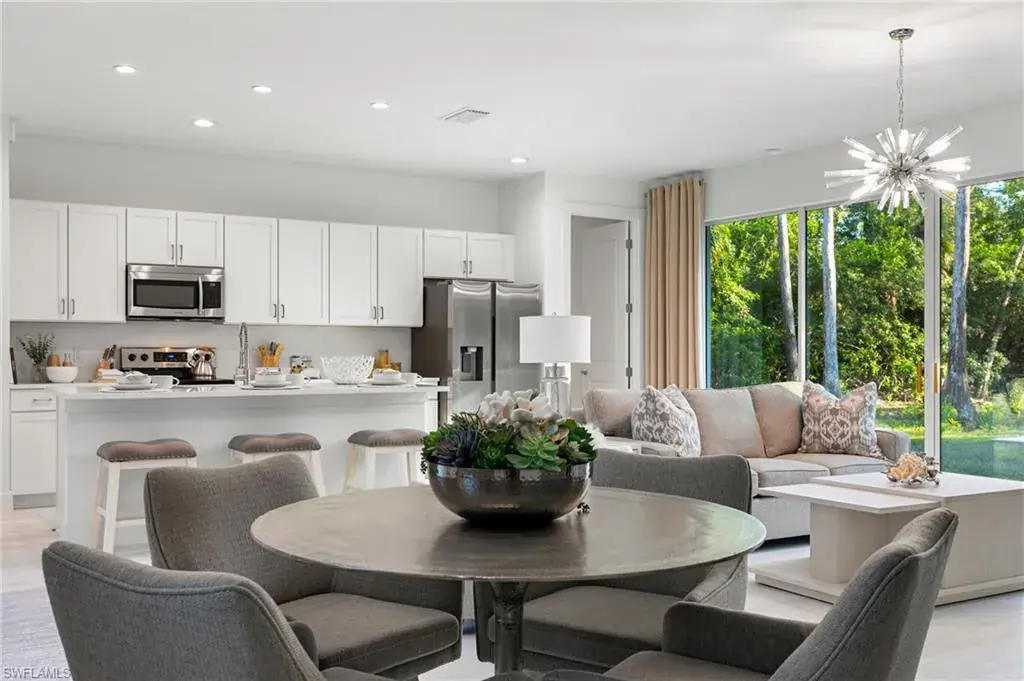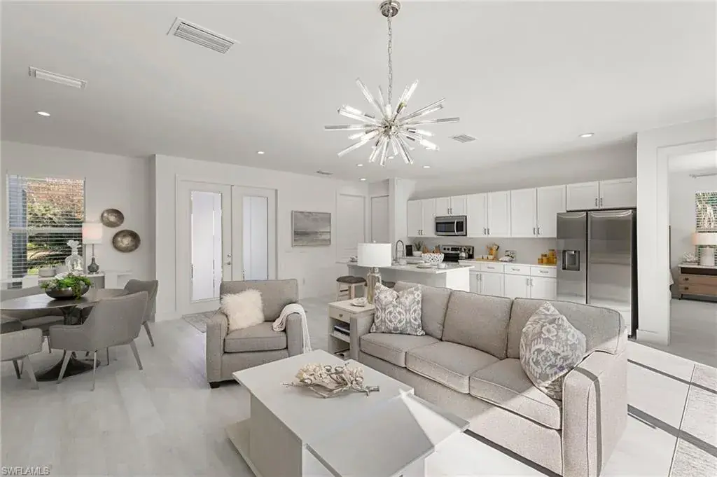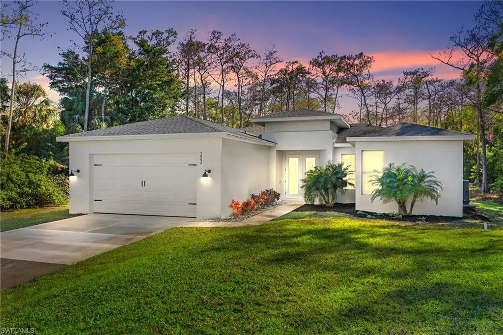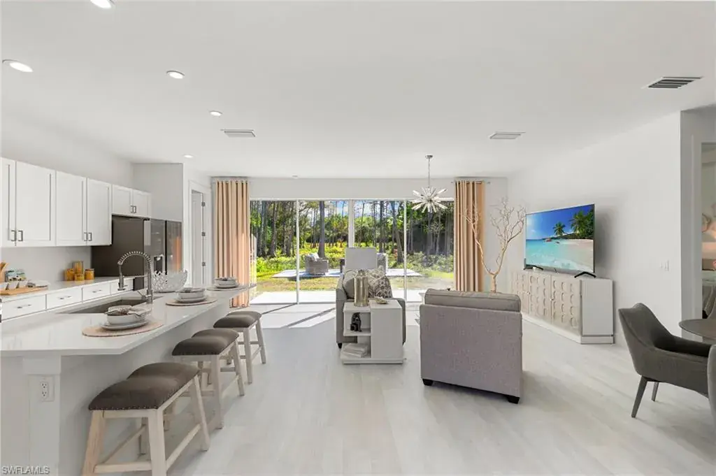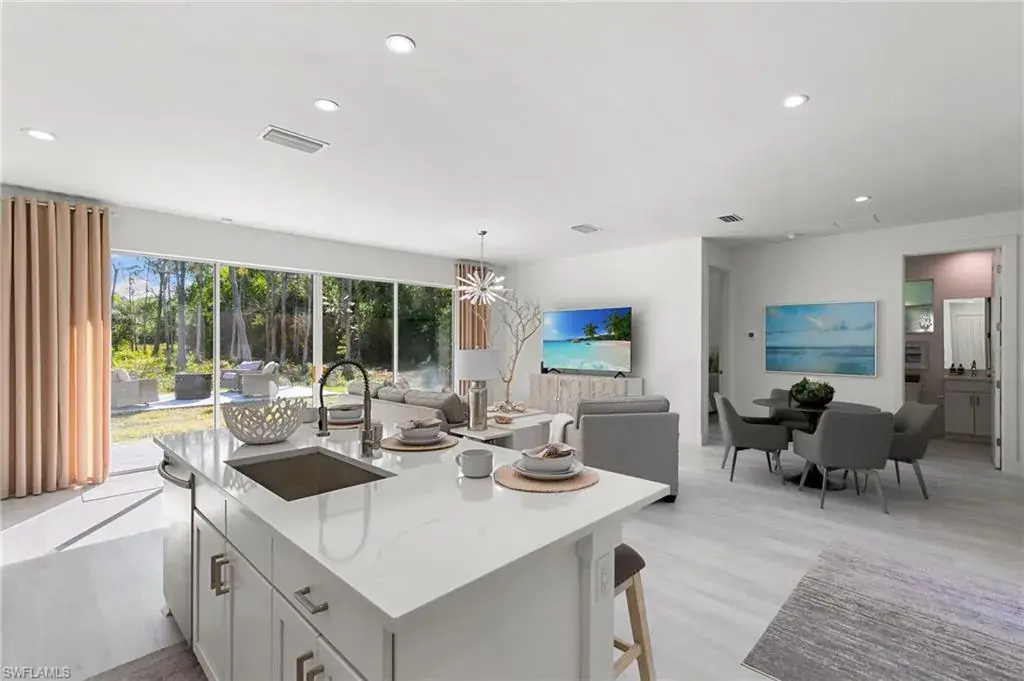 Stunning, TURNKEY, 3 bed/2 bath/2 car garage Logan Woods home has the Country feel, with a touch of elegance. This home was built in 2022 and beautifully detailed with neutral gray vinyl plank flooring and elegantly furnished – ready for you to move right in and start enjoying. Enter the great room, with open concept floor plan and bathe in the Florida sunshine streaming through the wall of sliding glass doors with a view of your patio area and large private back yard with room for a pool, guest house or workshop. Sleek kitchen with white cabinetry, white quartz countertops, S/S appliances and an island with seating, plus pantry closet for additional storage. The living/dining area has plenty of room to spread out and entertain or relax and enjoy! Split bedrooms for privacy, owner’s suite has 2 large closets, ensuite bath has tiled walk-in shower with glass door, dual sink vanity with quartz countertops. Two additional large bedrooms with ample closet space share a full bath with tiled tub/shower combo, vanity and large linen closet. Laundry room off of the kitchen for convenience, leads out to the 2-car garage with epoxy flooring. A unique point of the home is the private entry to the rear of the property via the access road which adds convenience, or you can simply drive on the side of the home to access the rear portion of the property to store larger vehicles. This home has it all – peace of mind of newer construction, turnkey furnished, no HOA, plus an amazing location just a short drive to Mercato, Waterside Shops, Vanderbilt Beach, Ritz Carlton Tiburon, easy access to I-75 – don’t miss out!