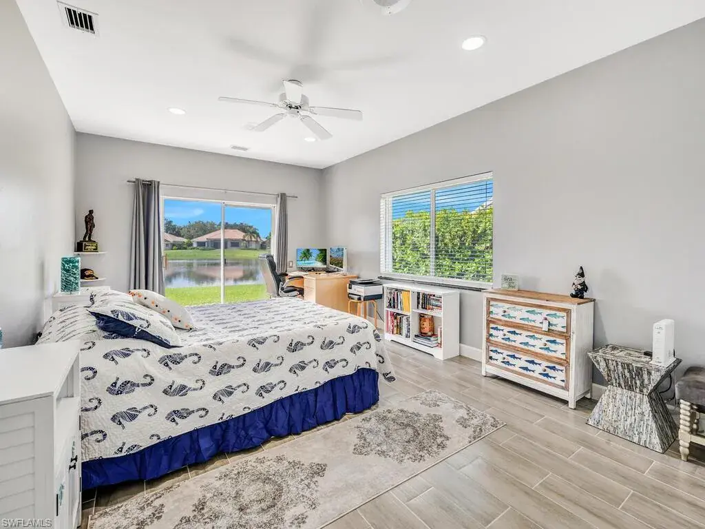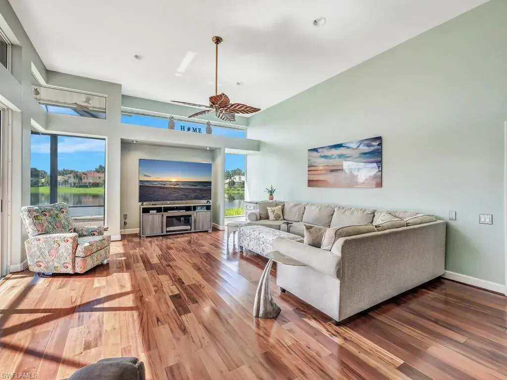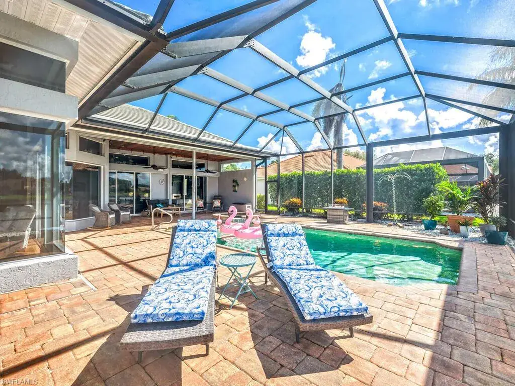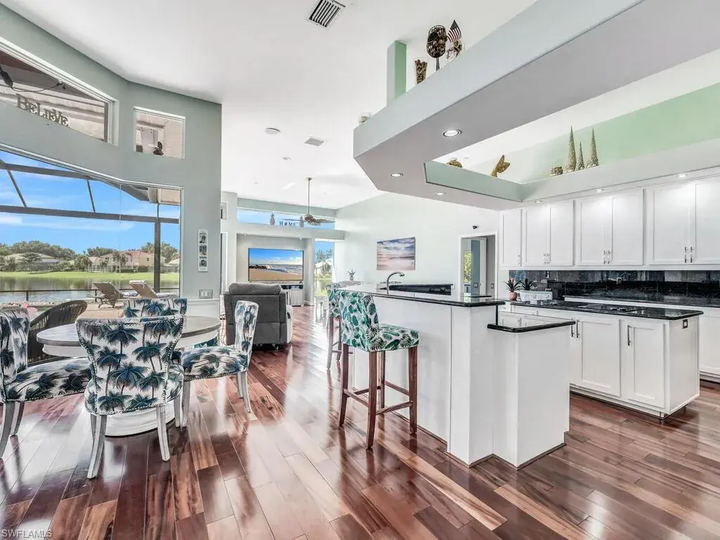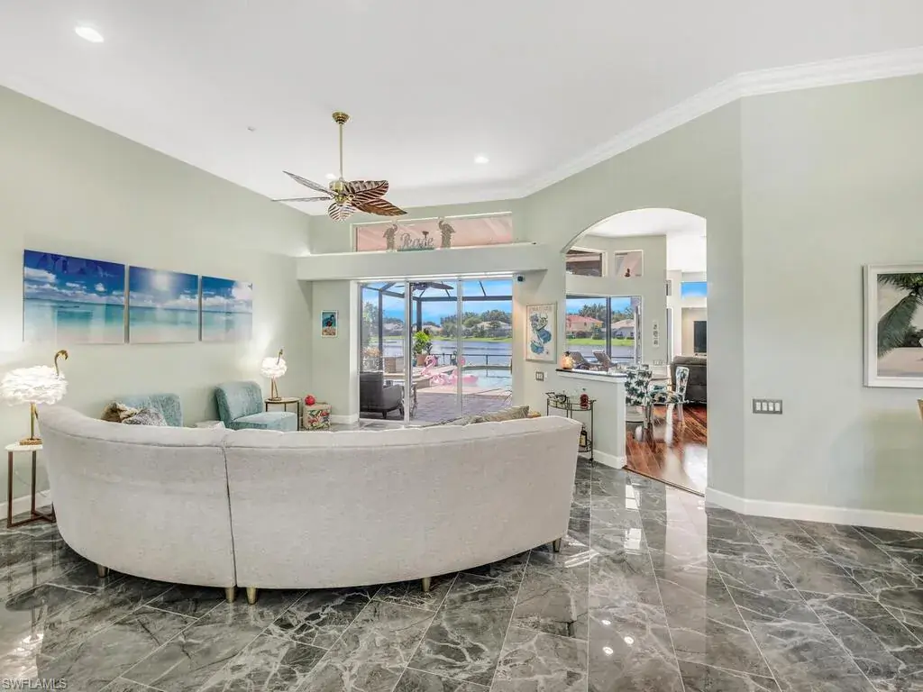 Experience the true essence of Florida living where the outdoors seamlessly blend with the indoors! This stunning open-concept home is bathed in natural light and offers breathtaking panoramic water views from nearly every room—an entertainer’s dream! Step outside to a spacious deck with coveted Southern exposure, featuring generous deck space, a heated pool, spa, and ambient lighting, all overlooking shimmering waters and spectacular sunsets. There is even your own private dock just outside your door! It’s the perfect backdrop for relaxation and memorable outdoor gatherings. Inside, you’ll find 3,100 square feet of beautifully updated living space, including 3 bedrooms, den, 2.5 baths, and an oversized 2-car garage. The stunning newly renovated primary bath is a luxurious retreat, complete with stand alone tub, frameless glass shower, polished tile, dual vanities with quartz countertops, designer lighting, and more. Additional enhancements include a sleek stainless steel French-door refrigerator with InstaView Beverage Center and Craft Ice, a new Bryant A/C system (main), newer washer and dryer, and new polished tile flooring in the living, dining, and foyer, and plank tile in the bedrooms, baths, and den. The family room, breakfast room and kitchen are accented with beautiful Brazilian wood floors and built-in wood cabinetry in the dining room provide the perfect finishing touches. A newer roof, new window treatments and designer lighting complete the home’s list of impressive upgrades. Located in the highly sought after, gated community of Longshore Lake in North Naples, residents enjoy an 88-acre lake perfect for boating, fishing, kayaking, and sunset cruises. The community also offers a clubhouse with a restaurant, bar and outdoor dining, 9 Har-Tru tennis courts with a full-time pro, a fitness center, miles of scenic walking paths, playground and more! Discover the lifestyle that you have always dreamed of……paradise awaits!