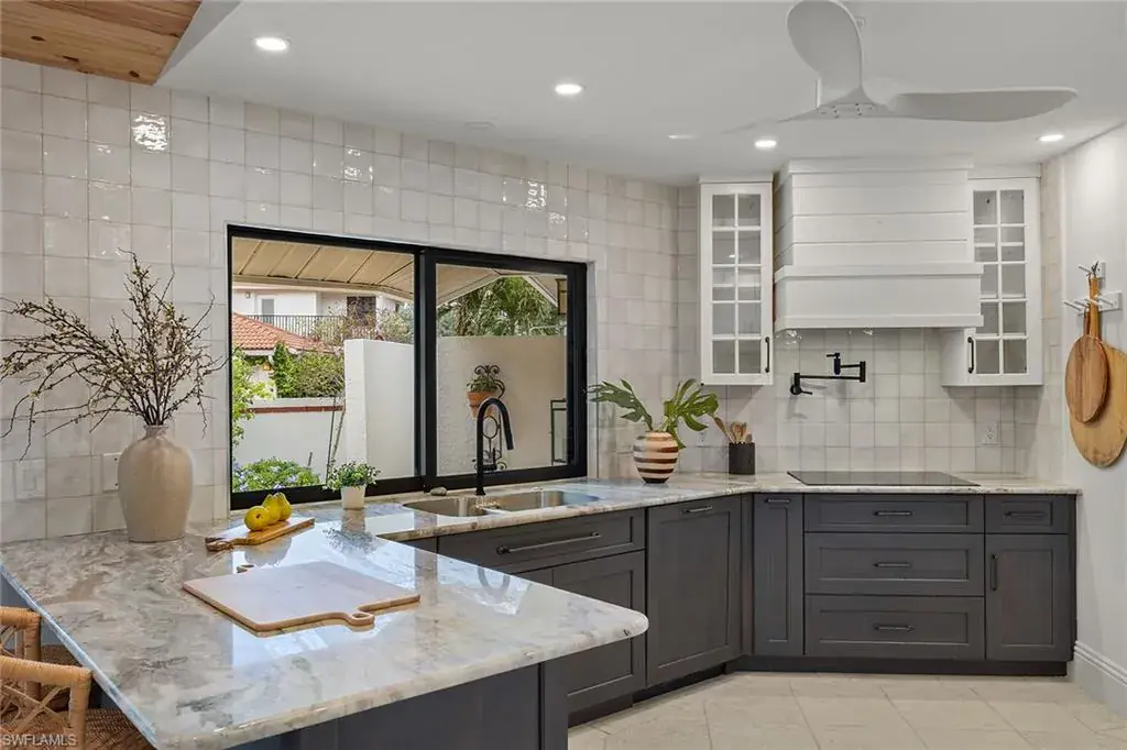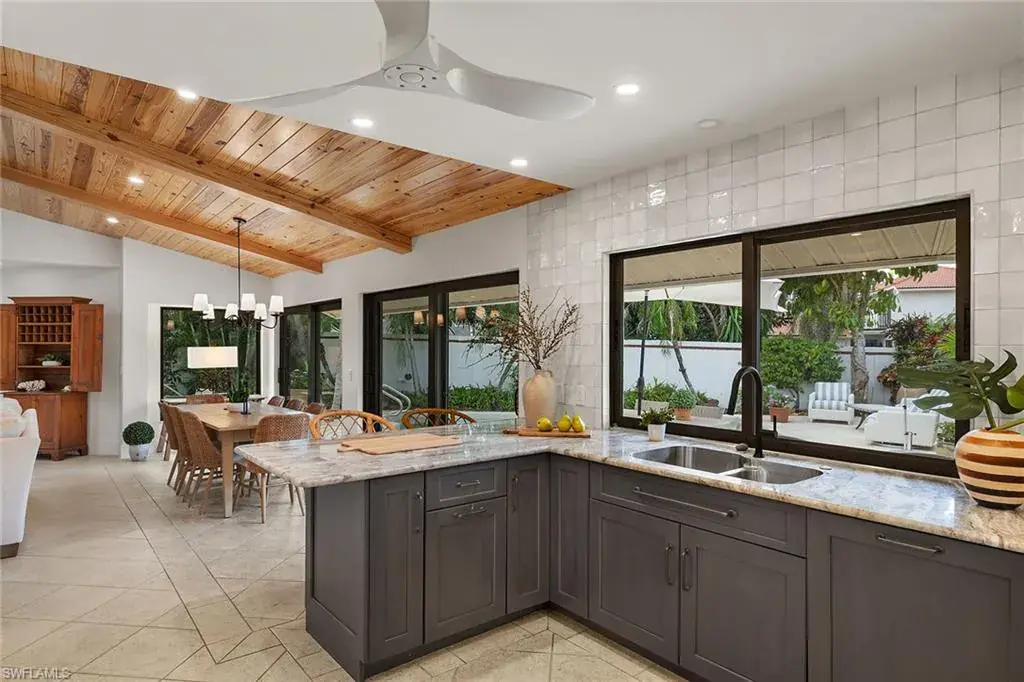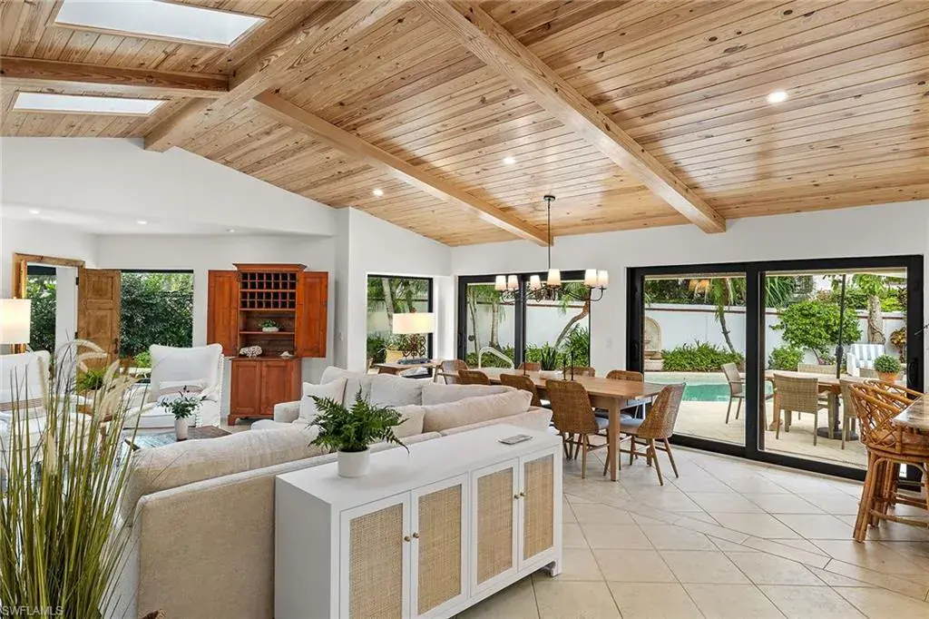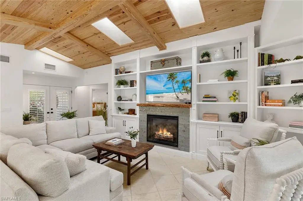 This Coastal Cottage home in Pelican Bay blends elegance with modern comforts. With three bedrooms with en suites, the Lugano home features elements like shiplap walls and high-end finishes. The primary bath is complete with a walk-in shower and freestanding tub. The living area exudes warmth with its wood-paneled vaulted ceilings and skylights that flood the space with natural light. A built-in wall with a fireplace adds character and charm. The updated kitchen opens onto lush gardens and the pool. Each bedroom offers privacy and serene views with impact-resistant glass windows and sliders throughout. Additional highlights include a two-car garage, gas pool and spa heater, tankless water heater, all with a seamless flow between indoors and outdoors, making this home a gem in Pelican Bay. Pelican Bay amenities include private beaches, beachfront restaurants, beautiful sunsets, racket sports, fitness center, walking trails and more.