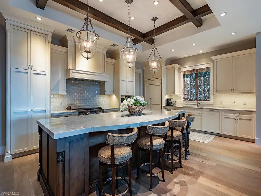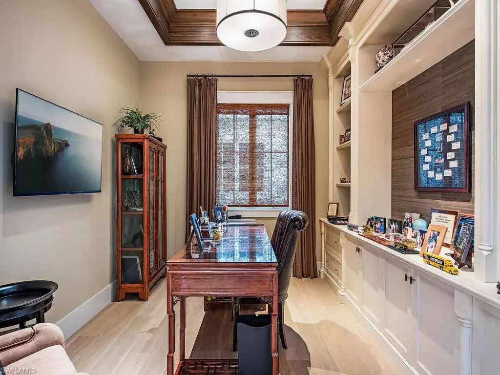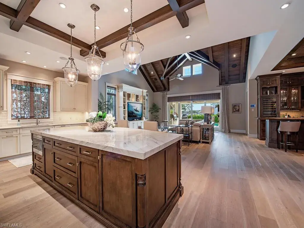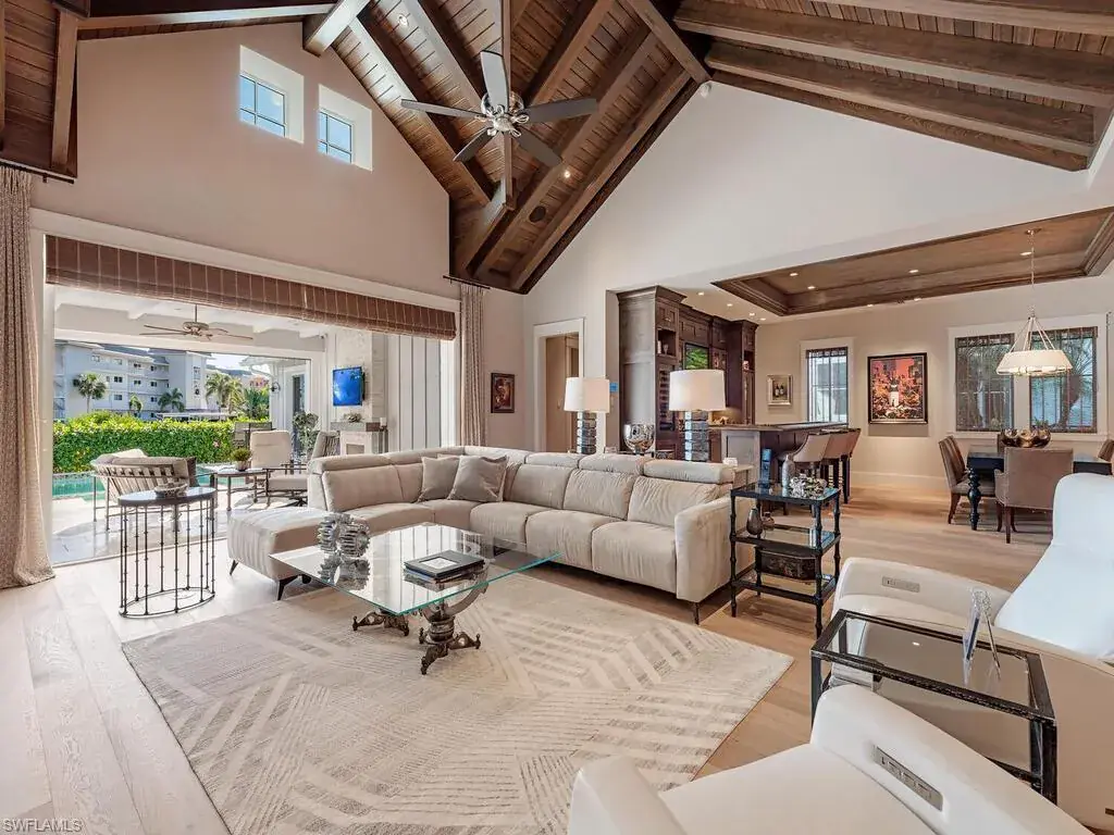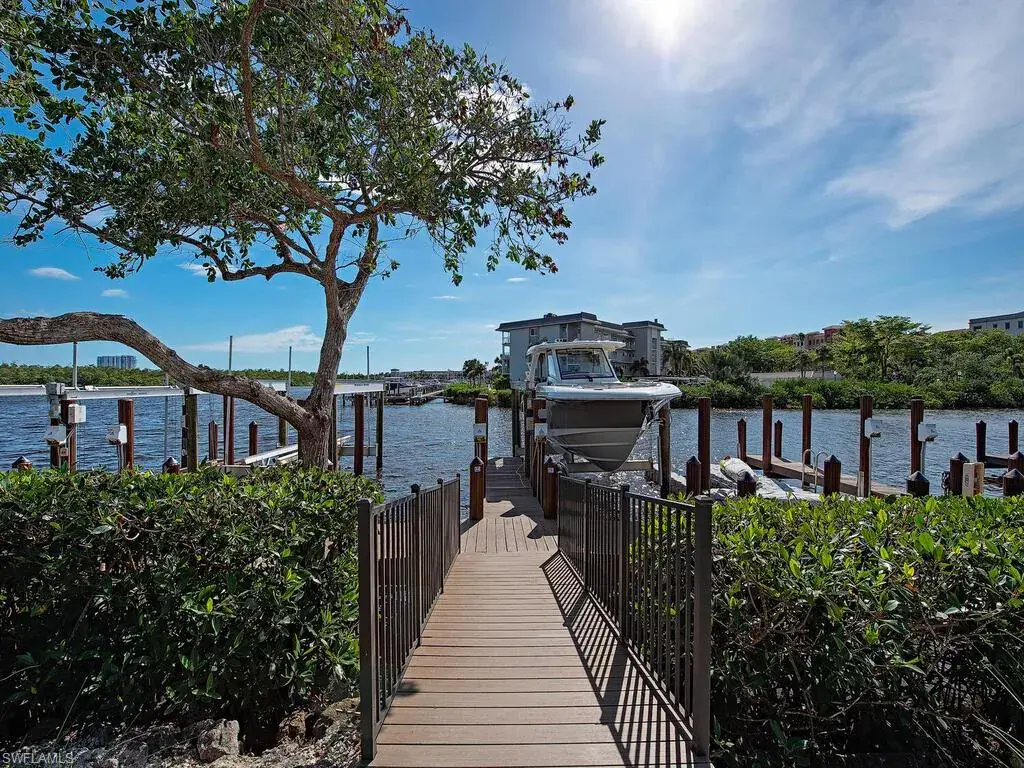 An exceptional waterfront residence in Mangrove Bay, this customized Amelia II plan perfectly captures the relaxed elegance of Naples living. Featuring rarely available direct water views in Mangrove Bay, the home blends the comfort of single-family design with the ease of condo-style convenience. Ideally situated in the heart of downtown, the 3,607 sq. ft. residence offers desirable southern exposure, a gas-heated pool and spa, a 2-car garage, superior finishes, and a covered boat slip with a 16,000 lb lift. The gourmet kitchen showcases Ruffino cabinetry, quartz countertops, and top-tier Wolf and Sub-Zero appliances. A thoughtfully reimagined open floor plan highlights a dramatic 13-foot bar equipped with a Sub-Zero wine cooler, beverage drawers, and a clear ice machine—designed for effortless entertaining. Wide-plank oak flooring, tongue-and-groove and wood beam ceilings, and expansive outdoor living spaces with a kitchen and automated screens/shutters further enhance the home’s appeal. Community amenities include a wellness center, kayak storage, and a private boat ramp, with Baker Park and the Gordon River Greenway just steps away. Residents also enjoy proximity to the new Gulfshore Playhouse, along with the fine dining and boutique shopping of 5th Avenue. This home embodies the charm of Old Naples while offering all the benefits of a true waterfront lifestyle. Agents, see confidential remarks regarding floor plan.