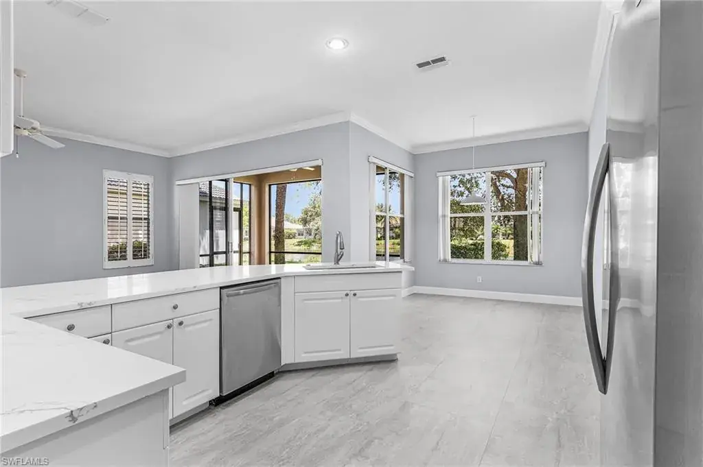 Welcome to your completely renovated attached villa in the highly desirable Autumn Woods, offering an incredible lake view from your private screened-in lanai. This stunning “Juniper” model has been meticulously updated for modern living. Step inside onto brand-new porcelain tile that flows seamlessly throughout the entire home. The heart of the home, a beautifully updated kitchen, shines with new countertops and new stainless steel appliances, a theme carried into the refreshed bathrooms. Even the spacious two-car garage has been perfected with a durable epoxy floor finish. This move-in-ready home offers the perfect blend of modern luxury and a low-maintenance lifestyle, all set against a serene water backdrop.