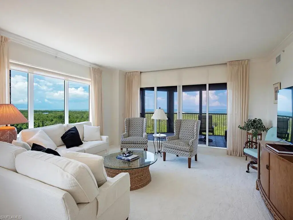 Rarely available 7th floor, 2555 sq. ft. end unit, may live as 2 bedrooms plus den or three bedroom home for your pleasure and enjoyment. The windows and floor to ceiling sliding doors capture the beautiful Pelican Bay vistas brightening your home throughout the day. Enjoy the sounds of songbirds and gentle warm breezes from two large sunrise and sunset terraces, or simply immerse yourself in the nature that is on your doorstep by walking the berm, a meandering wooden walkway through the mangroves and scenic waterways that ends at the white sand beach and private clubhouse with outdoor dining. Situated within The Marbella, a luxury high rise with wonderful neighbors and genuinely helpful staff, the amenities are second to none with concierge, dining including room service and healthcare assistance when needed right at your fingertips.