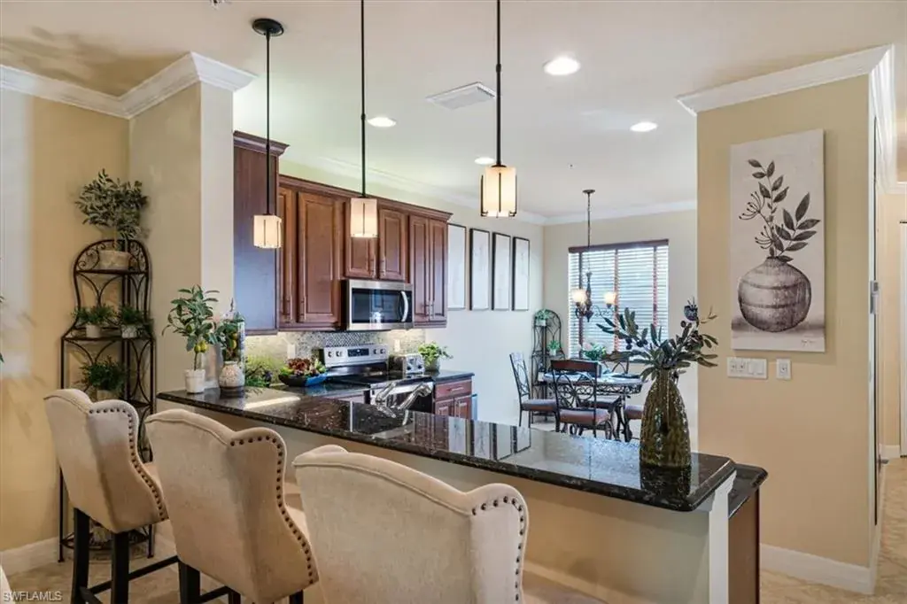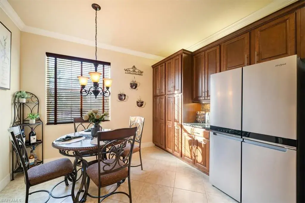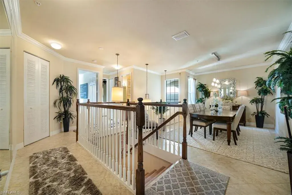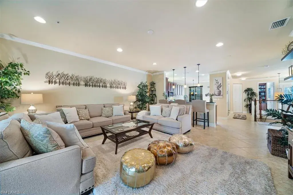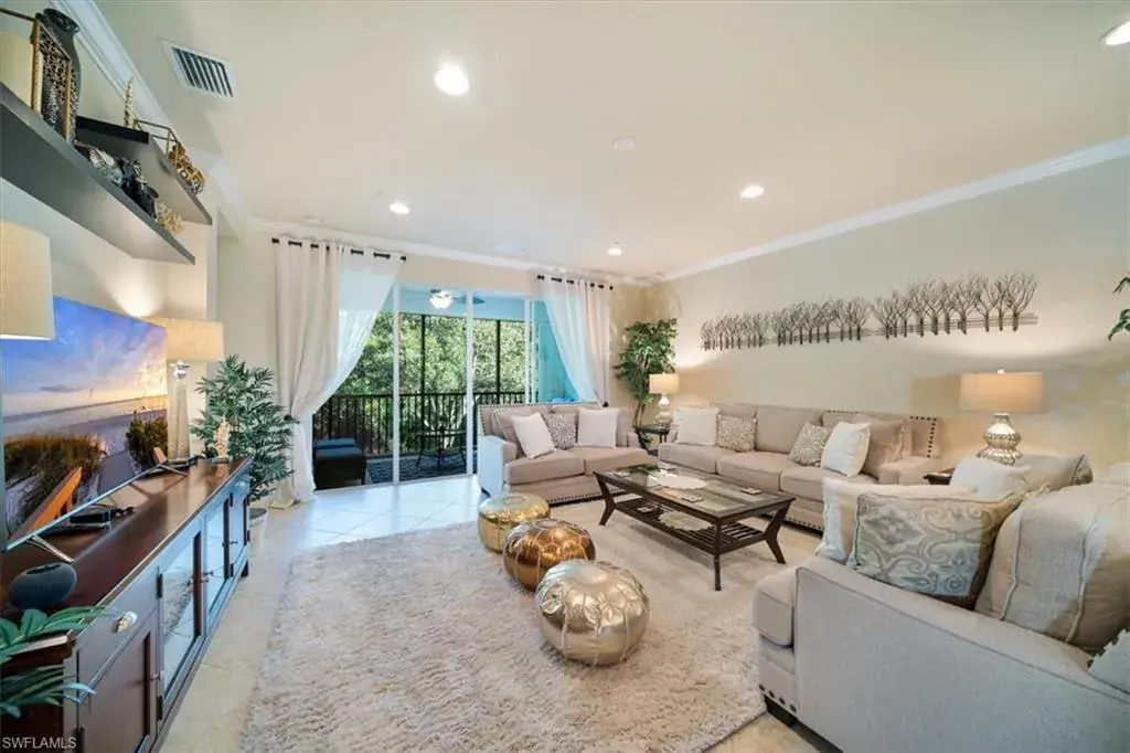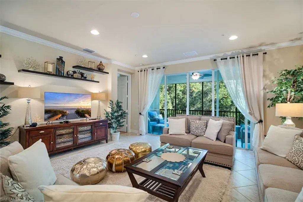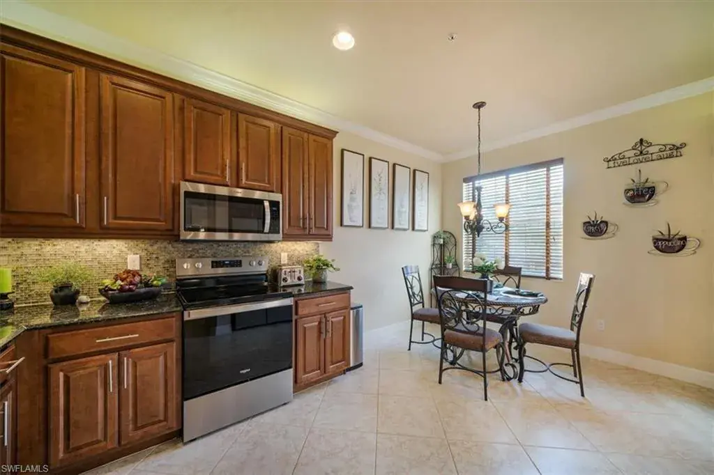 Welcome to this meticulously maintained 2nd-floor condo in the sought-after gated community of Marbella Lakes. Freshly painted and beautifully furnished with high-end decor (furniture package negotiable), this residence offers a spacious kitchen with warm wood-toned cabinets, a large pantry, stainless steel appliances, and a tiled backsplash. Enjoy versatile dining options with a breakfast bar, eat-in kitchen nook, and formal dining space. Upgrades include crown molding, updated lighting, and custom draperies and blinds. The neutral tile flooring is laid on a diagonal throughout. A guest suite doubles as a den with custom built-ins for a desk and storage. Relax on the private screened lanai with tiled floors. Community amenities feature a resort-style pool, splash pad, fitness center, clubhouse, three clay tennis courts, and four new pickleball courts. Conveniently located near shopping, dining, downtown Naples, and the Gulf of Mexico’s sunny beaches, just west of I-75—an ideal location for enjoying the Naples lifestyle.