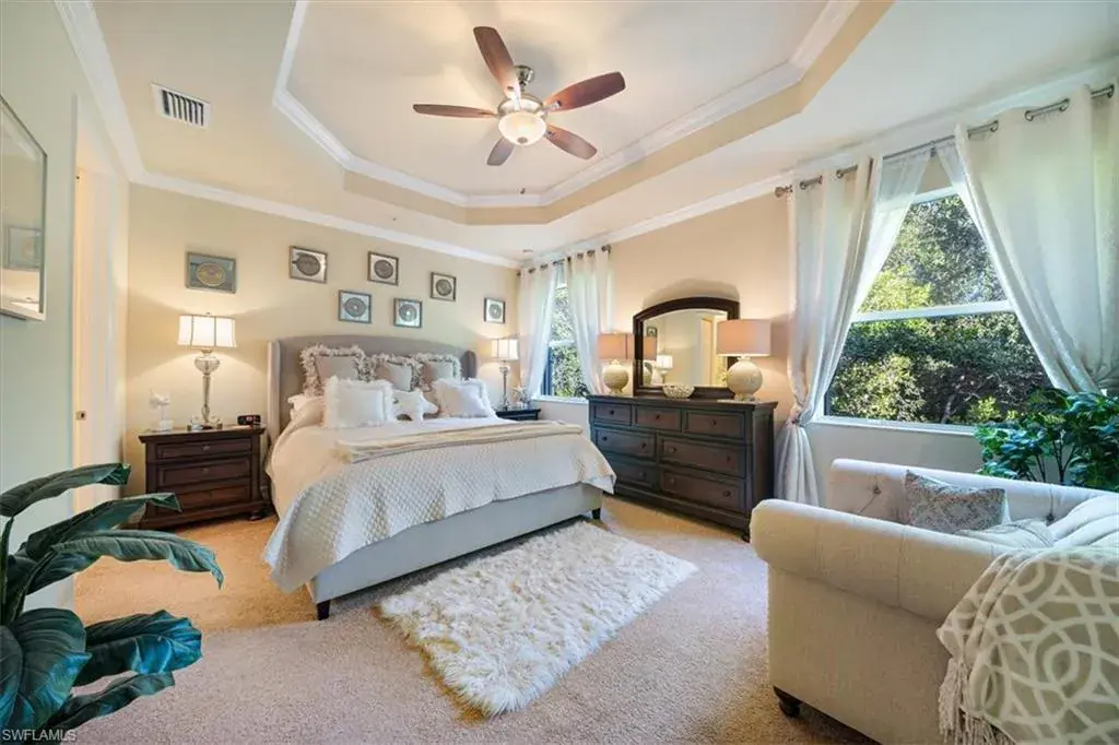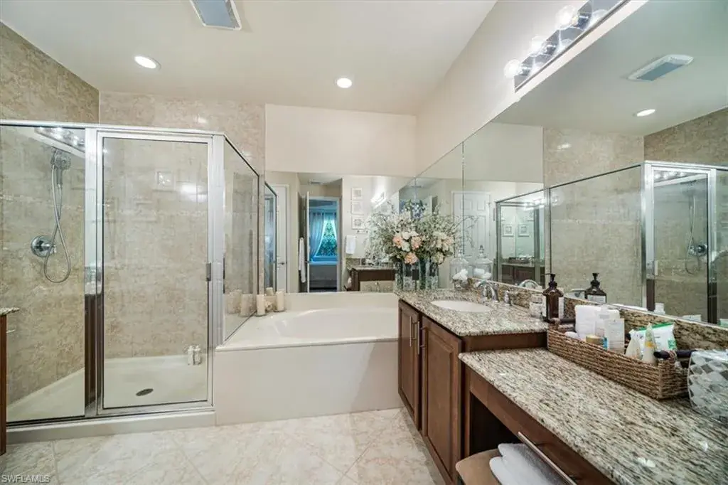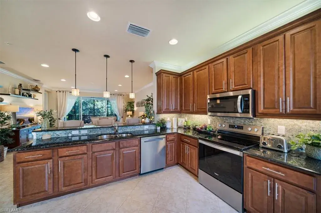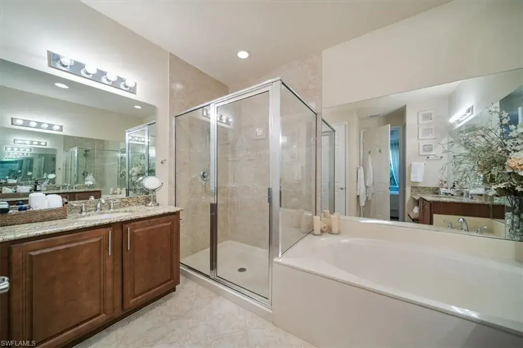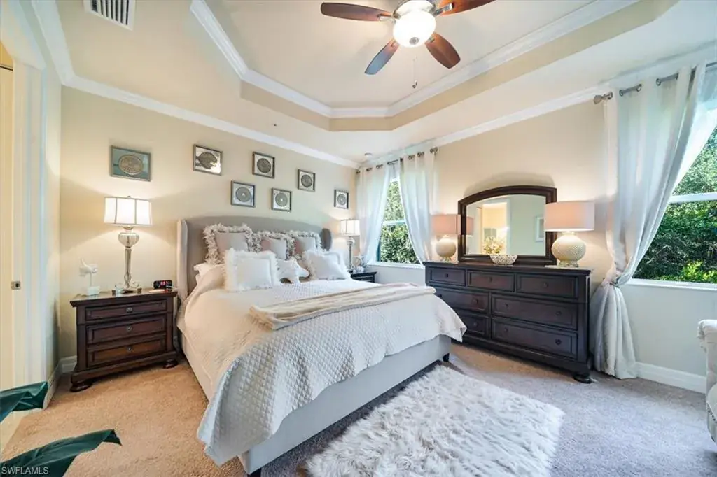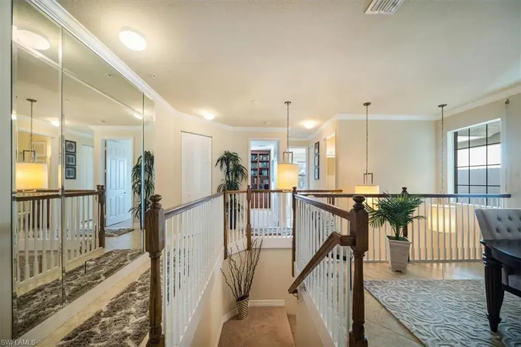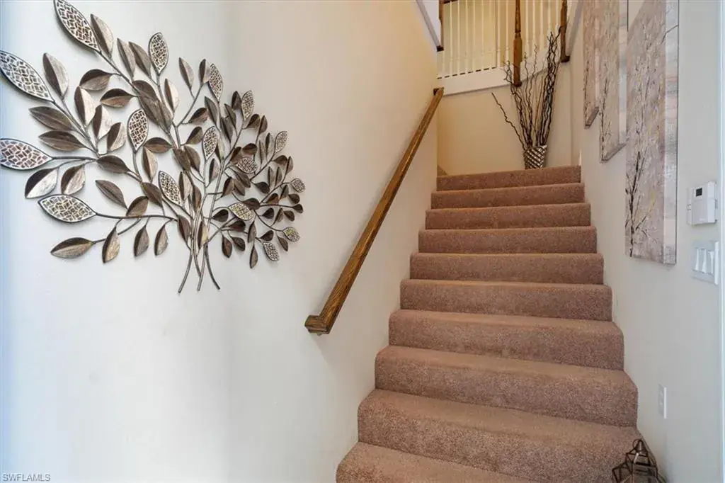 Welcome to this meticulously maintained 2nd-floor condo in the sought-after gated community of Marbella Lakes. Freshly painted and beautifully furnished with high-end decor (furniture package negotiable), this residence offers a spacious kitchen with warm wood-toned cabinets, a large pantry, stainless steel appliances, and a tiled backsplash. Enjoy versatile dining options with a breakfast bar, eat-in kitchen nook, and formal dining space. Upgrades include crown molding, updated lighting, and custom draperies and blinds. The neutral tile flooring is laid on a diagonal throughout. A guest suite doubles as a den with custom built-ins for a desk and storage. Relax on the private screened lanai with tiled floors. Community amenities feature a resort-style pool, splash pad, fitness center, clubhouse, three clay tennis courts, and four new pickleball courts. Conveniently located near shopping, dining, downtown Naples, and the Gulf of Mexico’s sunny beaches, just west of I-75—an ideal location for enjoying the Naples lifestyle.