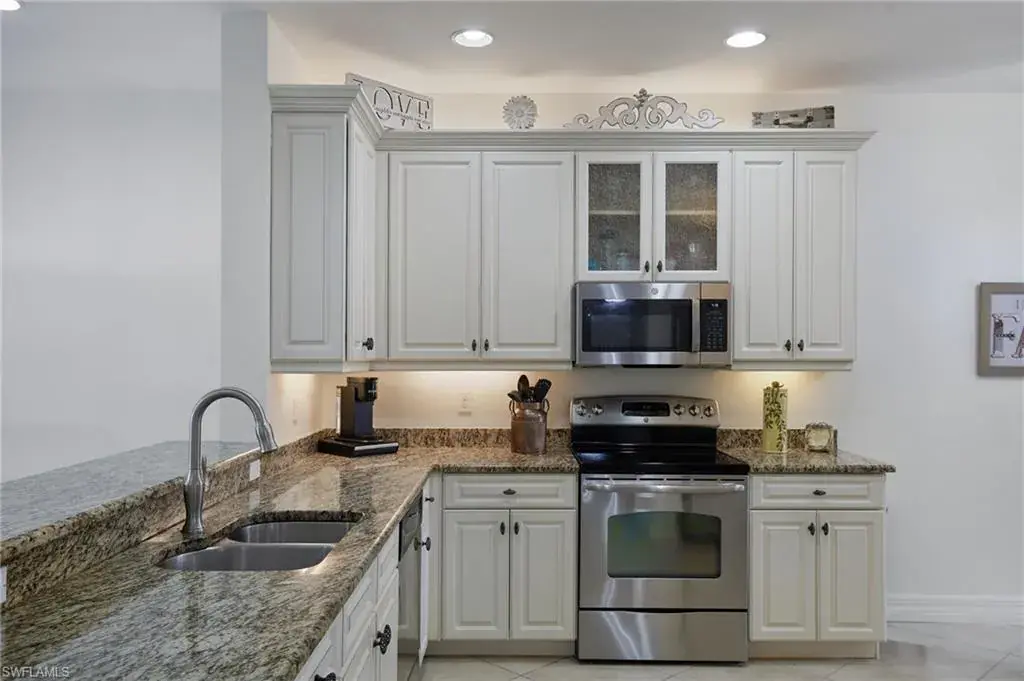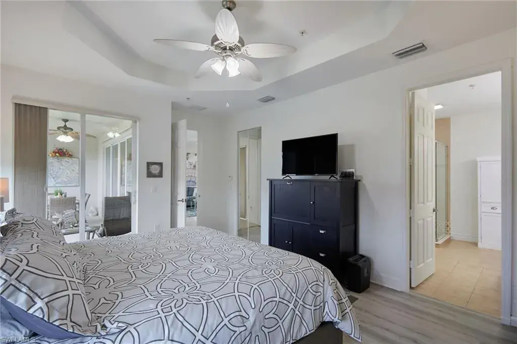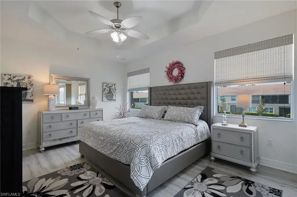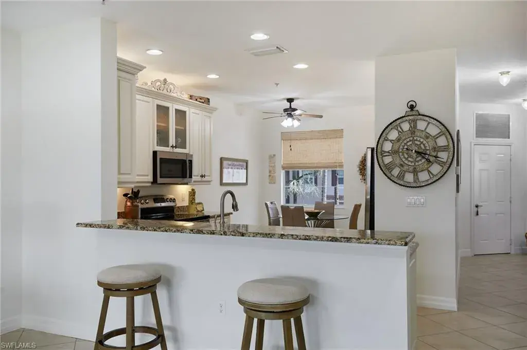 The thoughtfully designed layout includes a high ceilings and a split floor plan for enhanced privacy, custom drapery in every room, tile and LVP flooring throughout, and elongated 8 foot doors for a look of elevated elegance. The modern eat-in kitchen is a chef’s delight, complete with 42-inch cabinets, stainless steel GE appliances, granite countertops, and a convenient breakfast bar and separate dining eat in kitchen area! Natural lighting flows bountifully throughout the unit pouring in from the large windows and stunning lake front lanai. The primary suite features custom closets, access to your waterfront lanai, and an upgraded ensuite bath with dual sinks and an oversized glass shower. Let’s talk peace of mind: enjoy all of the comforts of worry-free living with electric hurricane shutters and 2022 AC unit!