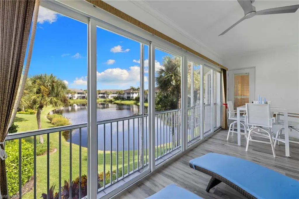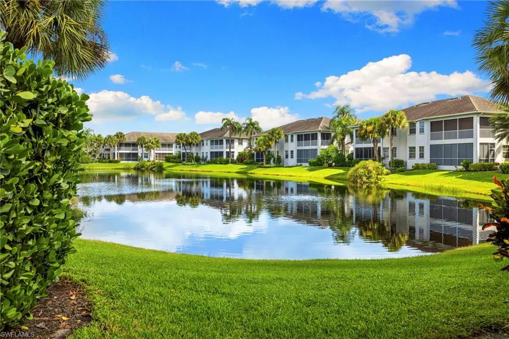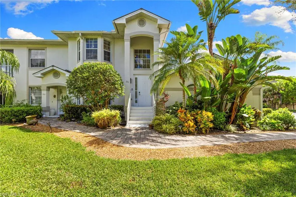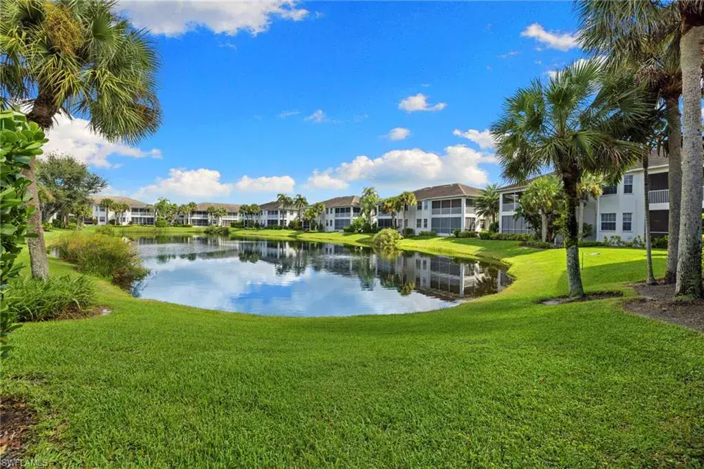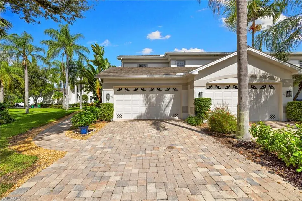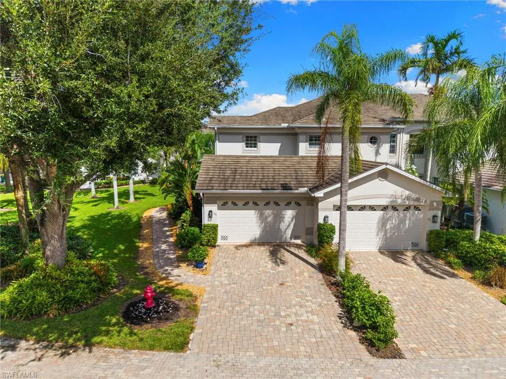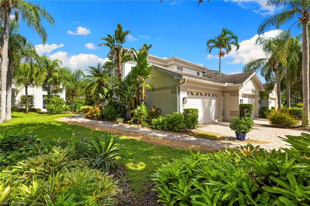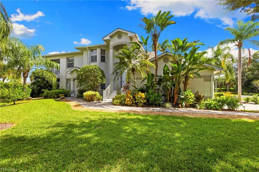 Inviting coach home featuring an open, spacious floor plan with 2 bedrooms plus a den and 2 full baths! Enjoy lake and fountain views from the oversized screened lanai—ideal for relaxing or entertaining. This well-designed residence features a large side yard with a park-like setting that provides an abundance of natural light throughout. Interior highlights include a beautiful kitchen with shaker-style cabinetry, granite countertops, a center island, stylish designer flooring and an open dining/living area that flows seamlessly together. Additional features include a two-car garage, beautiful tropical landscaping, and more.