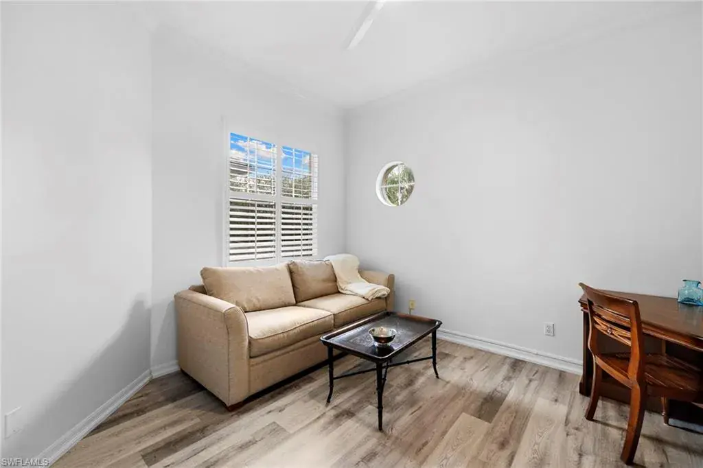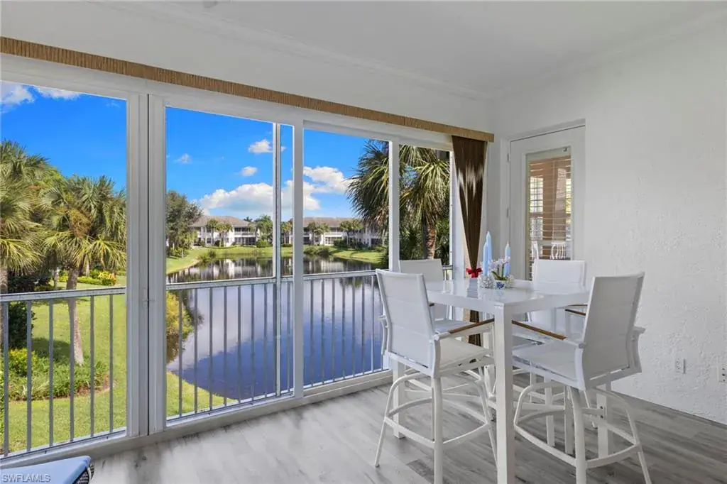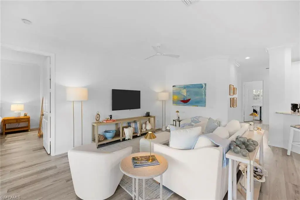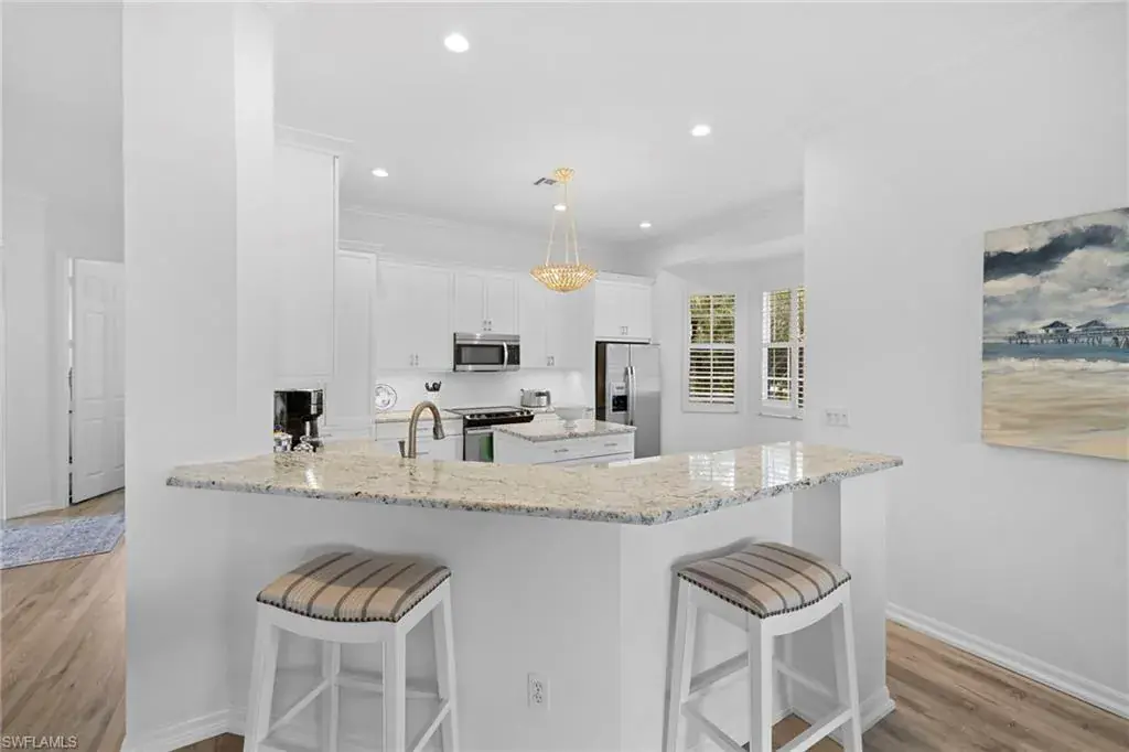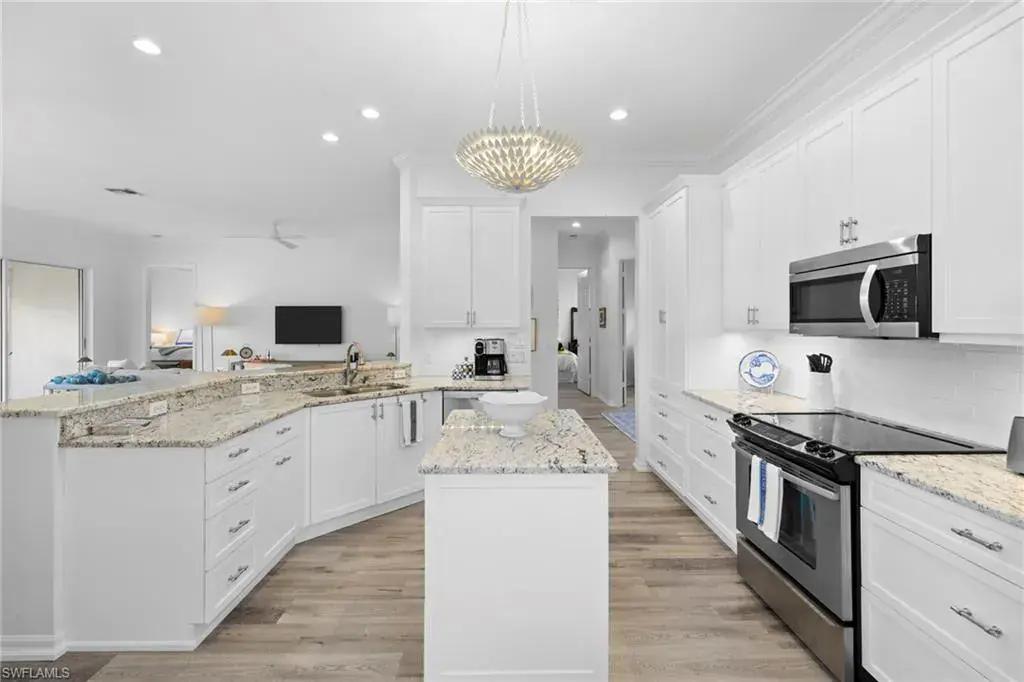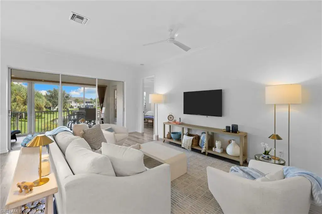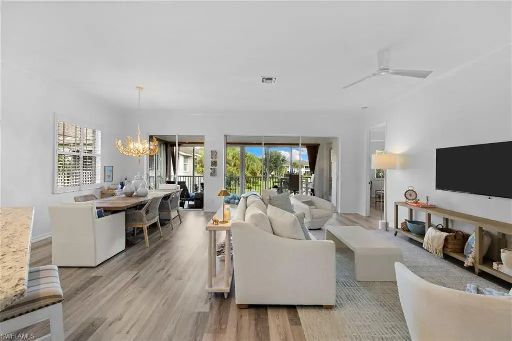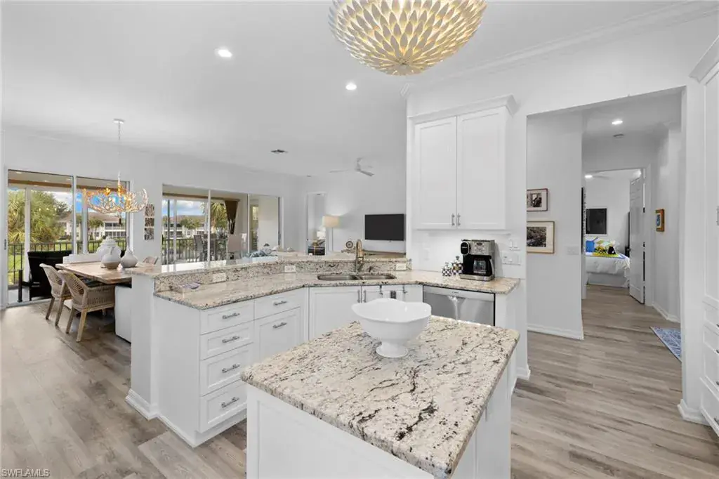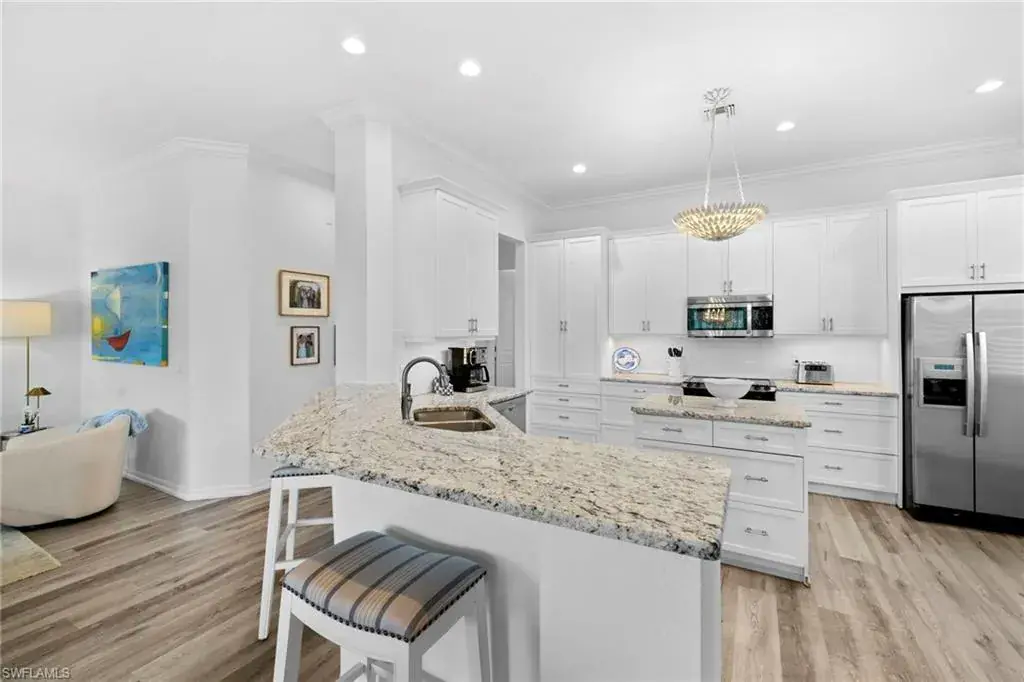 Inviting coach home featuring an open, spacious floor plan with 2 bedrooms plus a den and 2 full baths! Enjoy lake and fountain views from the oversized screened lanai—ideal for relaxing or entertaining. This well-designed residence features a large side yard with a park-like setting that provides an abundance of natural light throughout. Interior highlights include a beautiful kitchen with shaker-style cabinetry, granite countertops, a center island, stylish designer flooring and an open dining/living area that flows seamlessly together. Additional features include a two-car garage, beautiful tropical landscaping, and more.