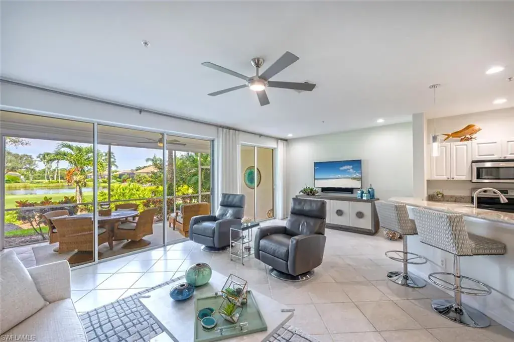 Are you a “VIEW BUYER”? If yes, you MUST check out the view from this spectacular coach home! “Welcome Home” to Marina Cove, a charming, lushly landscaped neighborhood within the magnificent, guard-gated community of Windstar on Naples Bay. Windstar’s amenities are unrivaled in Naples; they are the only golfing community on Naples Bay! The award-winning lifestyle offers a world-class marina as well as a boat shuttle to the private resident’s beach on Keewaydin Island! The club just underwent a stunning $14 million dollar Clubhouse renovation. There is something for everyone: tennis, bocce and pickleball, too! The meticulous first-floor residence has an attached garage and features an open Great Room drenched in light from the wall of sliders. The spacious primary suite has a beautiful bay window and the luxurious primary bathroom features a Roman tub, walk-in shower, double sinks, a private water closet, and an oversized walk-in closet. The large screened-in lanai showcases tranquil views of the shimmering lake and the 5th tee! This breathtaking view was the main reason the seller purchased this lovely home! This inviting residence boasts an airy ambiance, adorned with plantation shutters throughout, tile flooring in the common areas and plush carpeting in the bedrooms. The expansive all white kitchen offers granite counters, stainless appliances, a pantry, and a cozy, sunlit breakfast nook. Marina Cove residents can enjoy an active lifestyle, with its own community pool, spa and clubhouse. Situated in the trendy Bayshore Art District, you are just minutes away from Celebration Park, 360 Market, Ankrolab Brewery, Rebecca’s Cocktail & Wine Bar, Naples Botanical Gardens and Sugden Park! Plus, this vibrant area is a mere 10 minutes from Downtown Naples shopping, dining, and beautiful beaches. We think this immaculate home checks all the boxes. It’s the ultimate Naples lifestyle that you deserve! IMPORTANT TO NOTE: **The HOA includes Flood insurance! ** The community also has brand new HOTWIRE fiberoptic high speed internet which is also included in the fees!