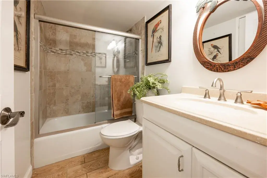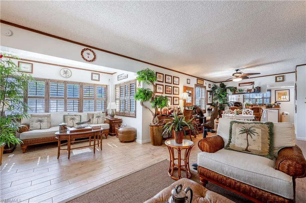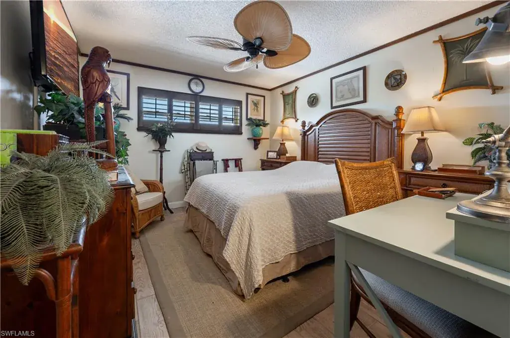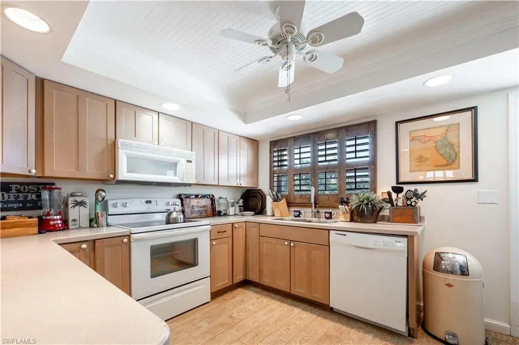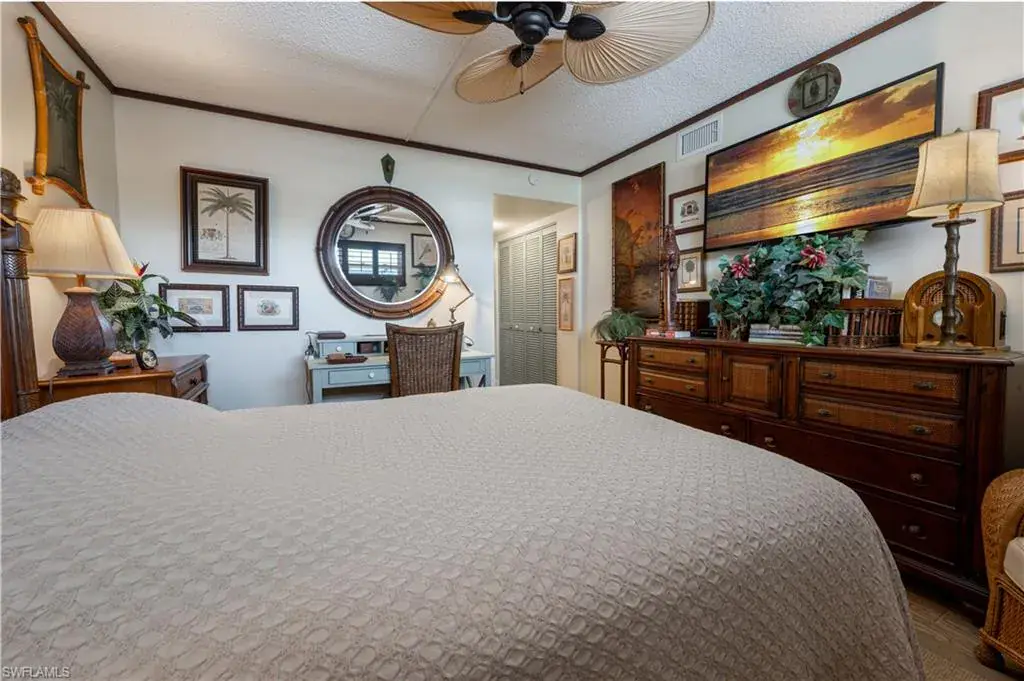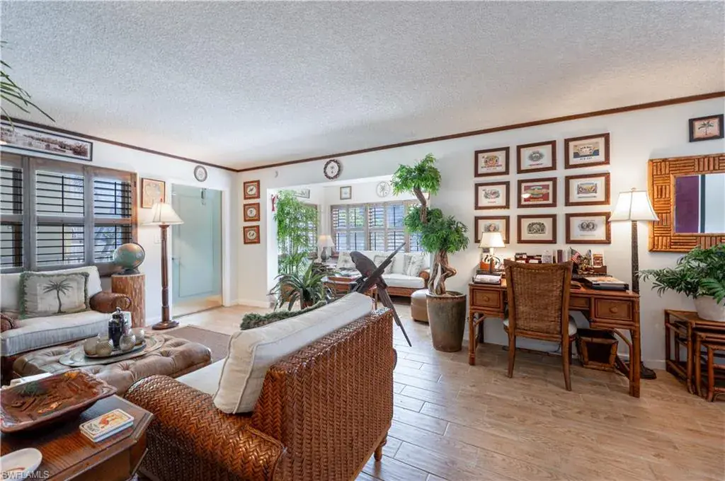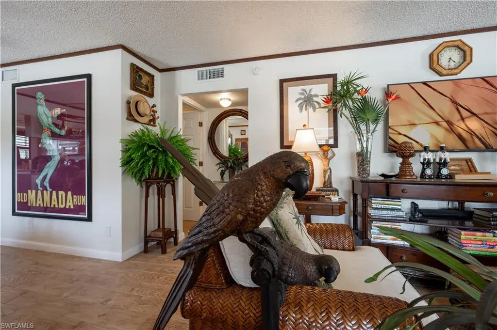 A truly unique tropical getaway or investment opportunity! MOTIVATED SELLER. Enjoy the turnkey comforts of this exquisite Key West inspired 2nd floor condo. Common elevator or stairway accessibility. This corner end unit, one of the larger apartments in this complex, is drenched with natural light filtered by wood plantation shutters. The elegant interior designed space features Tommy Bahama and Ralph Lauren furniture, antiques, tasteful tile flooring enhanced with area carpets, and showcases beautifully framed art in every room. Collections depicting