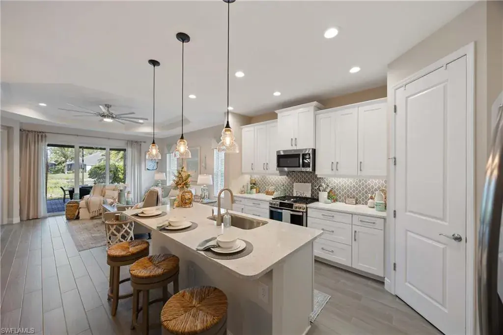At the heart of the home lies a stunning kitchen, where culinary dreams come to life—complete with stainless steel appliances, quartz countertops, and a beautiful backsplash that enhances the space’s sleek design. Step outside to the expansive lanai, an outdoor oasis ideal for alfresco living at its finest. Whether you’re enjoying your morning coffee, entertaining guests, or simply basking in the Florida sunshine, this inviting space provides the perfect backdrop for year-round enjoyment.