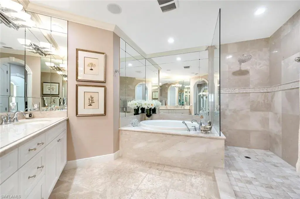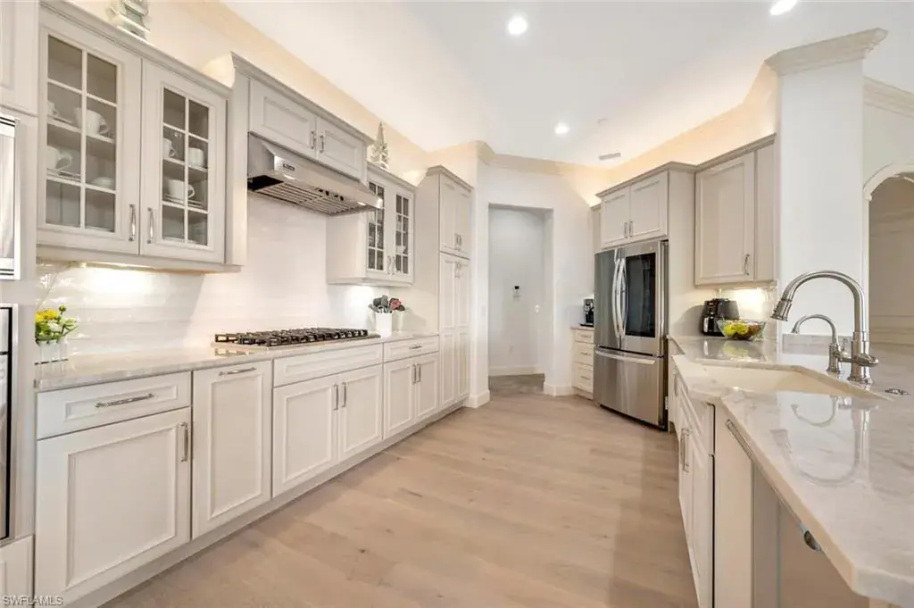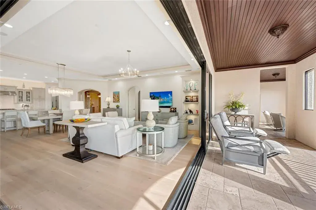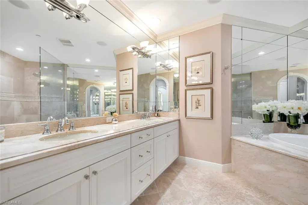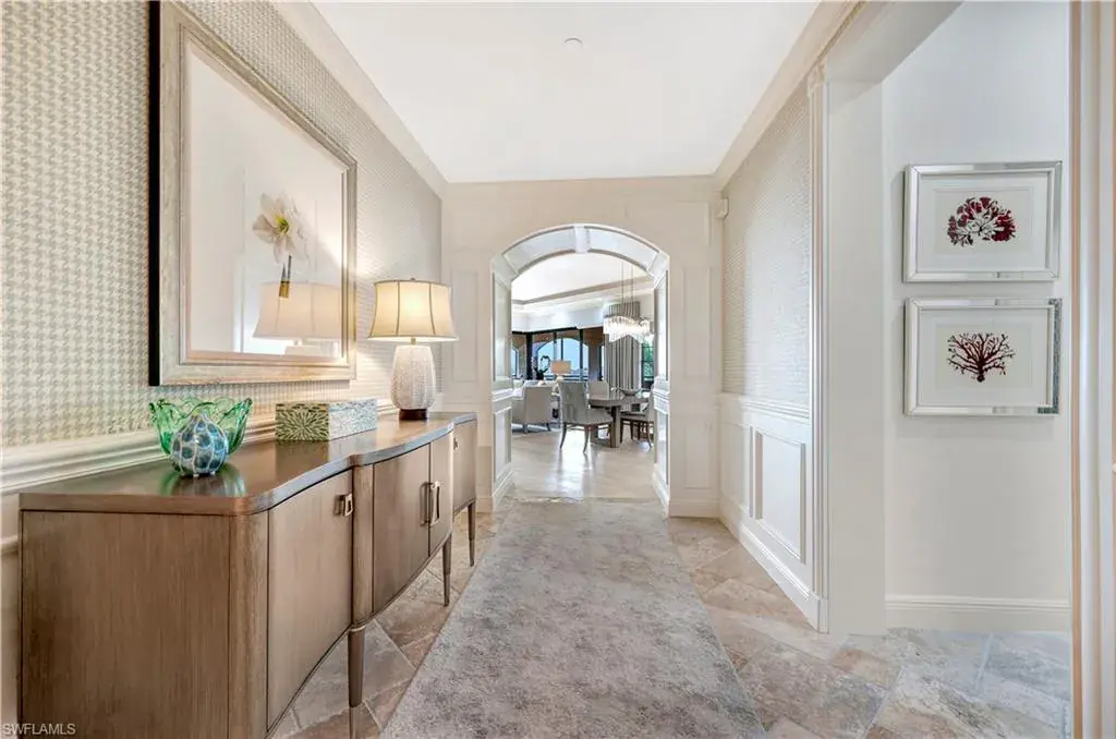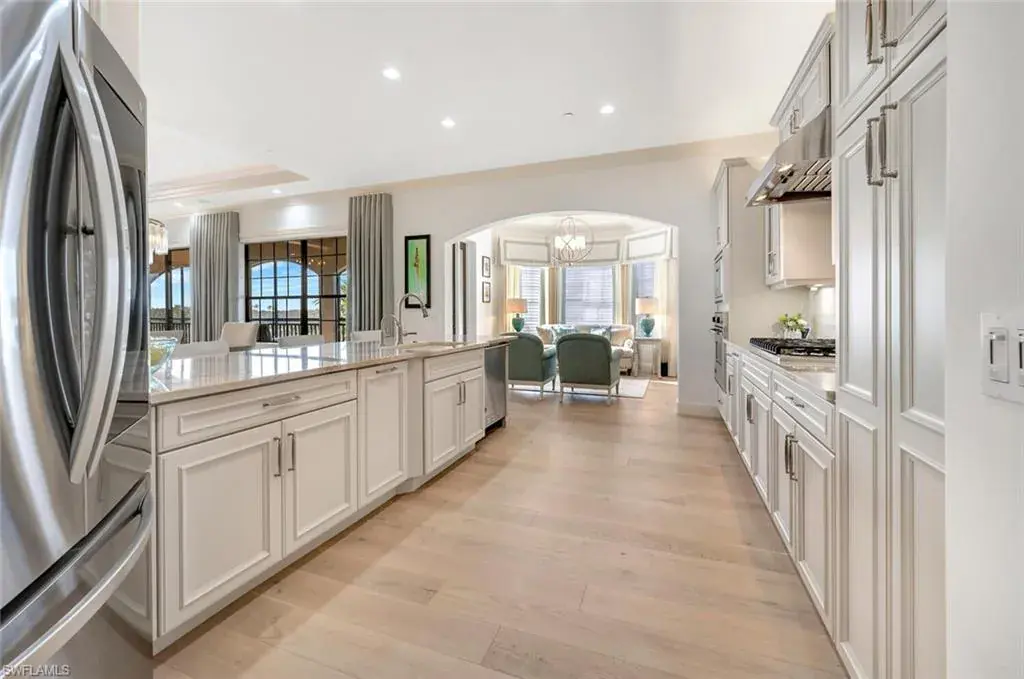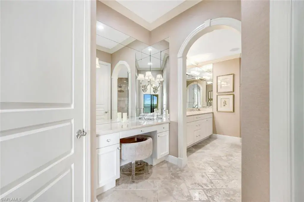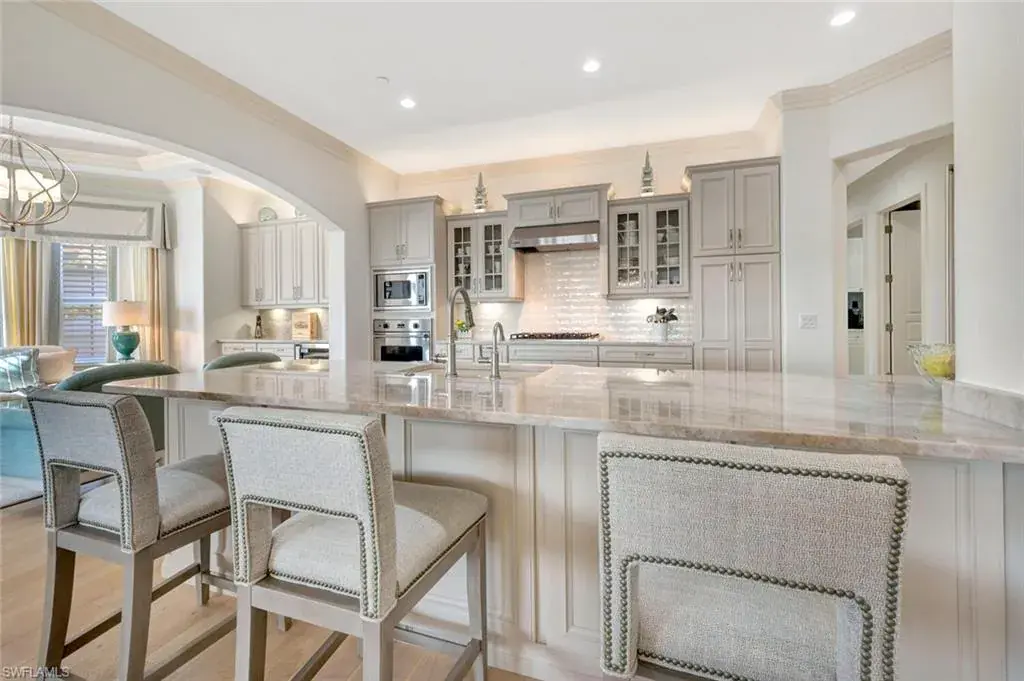 IMMEDIATE GOLF MEMBERSHIP AVAILABLE–Absolutely stunning, highly sought after & the largest available top floor remodeled Penthouse in the desirable Marquesa Royale. Just steps to the pool & the RITZ-Carlton Golf Resort in Tiburon. Expansive views of the 18th & 9th fairways, Lakes, water features & the Tiburon golf club & practice range in the distance. Perfect location for sunlight on your balconies both morning & afternoon.. Beautifully renovated to include Belle Ponds collection wood flooring, light kitchen cabinetry with glass doors & lighting both under & above the cabinets, special Perla Venata Quartzite countertops, contemporary lighting fixtures & fresh NEW light furnishings!! The beautiful modern furnishings are available also, if desired… This PH features: 10.6 ft ceilings throughout, Private & secure elevator access, all en-suite bedrooms, Den large enough for a 4th bedroom as it has a closet, built-in desk area, access to a private balcony & to the half bath. The upgrade list continues with 2 spacious screened balconies with Cedar ceiling detail & travertine flooring, Viking 6 burner natural gas cooking with commercial hood, top line stainless appliances, Plantation shutters, speaker system inside & outside, whole home water treatment system, tankless gas water heater, AIR SCRUBBER system for the NEWER AC, incredible trim detail on the doorways, walls & under counter, 2 garage parking spaces plus storage and Tiburon Golf & Social memberships are immediately available!. Medallion Golf membership is 80% REFUNDABLE and price increases January 1st, 2026 .. Details are available.