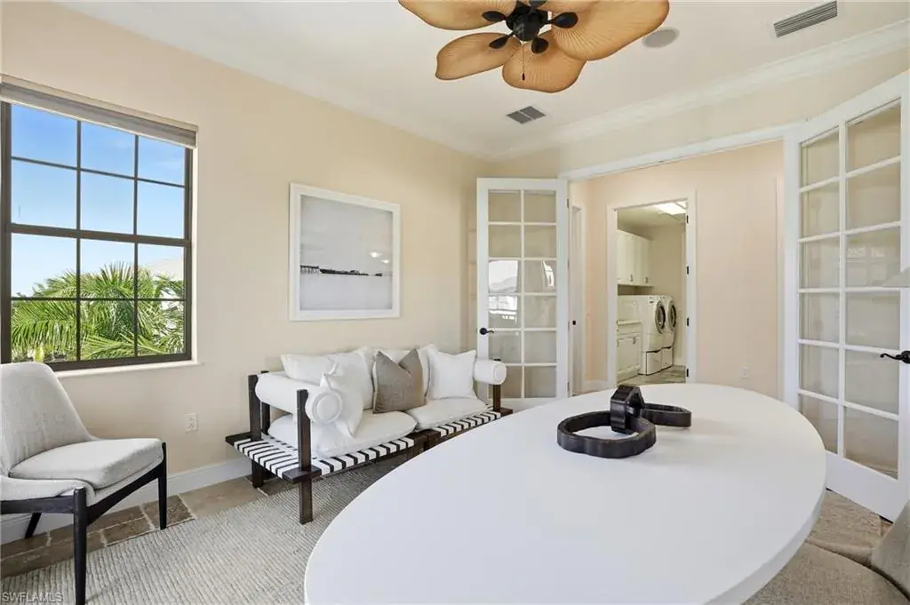 Experience luxury living in this impressive Marquesa Royale penthouse in Tiburon. Situated on the 18th hole of one of two prestigious Greg Norman designed golf courses, this impeccably decorated residence features natural earth tones while offering spacious elegance with breathtaking views. With airy modern design and livable sophistication, key features include 10’5” high ceilings, 2 walls of zero-slider doors that open to an expansive wrap-around lanai, perfect for enjoying the scenic surroundings, lush green views, and Florida sunshine. The versatile 2+den split floor plan includes three full bathrooms where the den can easily serve as a third bedroom, ideal for family and guests. If you like to cook and entertain, you will appreciate the gas cooktop, spacious open kitchen, bar area with wine fridges, and multiple areas to dine and enjoy the views. Convenient elevator access directly to your unit ensures ease of living, while two parking spaces in the garage provide ample, secure parking. Marquesa Royale is a gated, secure community located in Tiburon offering privacy and peace of mind to come and go.