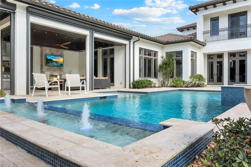 For added convenience, a private one-bedroom, one-bath guest casita can serve as an exercise studio or a comfortable retreat for visitors. The expansive lanai features retractable screens, a cozy fireplace, and an outdoor kitchen, perfect for entertaining. Beautiful travertine flooring graces both the lanai and pool deck, creating an inviting atmosphere for gatherings. Light the fire bowls by the pool and relish in sunset soirées with family and friends.