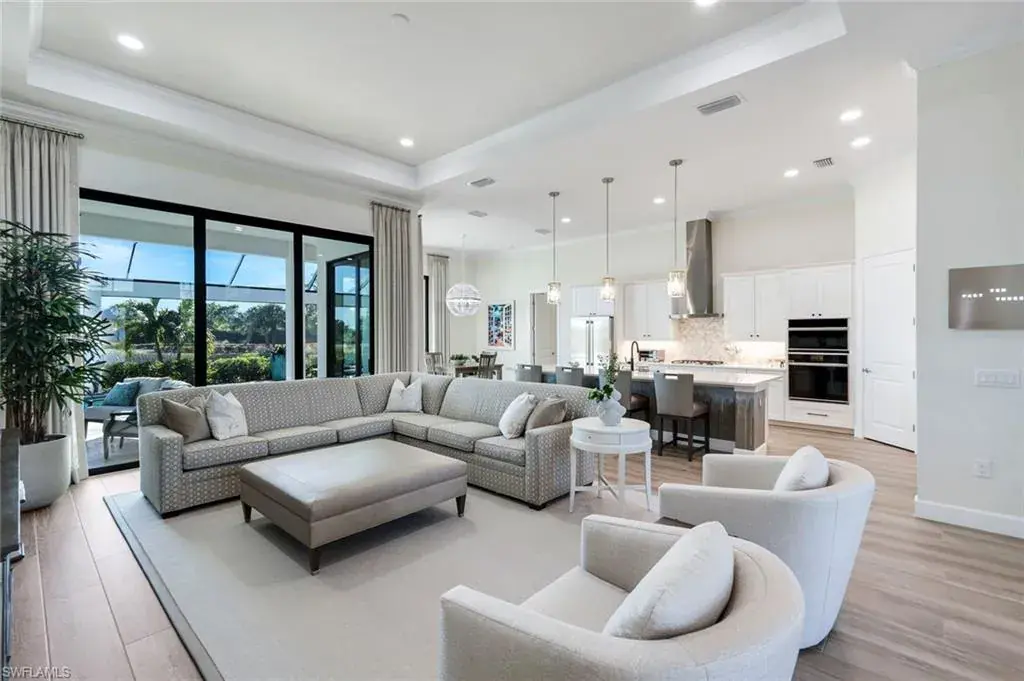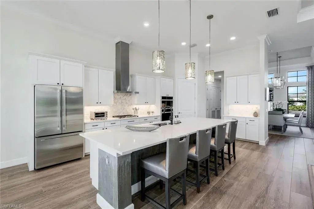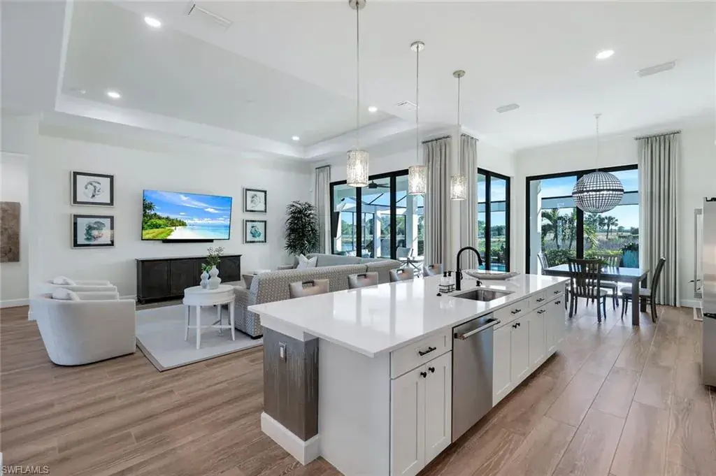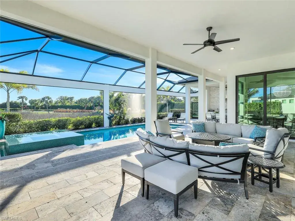 and spa. The colonnade style picture screened lanai, overlooking a lake and expansive green space is walking distance from the brand new spectacular Fiddler’s Creek private Golf Clubhouse and renovated golf course. Become one of the lucky few left with access to membership to this award winning golf club. Like to entertain? Imagine preparing for family and friends in this gourmet kitchen with stainless steel Monogram gas appliances, curated quartz counters and beautiful marble backsplash, oversized and custom painted island, formal and informal dining, outdoor kitchen and more. High end light fixtures with additional flush mounted LED lights throughout. Primary suite, situated away from guest wing, with access to pool and lanai offers the perfect spot to enjoy morning coffee. Primary bath features a large walk in shower and separate luxurious soaking tub. Marvelous light toned, wood like tile throughout, impact doors and windows, custom window treatments, motorized blackout shades in primary bedroom, custom closets, drop zone near laundry room, epoxy floored 3 car garage, plus upgraded fixtures and hardware. Fiddler’s creek is a community like no other with amenities second to none, offering 2 resort pools, 2 restaurants, 54,000 sq foot club and spa, brand new fitness equipment, fitness classes 7 days a week, pickleball, bocce, tennis, and full calendar of social events year round. Private Beach Club and Marina memberships available. Minutes from the white sands of Marco Island and downtown Naples with it’s abundance of restaurants and boutiques, this one is a must see!