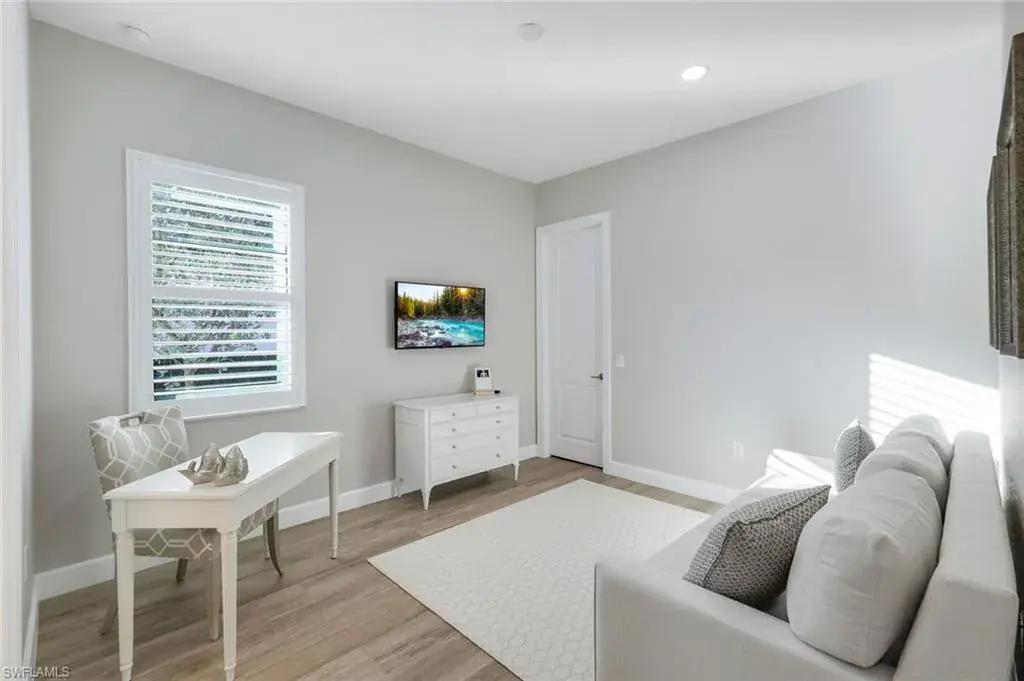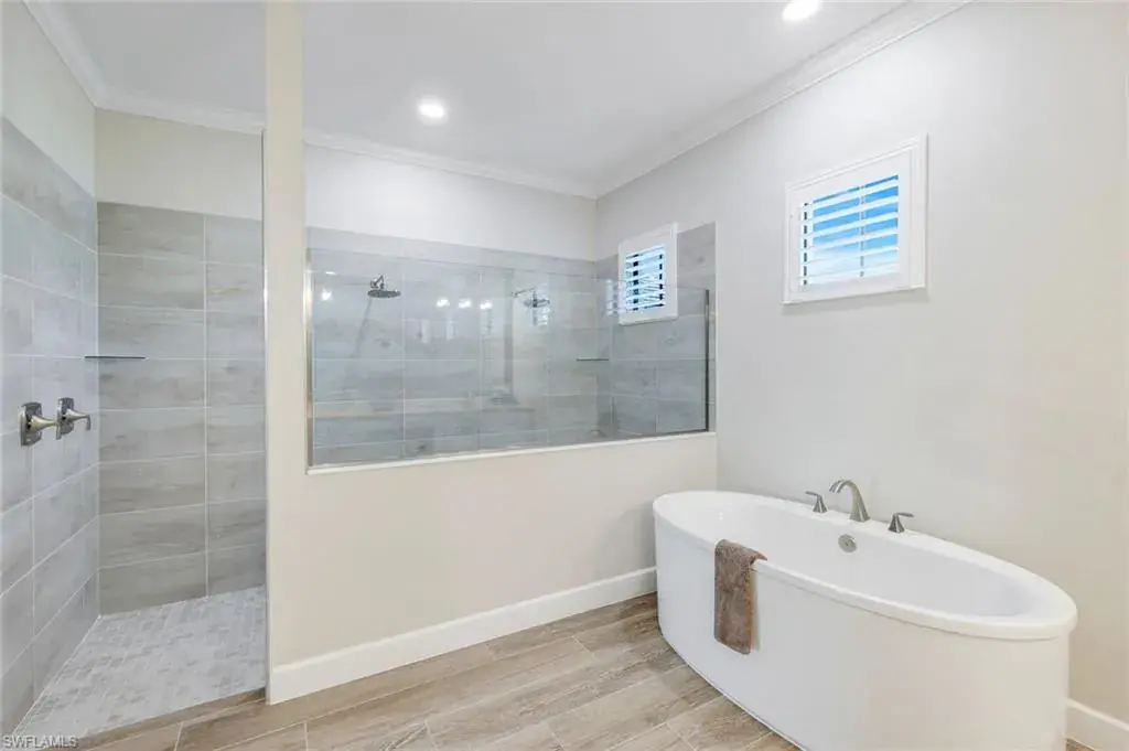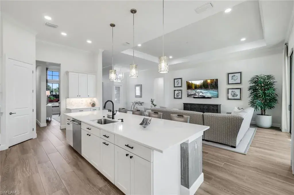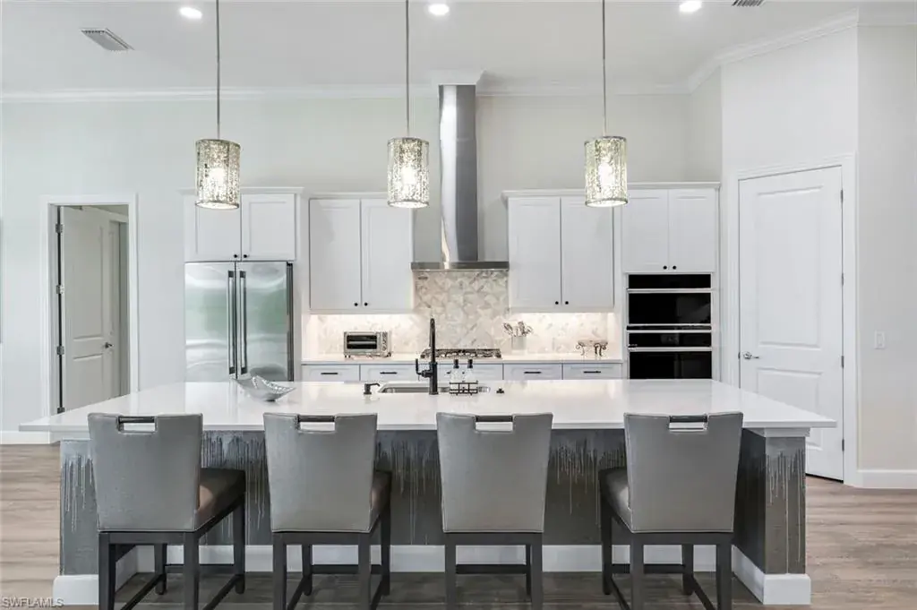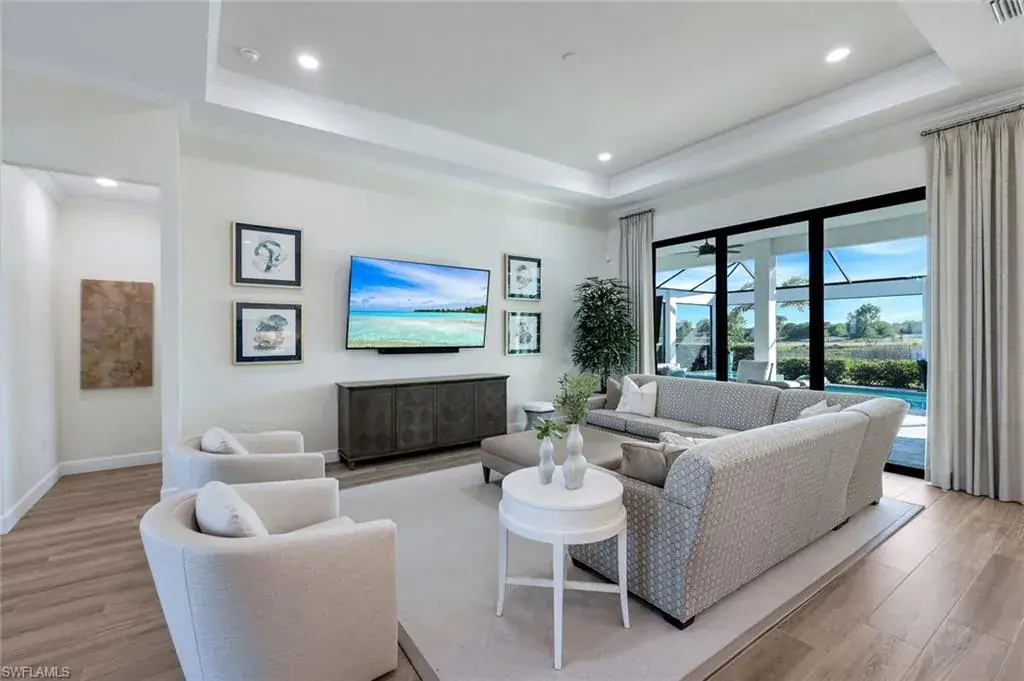 and spa. The colonnade style picture screened lanai, overlooking a lake and expansive green space is walking distance from the brand new spectacular Fiddler’s Creek private Golf Clubhouse and renovated golf course. Become one of the lucky few left with access to membership to this award winning golf club. Like to entertain? Imagine preparing for family and friends in this gourmet kitchen with stainless steel Monogram gas appliances, curated quartz counters and beautiful marble backsplash, oversized and custom painted island, formal and informal dining, outdoor kitchen and more. High end light fixtures with additional flush mounted LED lights throughout. Primary suite, situated away from guest wing, with access to pool and lanai offers the perfect spot to enjoy morning coffee. Primary bath features a large walk in shower and separate luxurious soaking tub. Marvelous light toned, wood like tile throughout, impact doors and windows, custom window treatments, motorized blackout shades in primary bedroom, custom closets, drop zone near laundry room, epoxy floored 3 car garage, plus upgraded fixtures and hardware. Fiddler’s creek is a community like no other with amenities second to none, offering 2 resort pools, 2 restaurants, 54,000 sq foot club and spa, brand new fitness equipment, fitness classes 7 days a week, pickleball, bocce, tennis, and full calendar of social events year round. Private Beach Club and Marina memberships available. Minutes from the white sands of Marco Island and downtown Naples with it’s abundance of restaurants and boutiques, this one is a must see!