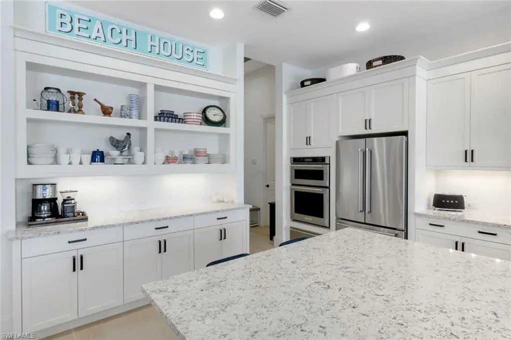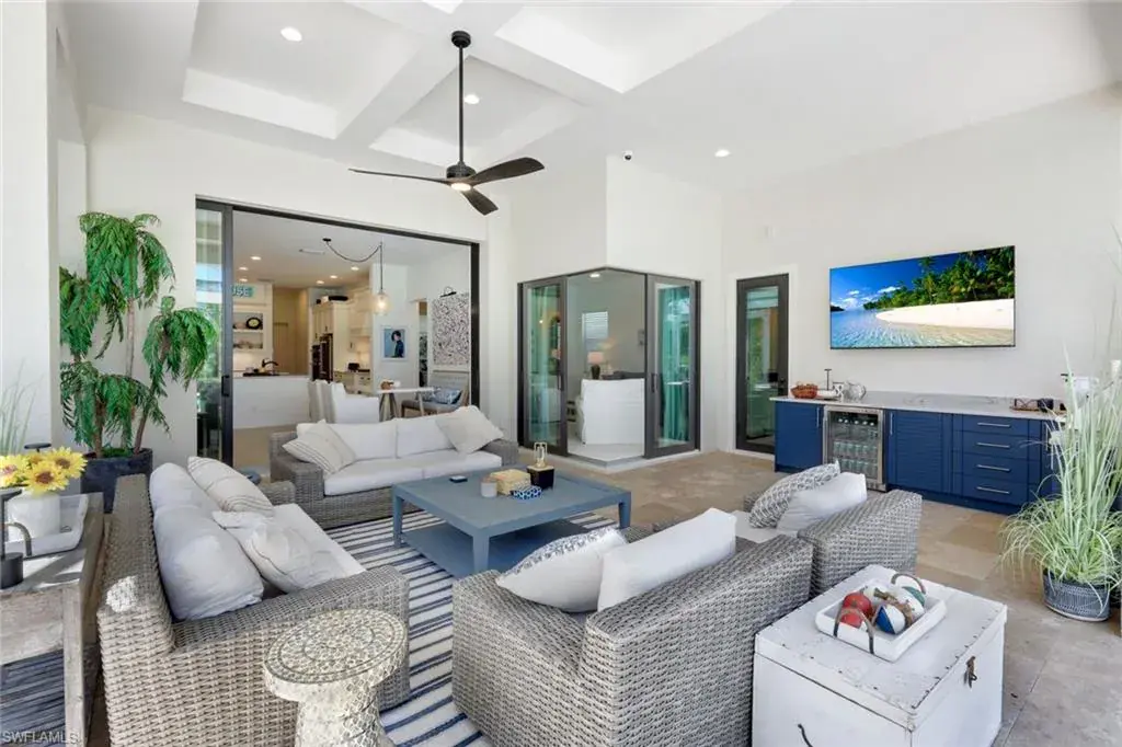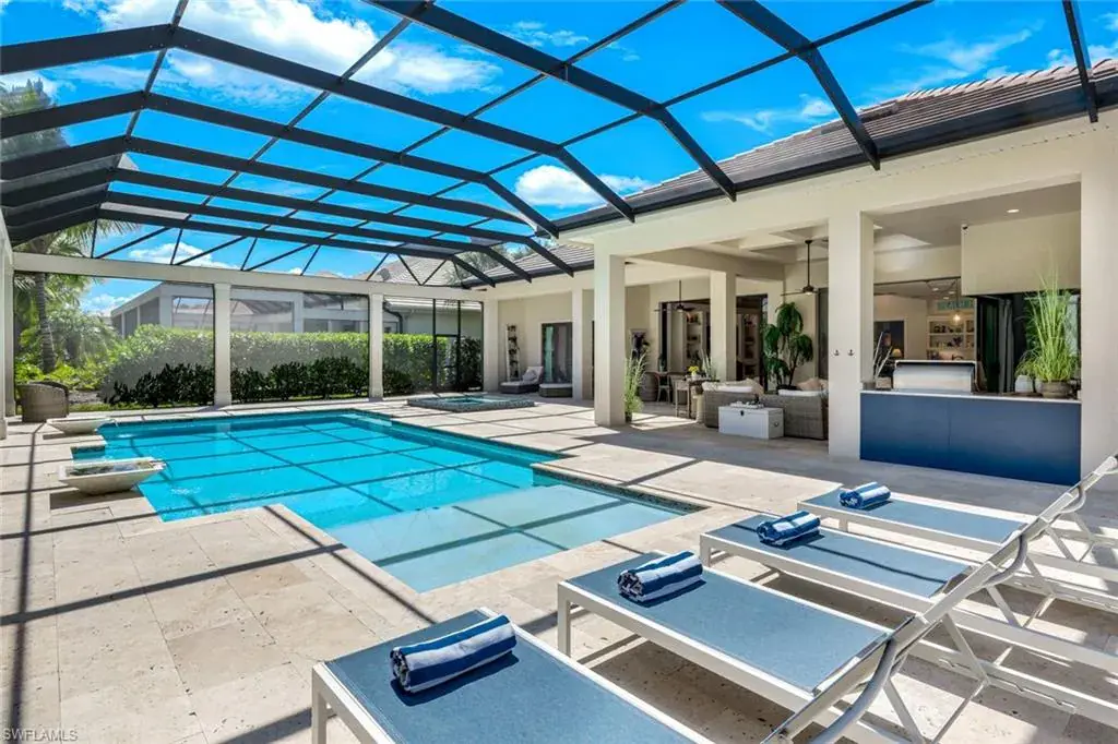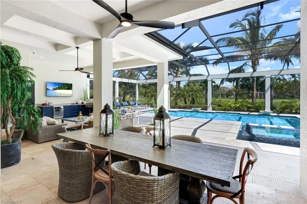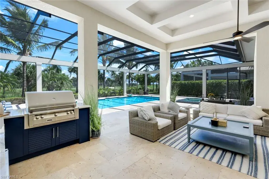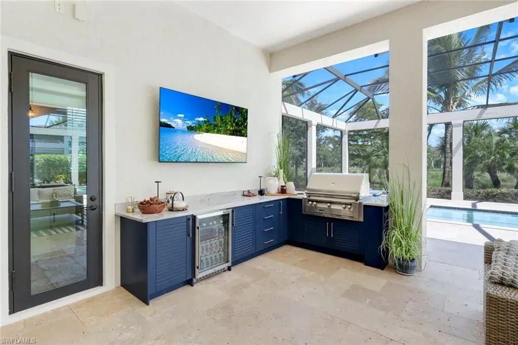 Enjoy Florida’s outdoor lifestyle year-round with the fully equipped summer kitchen, including a built-in alfresco grill and refrigerator.