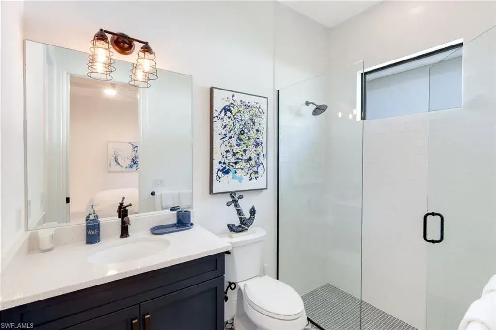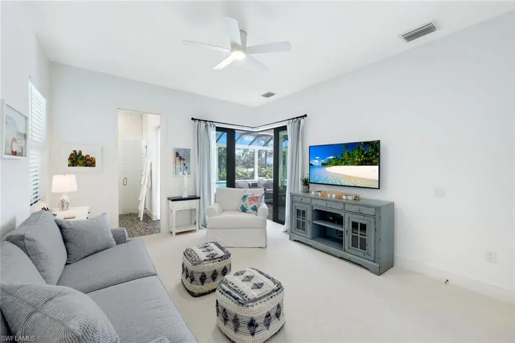 The primary suite is a serene escape, complete with bronze-framed doors to the lanai and a spa-like bathroom adorned with Calacatta Botanica quartz countertops.