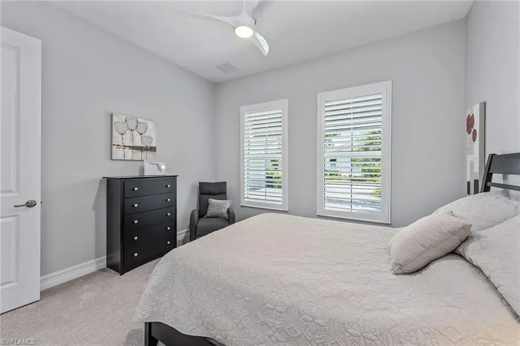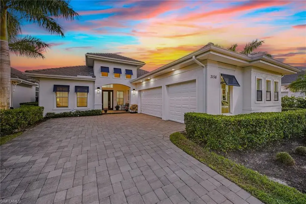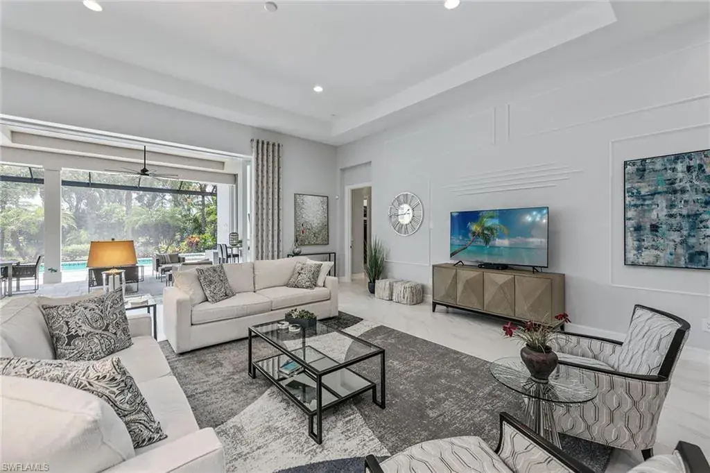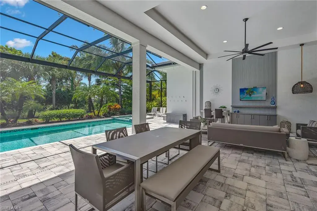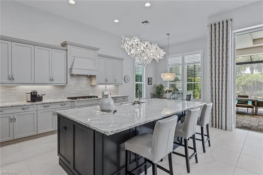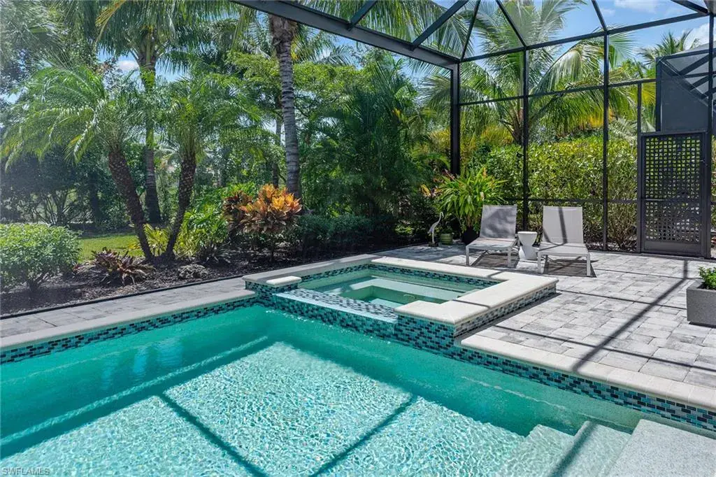 Discover refined living in this Marsh Cove residence by Stock Signature Homes, showcasing the desirable Mayfield III floor plan with five bedrooms (or four bedrooms plus study), three-and-a-half baths, and a three-car garage. Built in 2020, this home is positioned to capture private garden views of lush tropical landscaping, offering a serene backdrop. The residence includes a Generac 22-kilowatt whole-house generator, solar and gas heaters for pool/spa, Pelican carbon series whole-house water filtration system, 50-gallon gas water heater with recirculation pump, StormSmart electric shutters for the lanai, QuietCool attic exhaust fan in the garage, and DAM EASY flood barrier panels. The exterior impresses with impact-resistant doors/ windows, a panoramic screen enclosure and a covered outdoor living area. An inviting summer kitchen boasts a Summerset four-burner grill with rotisserie, Fire Magic stainless steel hood, mini refrigerator and granite counter. A heated saltwater pool/spa with a soothing waterfall feature are framed by lush tropical plantings, creating a private paradise. Inside, porcelain tile floors, recessed volume ceilings, LED lighting and white plantation shutters establish a modern yet timeless ambiance. The open kitchen is a chef’s delight with shaker-style cabinetry, quartz counters, under- and above-cabinet lighting, and a glass tile backsplash. An expansive island with bar seating and a stunning chandelier anchors the space, complemented by a pantry and KitchenAid stainless steel appliances, including a five-burner gas cooktop with hood, wall oven, warming drawer and French door refrigerator. A light-filled breakfast area and formal dining room provide multiple spaces for entertaining. The living room is highlighted by decorator wall accents, a custom bar with quartz countertop, and a KitchenAid wine refrigerator, while sliding doors open seamlessly to the lanai. The owner’s suite is a tranquil retreat with garden views, French doors to the lanai, a transom window, and dual walk-in closets with built-in organizers and custom shelving. The spa-like bath features dual quartz vanities with full-width mirrors, a freestanding tub, and a glass-enclosed walk-in shower with floor-to-ceiling tile and multiple showerheads. Guest accommodations include two bedrooms that share a Jack-and-Jill bath with dual sinks and shower/tub combination, a third guest bedroom with adjacent full bath featuring a walk-in shower, and a fourth guest bedroom arranged as a study with French doors, tray ceiling and closet. A stylish powder bath completes the layout. Additional conveniences include a laundry room with built-in cabinetry, quartz counters and utility sink, as well as an epoxy-finished three-car garage with upgraded lighting. Fiddler’s Creek offers world-class amenities, including dining, resort pools, fitness, tennis, pickleball, spa services and a vibrant social scene, plus optional golf and beach/marina memberships.