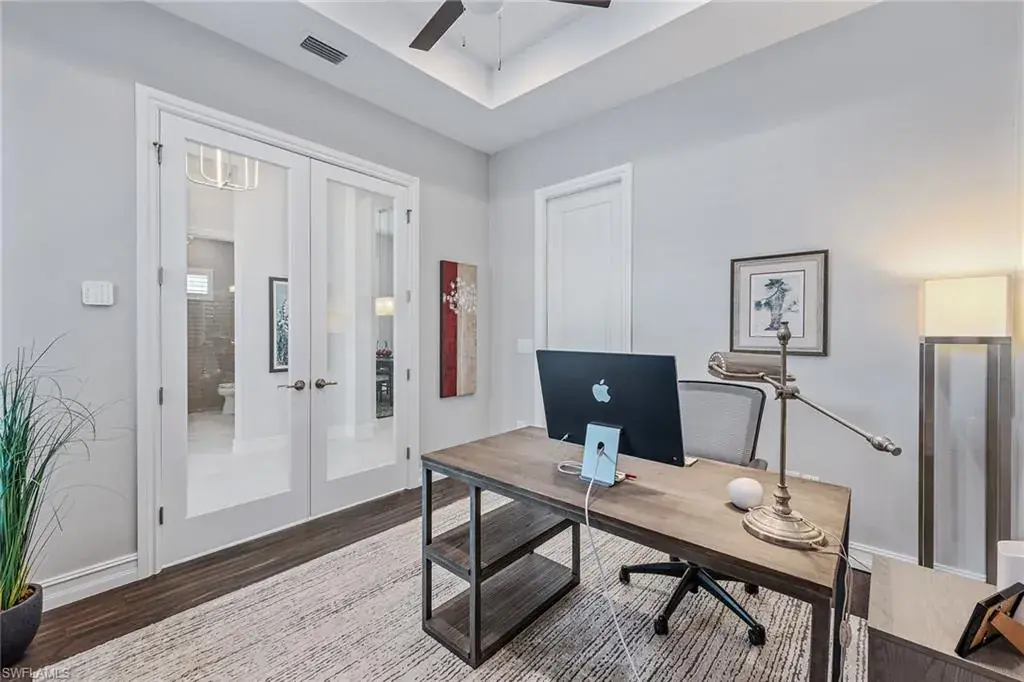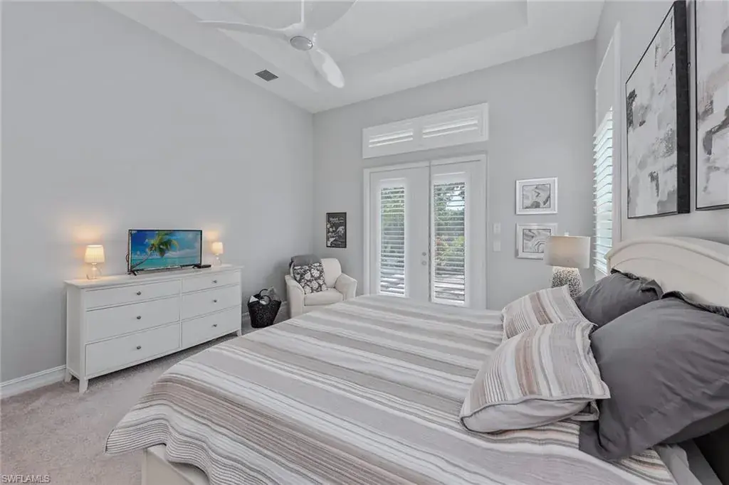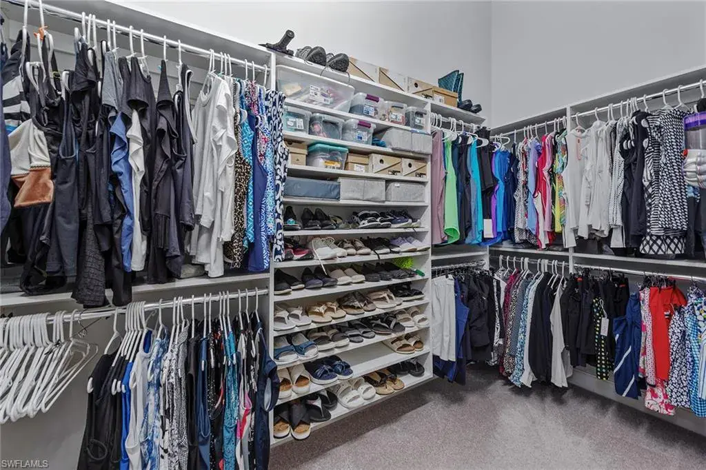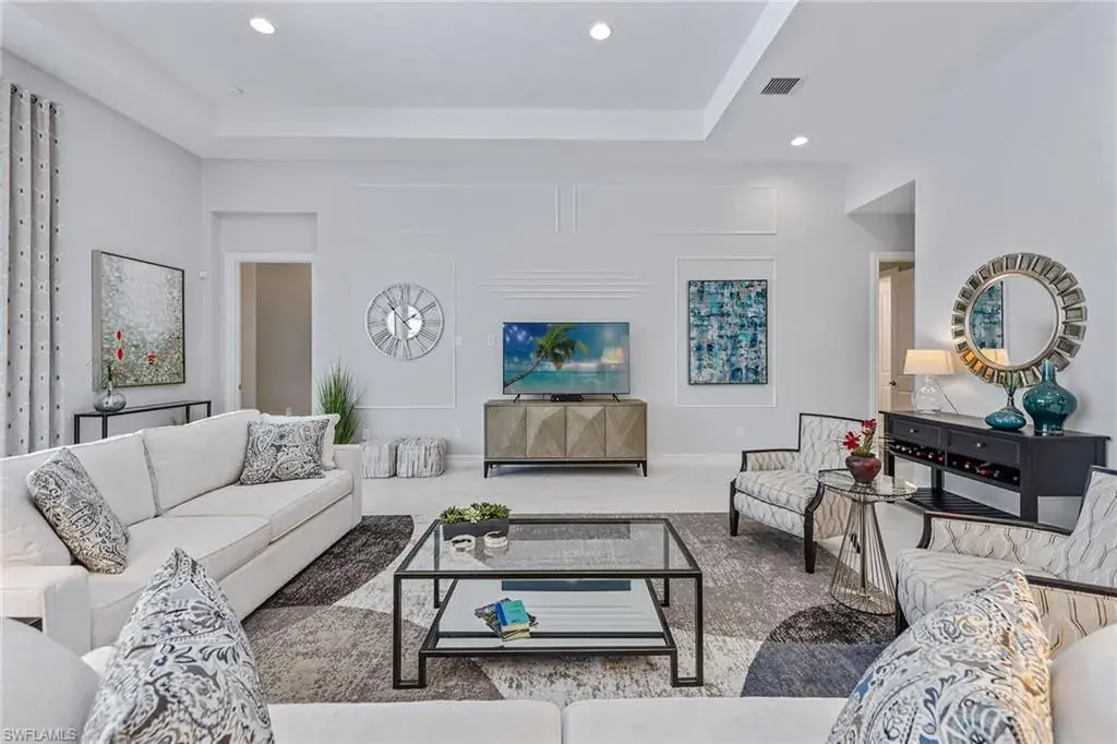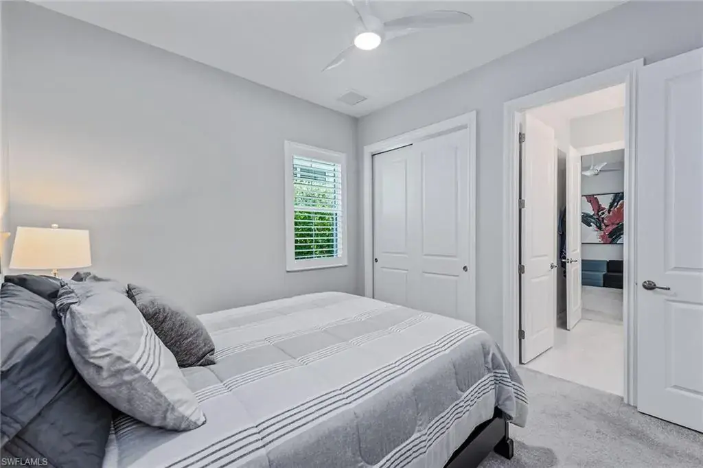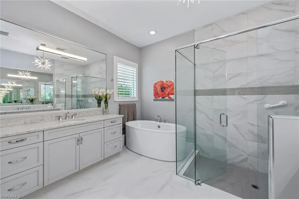 Discover refined living in this Marsh Cove residence by Stock Signature Homes, showcasing the desirable Mayfield III floor plan with five bedrooms (or four bedrooms plus study), three-and-a-half baths, and a three-car garage. Built in 2020, this home is positioned to capture private garden views of lush tropical landscaping, offering a serene backdrop. The residence includes a Generac 22-kilowatt whole-house generator, solar and gas heaters for pool/spa, Pelican carbon series whole-house water filtration system, 50-gallon gas water heater with recirculation pump, StormSmart electric shutters for the lanai, QuietCool attic exhaust fan in the garage, and DAM EASY flood barrier panels. The exterior impresses with impact-resistant doors/ windows, a panoramic screen enclosure and a covered outdoor living area. An inviting summer kitchen boasts a Summerset four-burner grill with rotisserie, Fire Magic stainless steel hood, mini refrigerator and granite counter. A heated saltwater pool/spa with a soothing waterfall feature are framed by lush tropical plantings, creating a private paradise. Inside, porcelain tile floors, recessed volume ceilings, LED lighting and white plantation shutters establish a modern yet timeless ambiance. The open kitchen is a chef’s delight with shaker-style cabinetry, quartz counters, under- and above-cabinet lighting, and a glass tile backsplash. An expansive island with bar seating and a stunning chandelier anchors the space, complemented by a pantry and KitchenAid stainless steel appliances, including a five-burner gas cooktop with hood, wall oven, warming drawer and French door refrigerator. A light-filled breakfast area and formal dining room provide multiple spaces for entertaining. The living room is highlighted by decorator wall accents, a custom bar with quartz countertop, and a KitchenAid wine refrigerator, while sliding doors open seamlessly to the lanai. The owner’s suite is a tranquil retreat with garden views, French doors to the lanai, a transom window, and dual walk-in closets with built-in organizers and custom shelving. The spa-like bath features dual quartz vanities with full-width mirrors, a freestanding tub, and a glass-enclosed walk-in shower with floor-to-ceiling tile and multiple showerheads. Guest accommodations include two bedrooms that share a Jack-and-Jill bath with dual sinks and shower/tub combination, a third guest bedroom with adjacent full bath featuring a walk-in shower, and a fourth guest bedroom arranged as a study with French doors, tray ceiling and closet. A stylish powder bath completes the layout. Additional conveniences include a laundry room with built-in cabinetry, quartz counters and utility sink, as well as an epoxy-finished three-car garage with upgraded lighting. Fiddler’s Creek offers world-class amenities, including dining, resort pools, fitness, tennis, pickleball, spa services and a vibrant social scene, plus optional golf and beach/marina memberships.