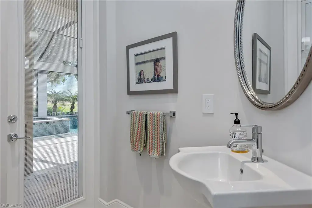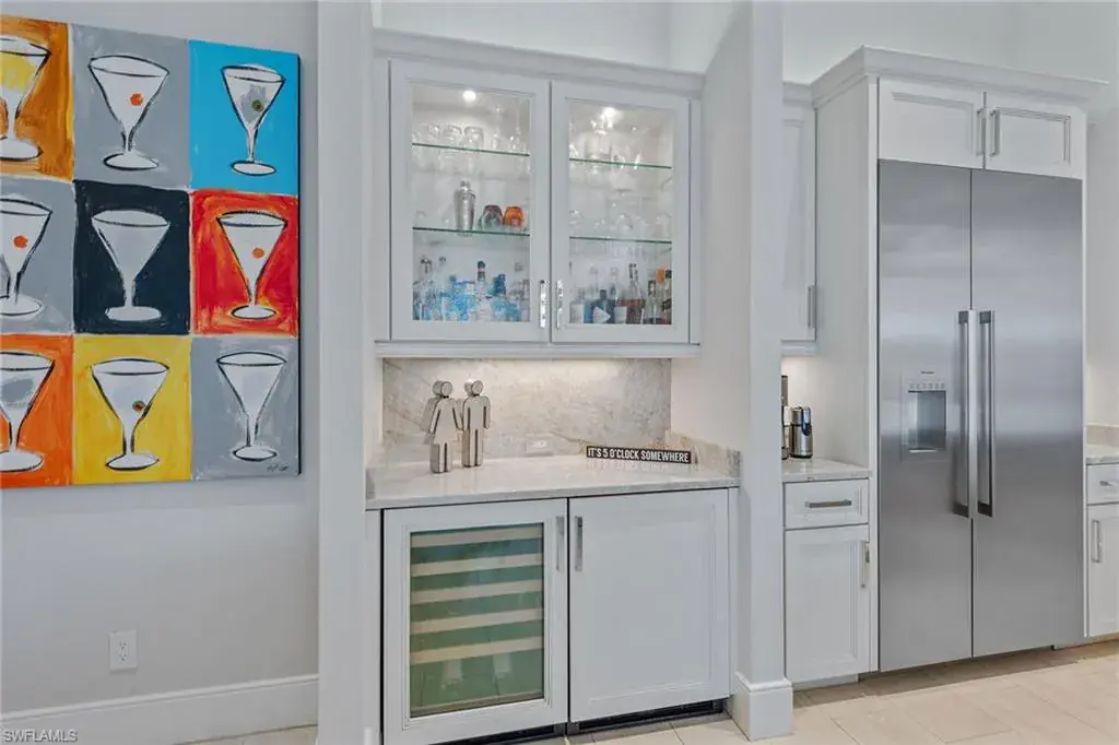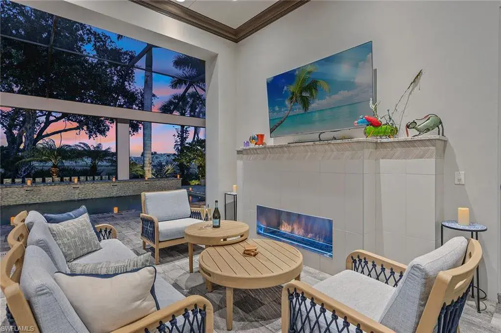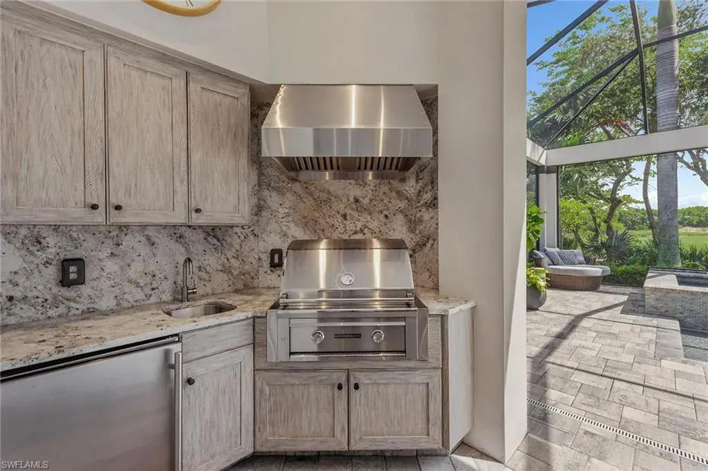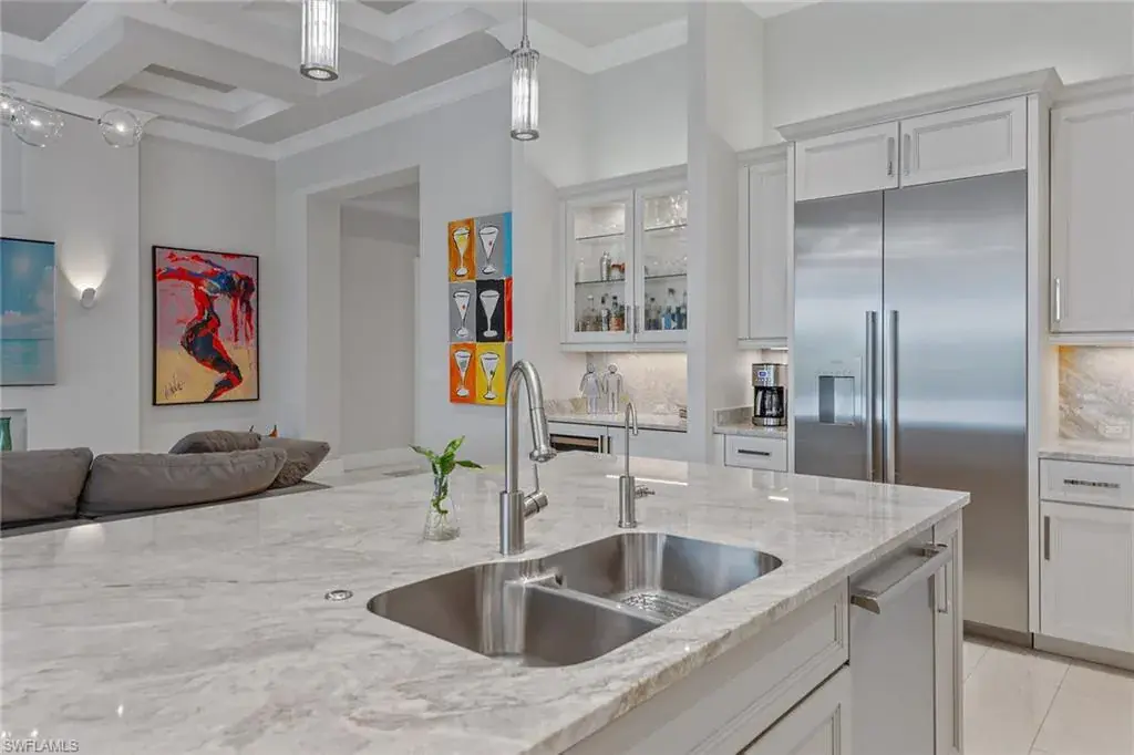 Overlooking the scenic first fairway of the newly renovated Arthur Hills-designed Creek Course, this quality-built residence by regarded Harbourside Custom Homes in the sought-after Marsh Cove neighborhood, blends luxury with serene golf views and indoor-outdoor living. This modern residence offers an impressive double-door entrance, four bedrooms plus a study, 3.5 baths and a spacious two-car garage. The outdoor area is a private retreat featuring a picture-frame screen enclosure, sparkling pool and spa with waterfalls and sun shelf, electric rolldown hurricane screen and a pool bath. The covered lanai boasts a gas fireplace, LED lighting, dual ceiling fans, in-ceiling speakers, wood ceiling, outdoor shower, and a fully equipped outdoor kitchen with Sedona grill, granite surfaces, custom cabinetry, sink and mini refrigerator, ideal for entertaining. Impact-resistant doors and windows, along with a whole-house Generac generator, provide added peace of mind and reliable protection in any weather. Inside, elegant finishes and extensive upgrades include dramatic volume and tray ceilings, crown molding, porcelain tile floors, exquisite lighting, recessed LED lights, Kinetico reverse osmosis system and plantation shutters in a fantastic split-bedroom floor plan. The chef’s kitchen shines with quartzite countertops and backsplash, Mouser cabinetry, Thermador appliances, a built-in side-by-side refrigerator, convection wall oven, five-burner natural gas cooktop with hood and second convection oven beneath, and under-cabinet lighting. A walk-in pantry adds storage. The dry bar includes a wine refrigerator, beverage refrigerator with icemaker and quartzite counters. The dining area features a chandelier and a mitered glass window. The great room offers wall accents, coffered ceiling, sconce lighting and ceiling speakers, flowing seamlessly to the lanai. The owner’s suite has lanai access, ceiling speakers and fan, two large walk-in closets (one custom-designed), and a spa-like bath with ceiling speakers, soaking tub, dual sinks, full-width mirror and walk-in shower with bench. One guest room includes a private en suite and two share a Jack and Jill bath with quartzite vanities. The den offers a quiet space for a home office, enhanced by in-ceiling speakers. The laundry room includes overhead cabinetry and LG washer/dryer with steam. The garage has a painted floor, windows, overhead storage, 220-volt service, and a mini split air-conditioning system for climate control, ideal for a workshop or EV. Close to the new golf clubhouse and all additional Fiddler’s Creek amenities. Residents enjoy lush landscaping, resort-style dining, fitness with trainers and classes, spa services, an active tennis and pickleball program, pools and an extensive activity calendar, with clubhouse renovations underway in 2025. Optional golf, beach and marina memberships available. Great location close to Naples and Marco Island. CDD bond paid in full!