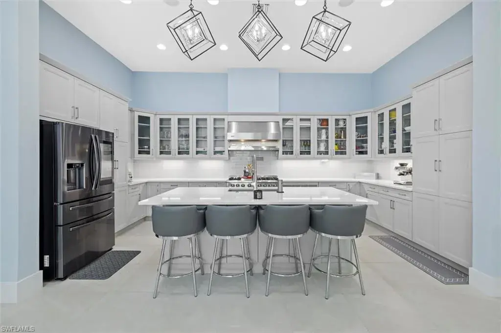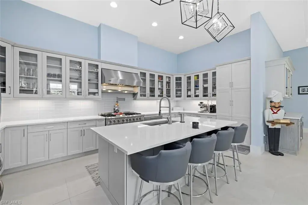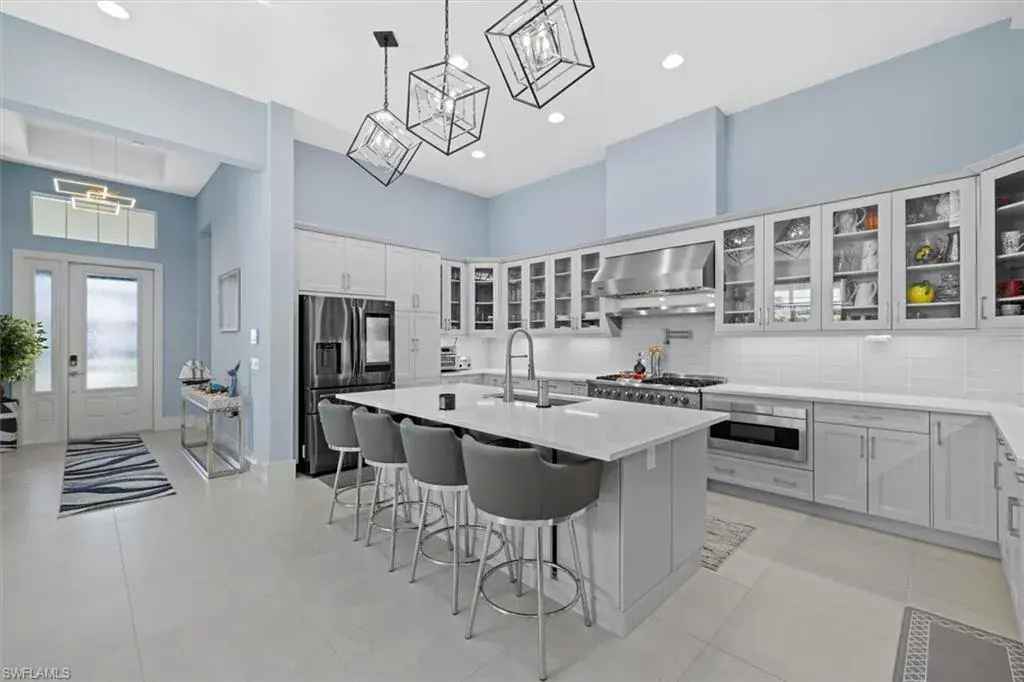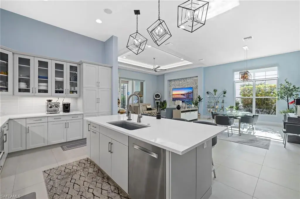 GORGEOUS newer home, 3 bedrooms plus den Cambria model with many upgrades. Gorgeous outdoor lanai with large pool featuring a sun shelf for lounging. Inside the home is a large open kitchen/dining/living space with a chef’s style kitchen featuring a 48″ Thor gas stove top with double ovens and a red-light warming shelf. Alongside the kitchen and living room is a built-in dry bar with lit shelving and a wine refrigerator; great when entertaining. Throughout the living area and master are custom tray ceilings with Cove accent lighting and surround sound including the lanai. Each room has custom Smart blinds and the closets are completed with custom California closets. Relax in the master bath heated and bubbling aromatherapy spa tub. The layout of the home is perfect while having guests in the front guest bedrooms and the master bedroom in the back of the home overlooking the lanai. The large, covered lanai is a perfect spot for sitting by the fire and cooking on the gas grill at the outdoor kitchen area.This home has a full-house generator and Kinetico water system. All systems in the home are seamlessly digitally controlled for your convenience and peace of mind. The community is about 4,000 acres within the gates providing a full-service clubhouse with resort style pool, dining, fitness, spa, tennis, pickleball, bocce and a playground. Tarpon Beach Club and Marina are available for optional membership to Fiddler ‘s Creek residents only. Fiddler’s Creek Golf Club has optional membership. Fiddler’s Creek is conveniently located to nearby Marco Island and downtown Naples.