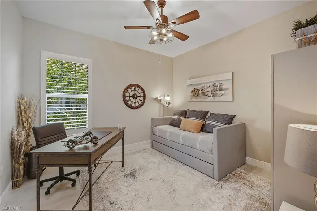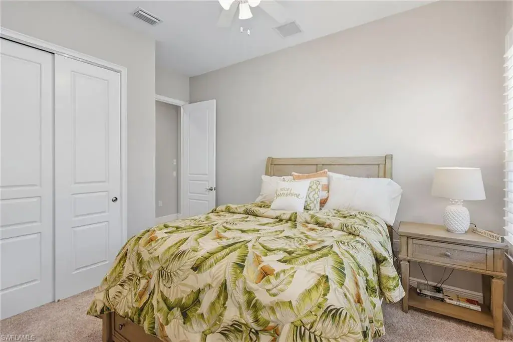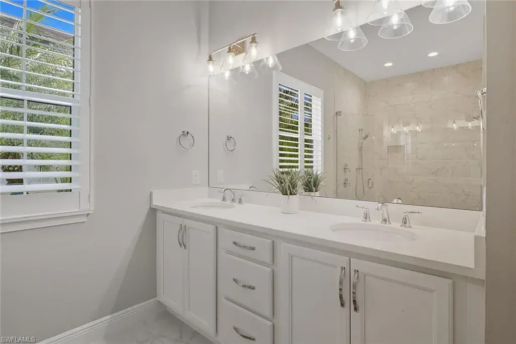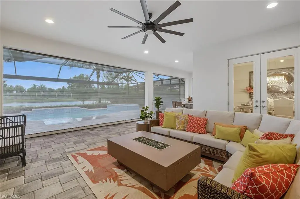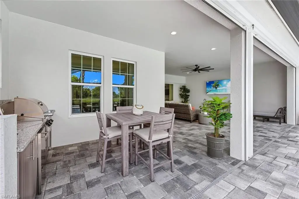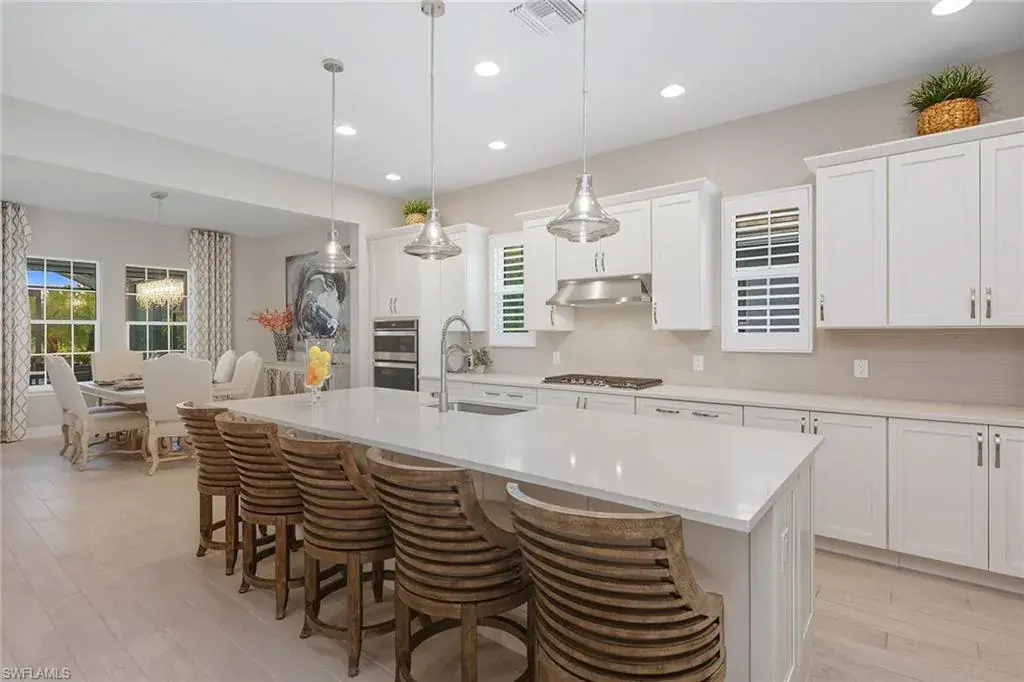 This stunning and beautifully furnished residence in the sought-after Marsh Cove enclave of Fiddler’s Creek showcases the Avila II floor plan, designed to maximize lakefront living with private wide water views. Built in 2020, this three-bedroom plus den, three-bath home with a three-car garage blends timeless elegance with modern comfort, offering a light-filled interior and seamless indoor-outdoor living. The exterior boasts a wide brick paver driveway, elegant tile roof, and full storm protection with impact glass and StormSmart electric shutters on the lanai. The expansive outdoor living area is a true retreat, complete with a picture frame screen enclosure, recessed lighting, a ceiling fan, and a summer kitchen featuring granite counters and backsplash, a FireMagic built-in two-burner gas grill, Zephyr stainless steel beverage refrigerator and a sink. The sparkling pool and spa with a sun deck and water feature overlook tranquil lake views, surrounded by a pavered lanai perfect for entertaining. Inside, the home impresses with 5-by-35-inch wood-grain porcelain tile, recessed lighting, white plantation shutters and custom drapery. The gourmet kitchen is appointed with white cabinetry, quartz countertops, a tile backsplash, and an island with bar seating beneath pendant lighting. Whirlpool stainless steel appliances include a five-burner gas cooktop, a wall oven, a built-in microwave, a hood and a dishwasher. A walk-in pantry provides ample storage, while the formal dining area is framed by large windows and French doors to the lanai. The living room features a recessed tray ceiling and sliding glass doors for effortless lake views. The owner’s suite is a private sanctuary with a tray ceiling, a walk-in closet with custom built-ins, and serene water views. Its spa-inspired bath offers dual quartz vanities, a linen closet, and a walk-in shower with multiple shower heads, a frameless glass enclosure and floor-to-ceiling tile. Two guest bedrooms each include custom closet organizers and ceiling fans, with one offering an en-suite bath and the other adjacent to a full bath. A versatile den provides space for a home office or study, while the laundry is equipped with a GE front-load washer and dryer. The three-car garage features epoxy-coated floors and windows for natural light. As a resident of Fiddler’s Creek, you’ll enjoy world-class amenities, including a 54,000-square-foot club and spa with resort-style pools, fine and casual pool-side dining, a well-appointed fitness center with classes and trainers, active tennis and pickleball programs, bocce and a vibrant social calendar, with exciting renovations underway. Miles of sidewalks for jogging, bicycling and walking. Optional memberships are available for The Tarpon Club with beach and marina privileges and The Golf Club with its renovated course and brand-new clubhouse. Ideally located minutes from Marco Island and downtown Naples, this home offers the very best of Florida’s resort lifestyle.