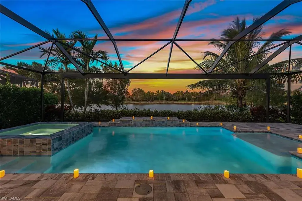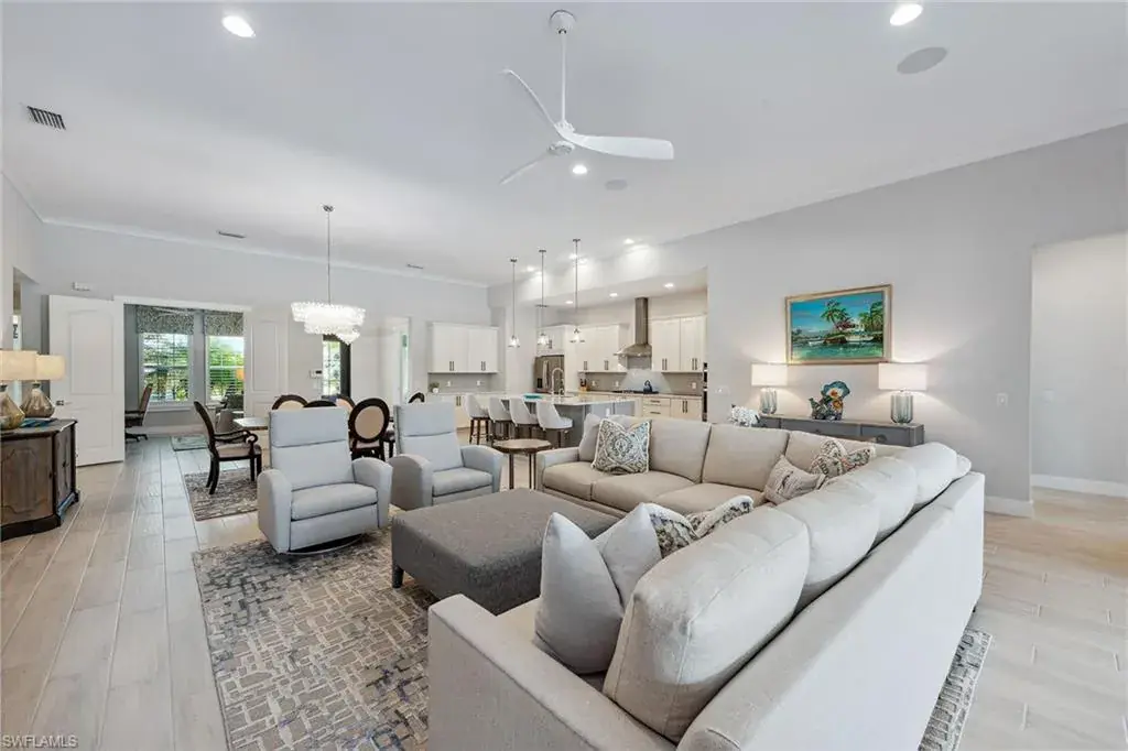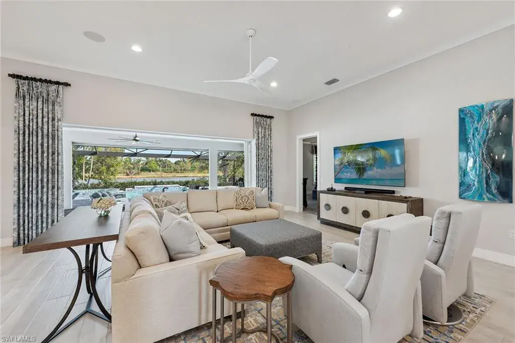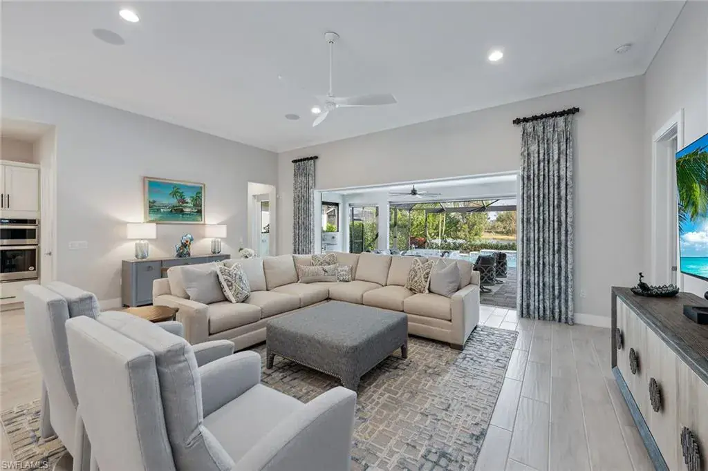 Included in the price of this home is a rare opportunity to enjoy a highly sought-after full golf membership at the Members Club, including access to two high-quality golf courses – the Rookery and Hammock Bay. The buyer of this residence has a special chance to avoid the long waiting list and become a member immediately upon closing. Membership amenities include access to two beautiful clubhouses and beach access at JW Marriott. This membership is available, but optional at no additional cost. An immaculately maintained and turnkey furnished home in the Marsh Cove neighborhood in Fiddler’s Creek. Built in 2021, this residence offers 2,857 square feet of luxurious living space, featuring four bedrooms plus den, 4.5 baths and a three-car garage. The exterior boasts a tile roof, paver driveway and professional landscaping, enhancing the home’s curb appeal. Enter through the stunning metal glass door into a grand foyer showcasing a tray ceiling with designer chandelier, leading to the open-concept kitchen, dining and living area. The interior showcases 12-foot ceilings, recessed and upgraded lighting, crown molding, plantation shutters and porcelain wood-like tile floors throughout. The gourmet kitchen is complete with gas cooking stainless appliances, white shaker-style cabinets, quartz countertops, a glass tile backsplash, an instant hot faucet, a large center island with seating for four and a walk-in pantry. The adjacent living room is ideal for entertaining, featuring Sonos ceiling speakers and a wide pocketing glass slider that opens seamlessly to the lanai. Step outside to a private oasis overlooking serene lake views, where a large, covered area awaits, complete with an outdoor kitchen featuring a Sedona built-in gas grill and beverage cooler. Enjoy the stunning pool with a spillover spa and sun shelf, all enclosed by a picture window screen enclosure. The owner’s suite offers carpet flooring, a large walk-in closet with built-ins, and an en-suite bath with dual vanities and a frameless glass shower adorned with floor-to-ceiling designer tile walls. Three additional guest bedrooms are generously sized, each with carpet flooring and their own en-suite baths, providing ample space and privacy for family and guests. Additional highlights include a whole-home water softener system, a video security system, electric storm screens and built-in storage cabinets with an epoxy floor in the garage. This home is a gem, offering high-end finishes, exceptional features, and just 15 minutes from downtown Naples and Marco Island. Residents of Fiddler’s Creek enjoy a state-of-the-art fitness center, pickleball, tennis, bocce, casual and fine dining, a resort-style pool, sauna and steam rooms, spa services and an extensive activity calendar. Optional golf memberships are available with no wait, with a new clubhouse and newly renovated championship golf course. Beach and marina memberships are also available.