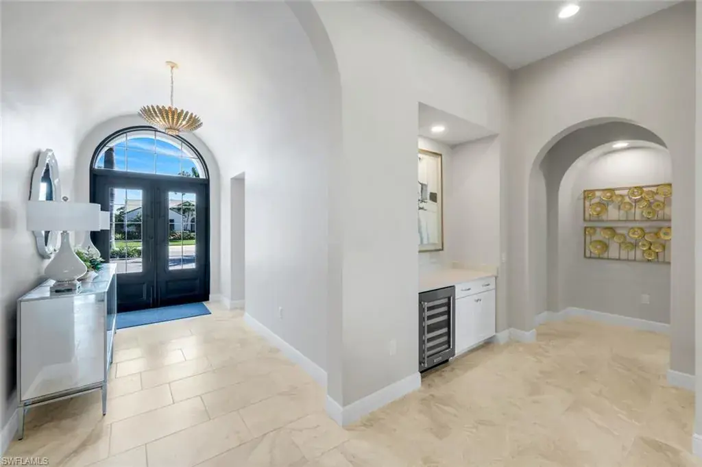 Step through elegant French doors into a light-filled interior highlighted by 14-foot ceilings, a graceful foyer, and striking designer flooring. The spacious great room seamlessly extends outdoors through 10-foot impact glass sliders, revealing a spectacular lanai complete with a resort-style pool and spa, sun shelf, bubblers, and an impressive summer kitchen—perfect for entertaining or quiet relaxation. A wood-accented ceiling adds warmth and architectural character to this inviting outdoor retreat.