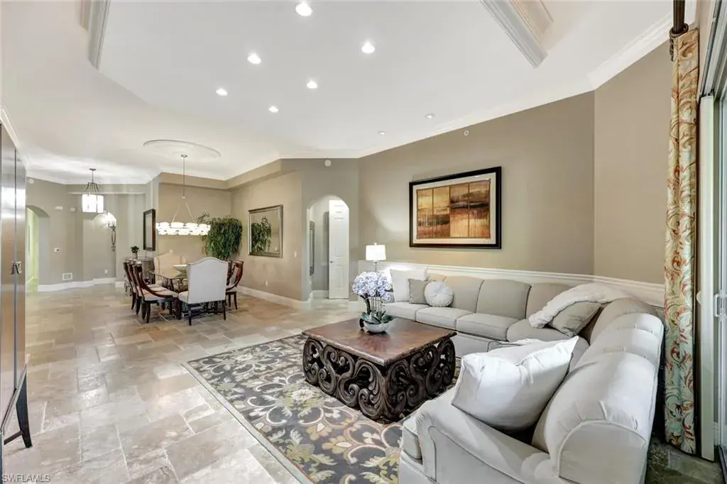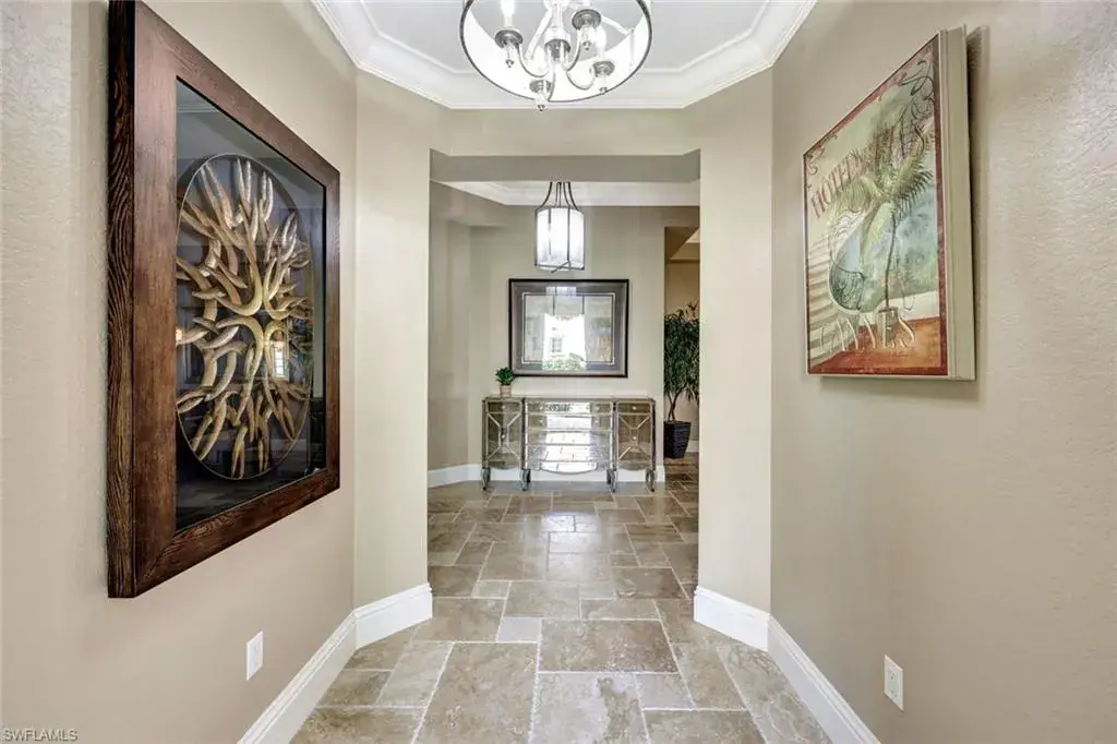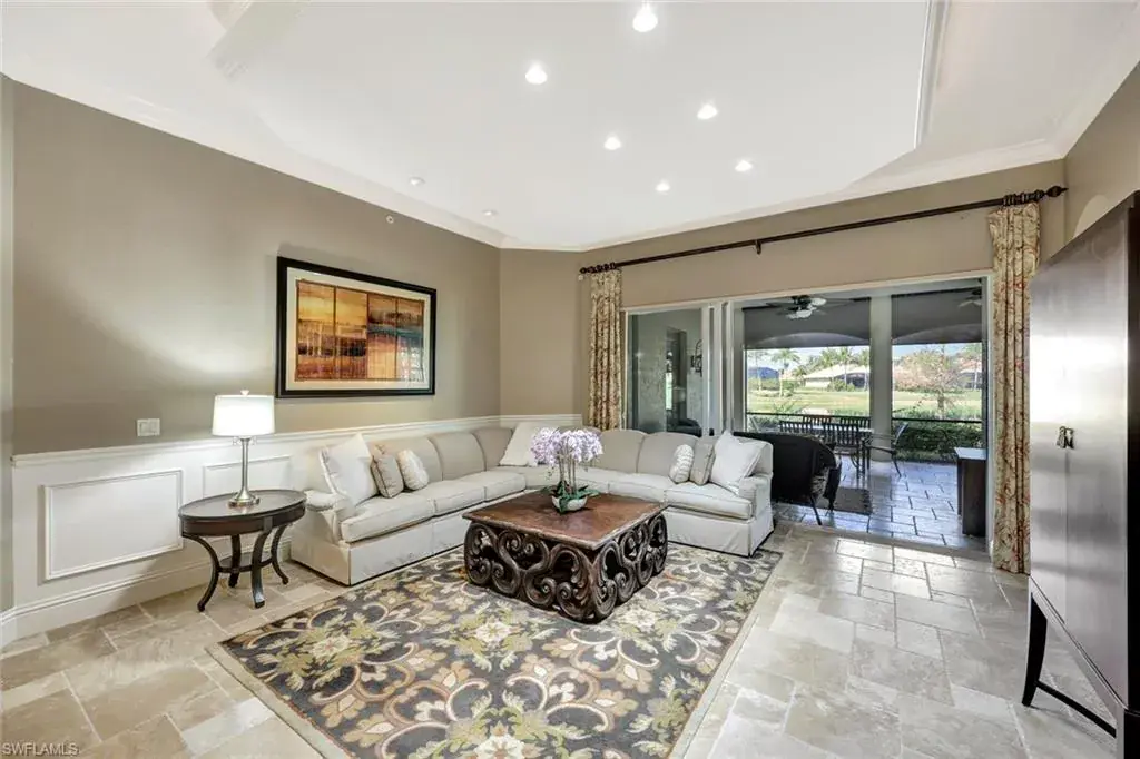 This stunning 3-bedroom plus den, 3-bathroom end-unit in Menaggio offers the epitome of luxury living with gorgeous water views. Boasting just over 2,900 square feet of elegantly furnished space and impeccably maintained, this residence is perfect for both entertaining and relaxing, featuring gorgeous travertine floors, a drop-down accent ceiling, and crown molding throughout. The oversized primary bathroom is a true retreat, complete with a large garden tub, a walk-in shower, and a bidet for added comfort. The spacious primary suite also includes expansive walk-in closets for your convenience. Two additional guest bedrooms with en suite bathrooms ensure privacy for visitors, while the generously sized den offers a versatile space for an office, lounge, or library. Step outside to the private, L-shaped lanai, where you can unwind and enjoy breathtaking water views. The home’s architectural elegance is complemented by a beautifully maintained satellite pool, a private cul-de-sac road, and meticulous landscaping. Menaggio stands out as one of the most prestigious condominium communities within Fiddler’s Creek, offering more square footage than any other first floor condo in the community. The award-winning, resort style community of Fiddler’s Creek is enhanced by a club and spa, fitness center, swimming pools, two golf courses, tennis courts, pickleball courts, a bocce court, fine and casual dining, social activities, and miles of biking and walking paths. Optional beach club and marina memberships are available. Experience the epitome of luxury living, where every detail is thoughtfully curated to complement your lifestyle