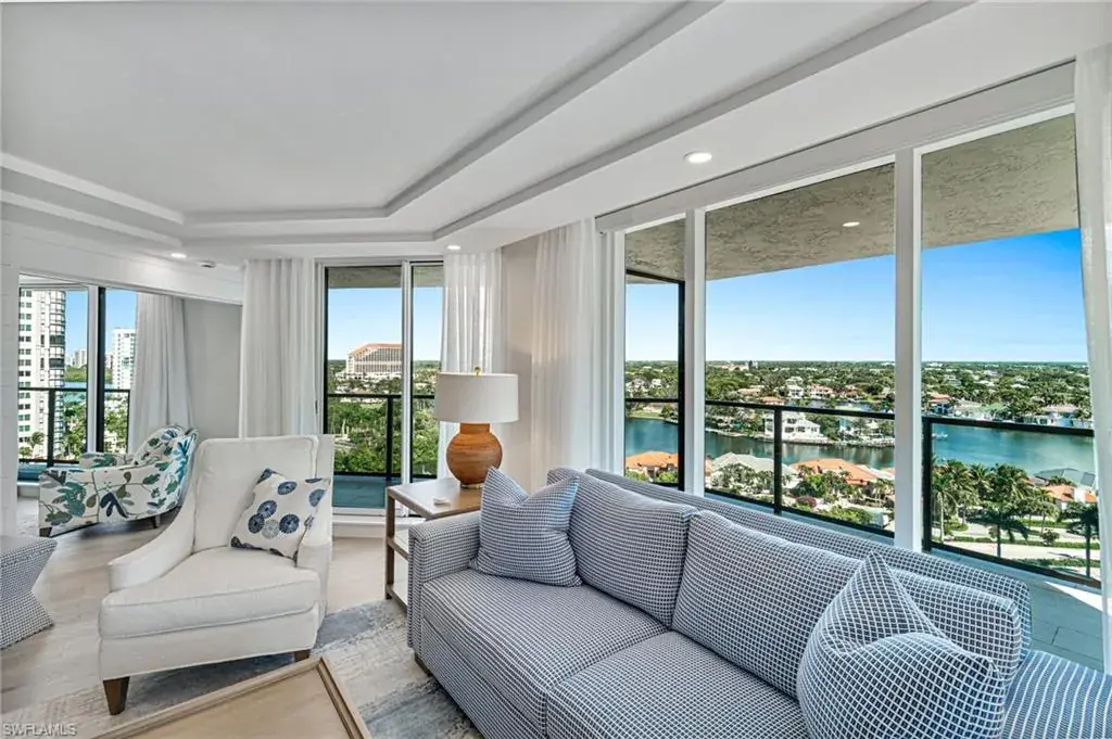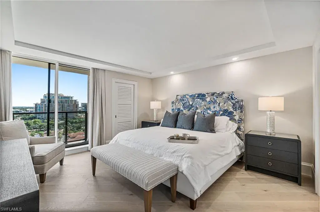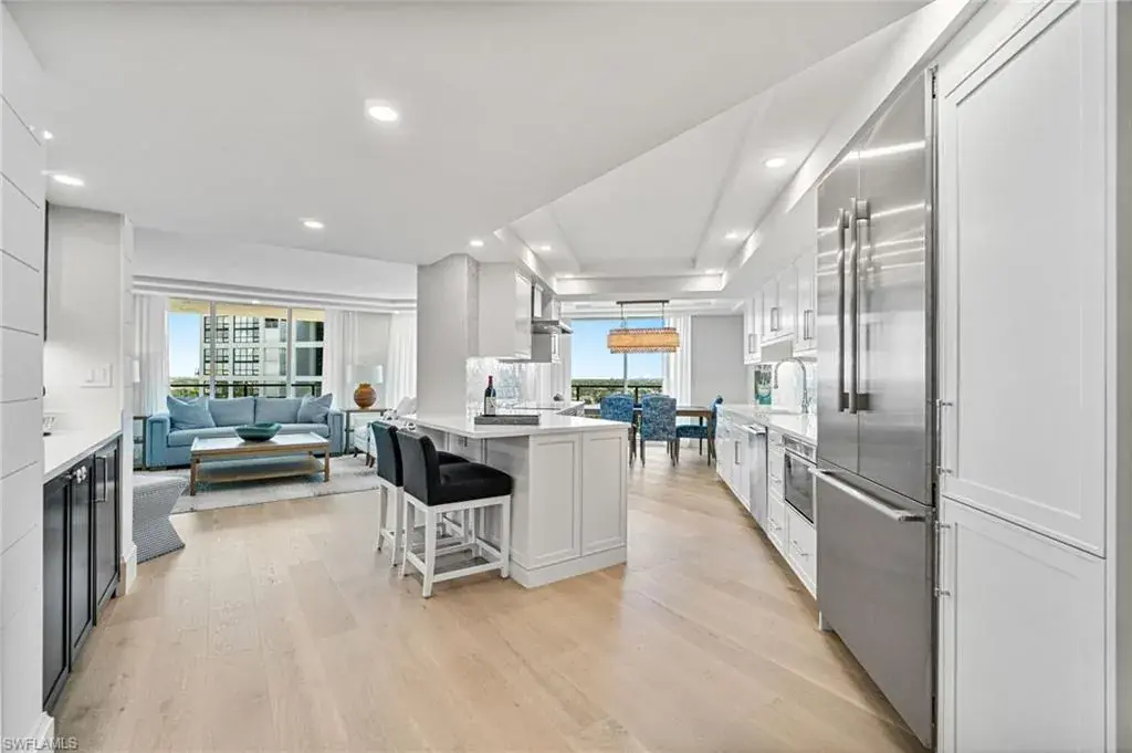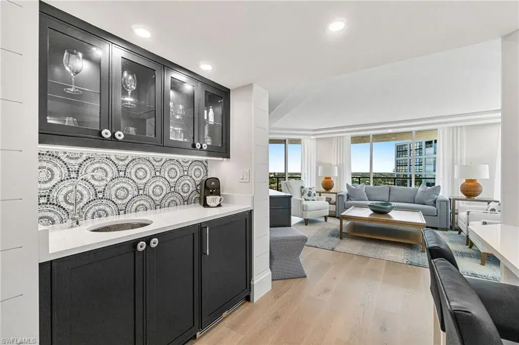 Experience the ultimate in modern coastal living in fully redesigned 3 bedroom, 3 full bath residence at The Meridian Club, one of Park Shore’s most prestigious beachfront addresses. Perched on the 15th floor, this turnkey designer condo offers sweeping views of both Venetian Bay and the Gulf of Mexico — a true Naples retreat for discerning buyers relocating from “up North”. The chef-inspired kitchen is a showpiece, featuring a Thermador appliance package with induction cooktop, built-in drawer microwave, and all stainless steel appliances. Elegant white cabinetry, quartz countertops, a white and gray herringbone backsplash, and high-end fixtures create a clean, coastal aesthetic. A breakfast bar for two adds casual dining space, while the complimenting wet bar with navy cabinetry, glass display, and patterned tile backsplash makes entertaining effortless. Designed by Diane Torrisi Designs and Kevin Steffanni Design Group, the home features wide-plank wood flooring, stepped ceilings, frosted glass and solid doors, and an open, light-filled layout leading to an expansive wraparound balcony with updated glass railings and a glass-enclosed seating area perfect for sunset views. The primary suite is a sanctuary with three custom closets, mirrored doors, and a spa-style bath with multiple shower heads. Two en-suite guest bedrooms offer refined comfort and privacy. High end designer furnishings, electric shades, custom draperies, custom closets and mounted TVs complete this elevated retreat.