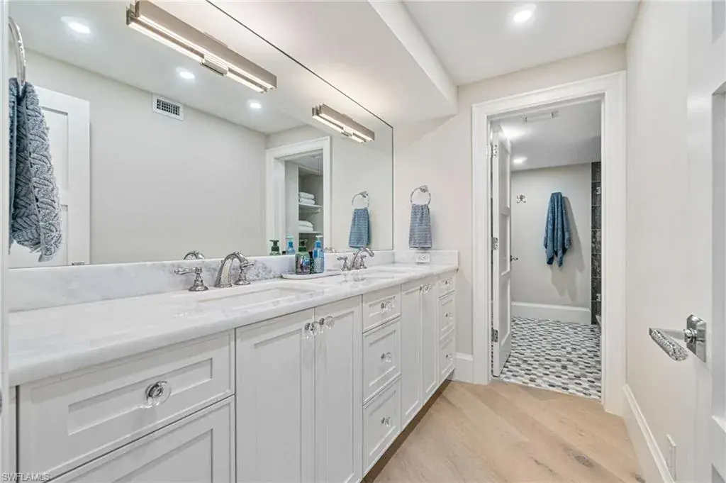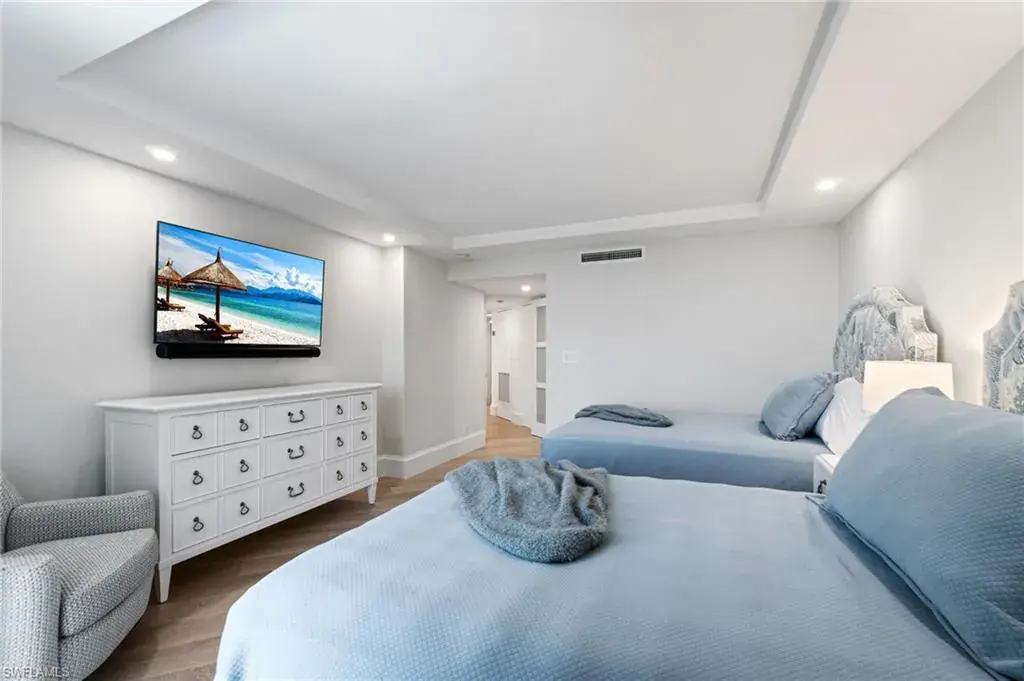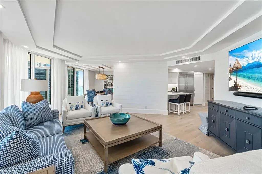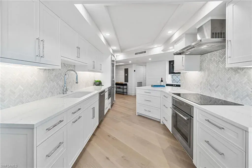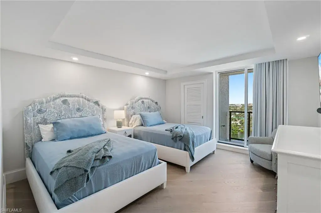 Experience the ultimate in modern coastal living in fully redesigned 3 bedroom, 3 full bath residence at The Meridian Club, one of Park Shore’s most prestigious beachfront addresses. Perched on the 15th floor, this turnkey designer condo offers sweeping views of both Venetian Bay and the Gulf of Mexico — a true Naples retreat for discerning buyers relocating from “up North”. The chef-inspired kitchen is a showpiece, featuring a Thermador appliance package with induction cooktop, built-in drawer microwave, and all stainless steel appliances. Elegant white cabinetry, quartz countertops, a white and gray herringbone backsplash, and high-end fixtures create a clean, coastal aesthetic. A breakfast bar for two adds casual dining space, while the complimenting wet bar with navy cabinetry, glass display, and patterned tile backsplash makes entertaining effortless. Designed by Diane Torrisi Designs and Kevin Steffanni Design Group, the home features wide-plank wood flooring, stepped ceilings, frosted glass and solid doors, and an open, light-filled layout leading to an expansive wraparound balcony with updated glass railings and a glass-enclosed seating area perfect for sunset views. The primary suite is a sanctuary with three custom closets, mirrored doors, and a spa-style bath with multiple shower heads. Two en-suite guest bedrooms offer refined comfort and privacy. High end designer furnishings, electric shades, custom draperies, custom closets and mounted TVs complete this elevated retreat.
