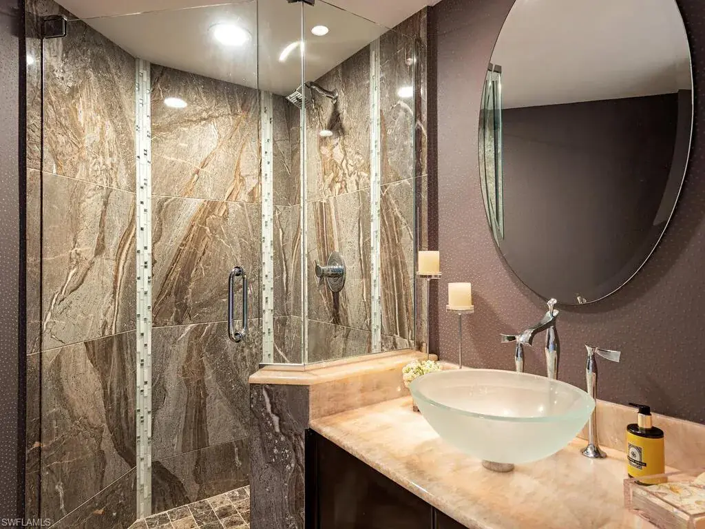 Beautifully remodeled and offered fully furnished, this 5th floor condominium located in the prestigious Meridian Club has lovely beach/Gulf and city lights views over Venetian Bay. Meridian Club #502 features 2 bedrooms with a den and 3 full bathrooms measuring 2,019 square feet plus a 400 square foot wrap-around balcony. All windows & sliders are impact-resistant. Meridian Club is a non-atrium building with fully-funded strong reserves & is structurally sound. Gated entrance, 24/7 doorman, on-site manager and assistant manager, heated pool, spa, cabana, fitness center, party room, library, tennis and pickleball courts, BBQ grills, bicycle storage, one deeded parking space, & one deeded caged storage on the lobby level. Located steps to the beach. The private beachfront lit promenade is 1.3 miles long. There was NO water intrusion into the building during any of the hurricanes. For added protection, Flood Panels were installed at all entry points into the building in 2024. Across the street are boat slips for lease or purchase. One pet up to 25 pounds is welcome.