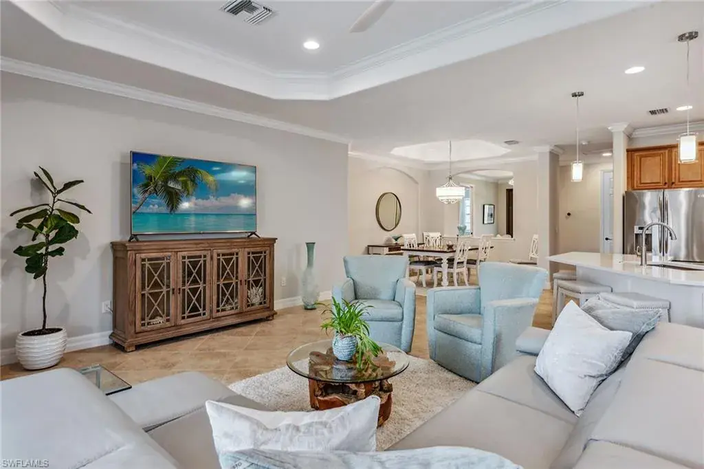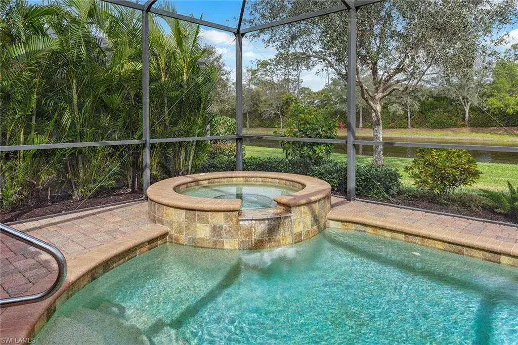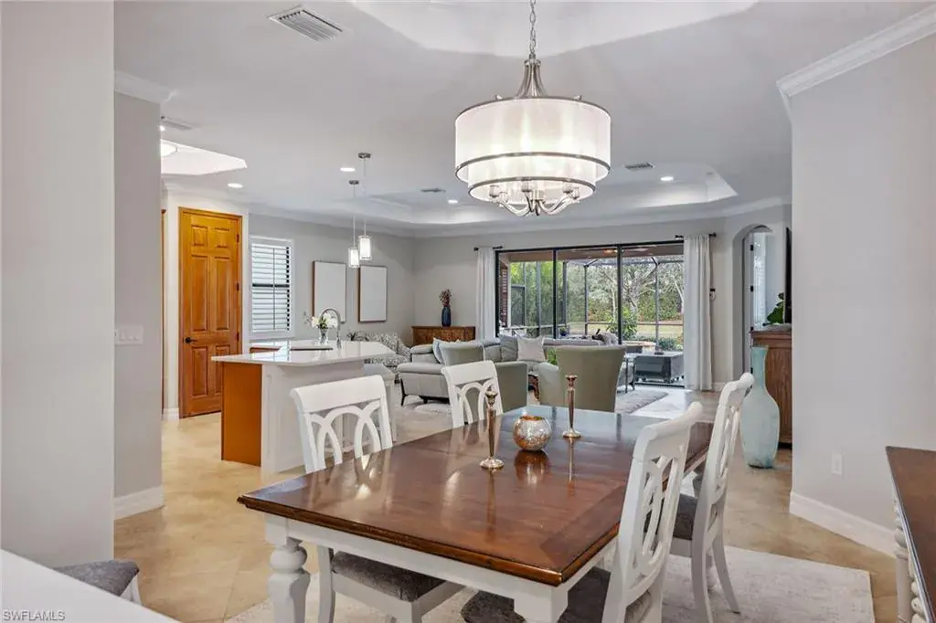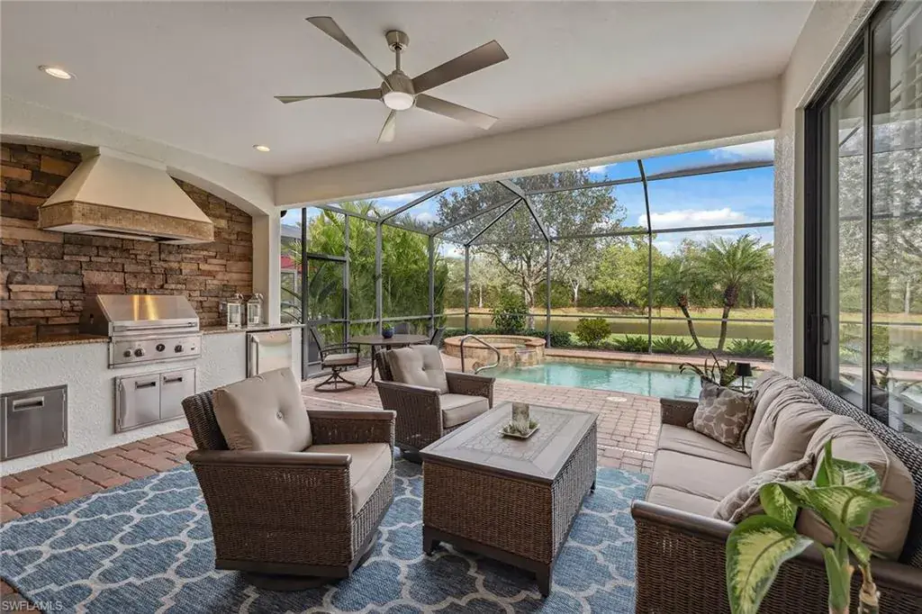 The buyer has the option to have the kitchen cabinets painted white, offering an opportunity to personalize the space to their taste. Dreaming of a stunning single-story Naples home with breathtaking lake views? Set within the prestigious resort-lifestyle gated community of Fiddler’s Creek, this exquisite three-bedroom, two-full-bath residence in the Millbrook neighborhood offers an unparalleled blend of sophistication and comfort. Beautiful exterior stonework, a paver driveway, and vibrant landscaping enhance the impressive curb appeal, while the tile roof adds timeless durability. Includes a new generator in 2023 and impact glass windows and sliders throughout. Pass through the artisanal glass door entry into an expansive foyer, where detailed crown moldings, tray ceilings, and designer lighting create a refined atmosphere that continues throughout the abode. Its split-floor layout seamlessly connects the generous living area to the dining alcove, illuminated by an elegant chandelier, ideal for intimate dinners or festive gatherings. The entertainer’s kitchen is a masterpiece, displaying gleaming quartz countertops, stainless steel appliances, a natural gas cooktop, wall oven and an updated sink. A generous kitchen island with seating and a walk-in pantry makes this space stylish and functional. The wood-floored bedrooms offer a tranquil retreat, with the primary suite featuring twin closets, direct patio access and a spa-like en suite complete with dual sinks, a frameless glass shower, a soaking tub and a private water closet. A set of double glass doors opens to a bonus room, ideal for a remote office, study, personal gym or overnight visitor accommodations. Venture outside to the enclosed saltwater heated pool and spa, where you can unwind while enjoying a serene lake backdrop. An outdoor kitchen makes entertaining effortless, ensuring every get-together is one to remember. Notable highlights include an attached two-car garage, plantation shutters and a laundry room with new washer and new dryer along with a sink and cabinets for convenience. Fiddler’s Creek offers an exclusive resort lifestyle, featuring a top-of-the-line fitness center with trainers, fitness classes, active tennis and pickleball programs, and scenic sidewalks for walking, running and biking. Optional golf, beach and marina memberships let you add more perks, including use of its new golf clubhouse and renovated championship course. Relax at the pristine pool with its slides, waterfalls, hot tub, sauna and steam room, or savor gourmet meals at the elegant restaurant or poolside bar and grill. A robust activity and event calendar ensures there’s exciting interactions to enjoy. Conveniently a short distance from Marco Island and Old Naples, you’ll have easy access to unsullied beaches, marinas, yacht clubs, upscale boutiques, cafes, parks, executive airport and outdoor adventures such as kayaking and paddleboarding. A must-see for those seeking luxury and comfort!
