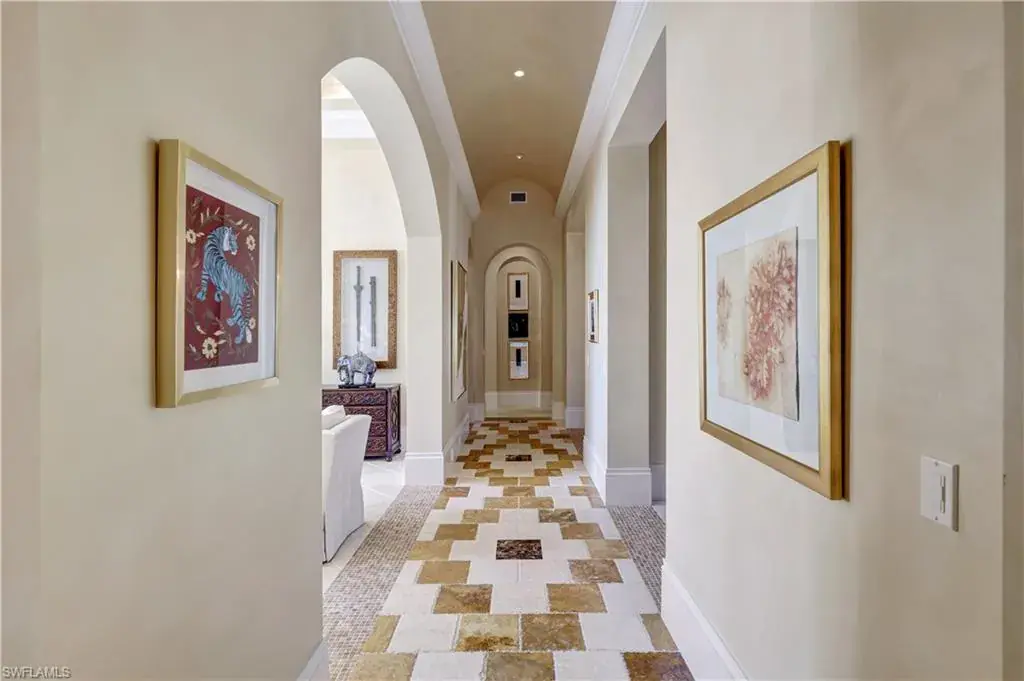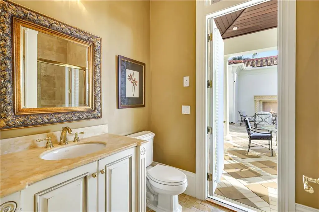Strategically placed for maximum privacy, each guest suite features a walk-in closet and full en-suite bath adorned with tile and marble vanities. The luxurious primary suite offers a spa-inspired bath with dual vanities, custom cabinetry, a soaking tub, and a huge shower with dual heads. Large windows, oversized walk-in closets and a door to the pool and spa complete the space.