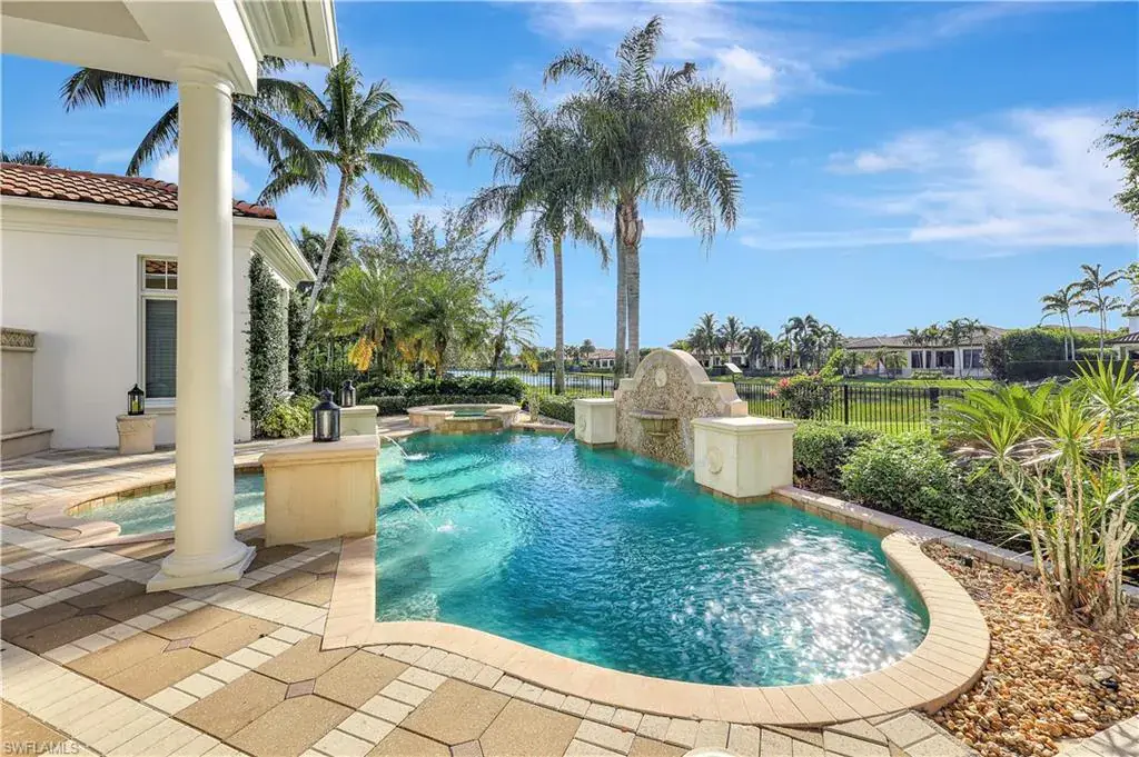 The gourmet kitchen is a chef’s dream, featuring custom wood cabinetry, granite countertops, Viking appliances, a walk-in pantry and entertaining bar, ideal for formal gatherings. In the adjacent family room, french doors open to a covered lanai complete with an outdoor kitchen again with Viking appliances—perfect for entertaining or relaxing in privacy.