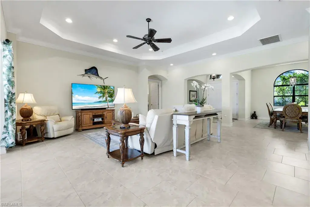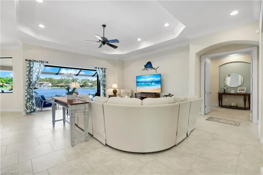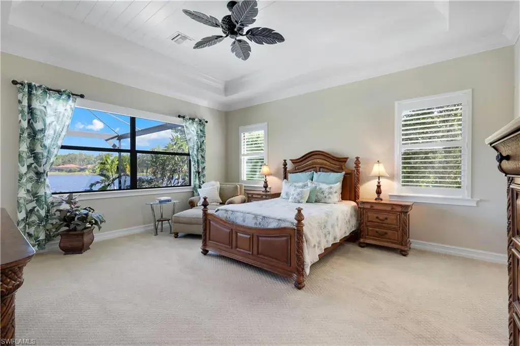 Experience refined Florida living in this beautifully appointed 4-bedroom, 3-bath pool home offering breathtaking long-lake views in the sought-after gated community of Mockingbird Crossing. A light-filled open floor plan features tray ceilings, plantation shutters, crown molding, high ceilings and 8′ doorways throughout. The great room flows seamlessly to the lanai through triple sliding doors, creating the perfect space for indoor/outdoor entertaining. The chef’s kitchen has an oversized quartz island with extra storage, built-in wine cooler, 42-inch cabinetry with display features, and a spacious breakfast nook overlooking the lake. Laundry room has top of the line XL, LG washer and dryer. The primary suite is a serene retreat with a custom coastal wood ceiling, remote-control Hunter Douglas blinds, two walk-in closets, and a spa-inspired bath with jetted garden tub, dual vanities, amazing walk-in shower and abundant storage. A guest suite with private bath provides comfort and privacy, while two additional bedrooms offer flexible space for a den, office, or media rooms with one opening directly to the lanai. Enjoy the heated saltwater pool and spa with beautiful tile accents. The large lanai is pre- plumbed so you can create the outdoor kitchen of your dreams, wired for an outdoor TV and even a “secret garden” complete with fountain just outside. The entire home is surrounded by lush landscaping creating a true oasis. The air-conditioned 3-car garage is insulated for year-round comfort and features an epoxy floor, storage cabinets and a work sink large enough to bathe most dogs. The large paver drive has ample parking for family and guests. The home also has water filtration, purification systems and Impact windows and doors AND Flood Zone X. Mockingbird Crossing offers low HOA fees, and an ideal North Naples location close to beaches, dining, and shopping. This home embodies the best of luxury coastal living—schedule your private showing today!