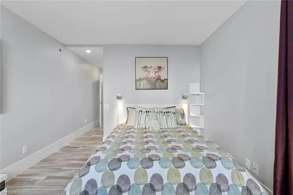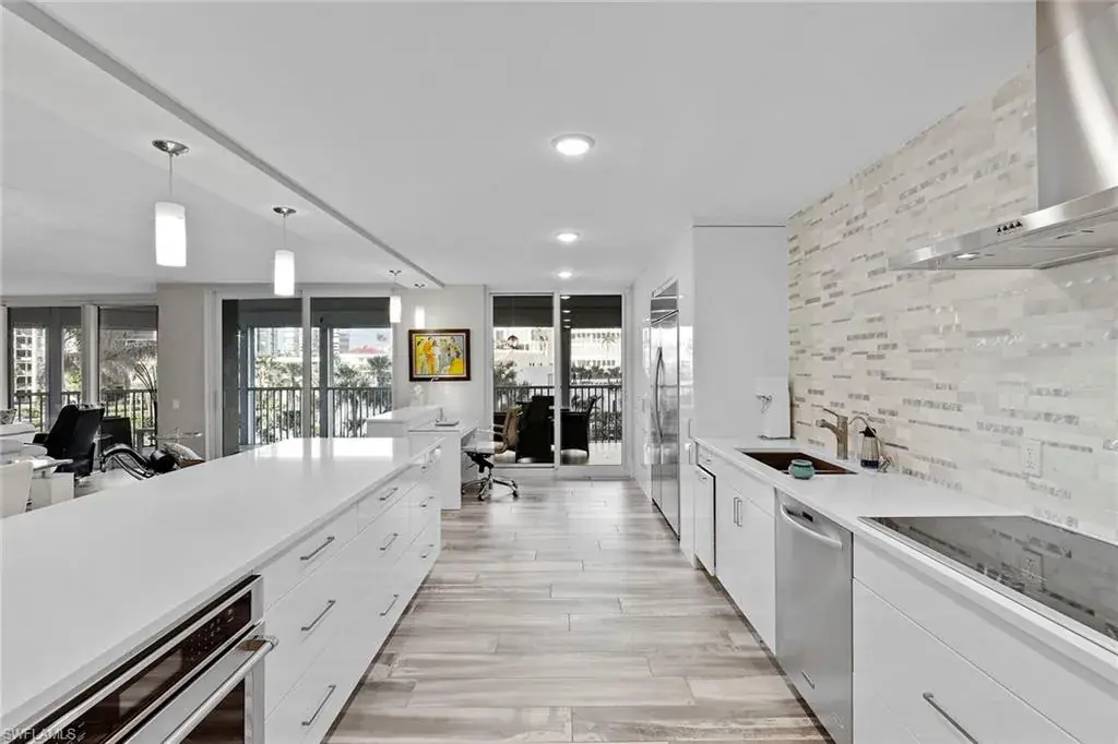 The kitchen is designed for both form and function, with quartz countertops, custom cabinetry, a large center island, and stainless-steel appliances. Offered furnished, this residence is equipped with impact-resistant glass and electric storm shutters for added security and peace of mind. A spacious lanai captures western sunset views over the Gulf of Mexico.