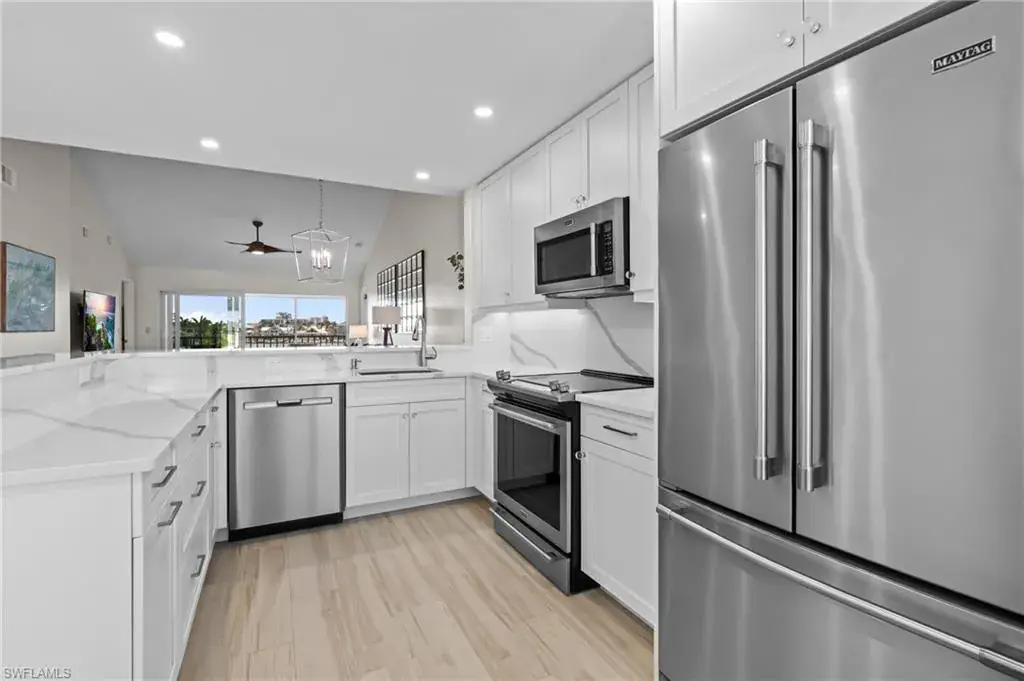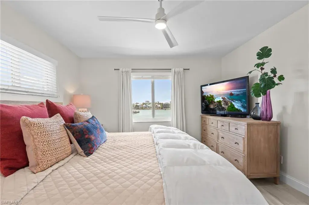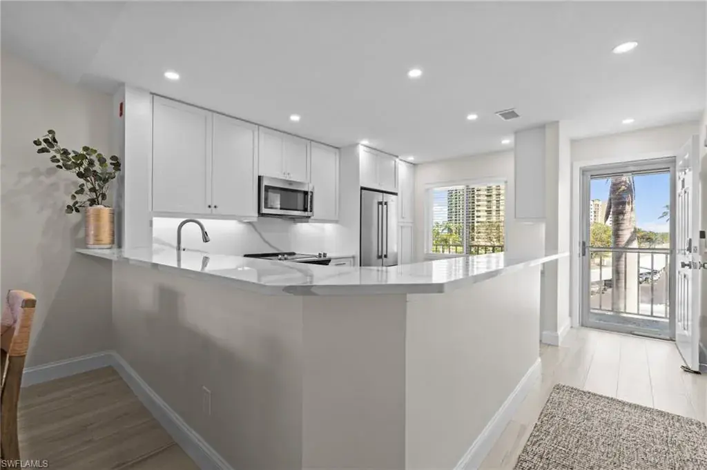 Experience coastal living at its finest in this beautifully remodeled 3-bedroom, 2-bath bayfront condo, within the gated community of Monte Carlo Club. Just steps from the sugar sand beaches of Vanderbilt Beach, every inch of this stunning residence has been thoughtfully upgraded. This serene condo features: tile flooring throughout, vaulted ceilings, spacious bedrooms with detailed window treatments, remodeled bathrooms, and a completely renovated kitchen with 42-inch cabinets and brand-new stainless steel Maytag appliances. Enjoy peace of mind and the comforts of worry-free living with Storm Smart impact windows, impact sliding doors, and impact/storm front door, new LG Washer and Dryer, plus a new AC and Water Heater. Your future beach home boasts an open concept living area that allows natural light to flow through generously, displaying the sparkling view of Vanderbilt Bay from every room. Tranquility and convenience meet with designer lighting in every room, custom closets in the primary bedroom and a spacious laundry room that offers abundant built in storage for all your beach supplies! When the Gulf isn’t calling, you can unwind at the Monte Carlo pool or break a sweat at the pickleball and tennis courts! Whether you’re catching the sunset from within the Monte Carlo gates or taking the 3-minute walk to The Turtle Club or La Playa, this location provides Naples finest, at your fingertips. Don’t wait, schedule your private showing for this Naples Oasis today!