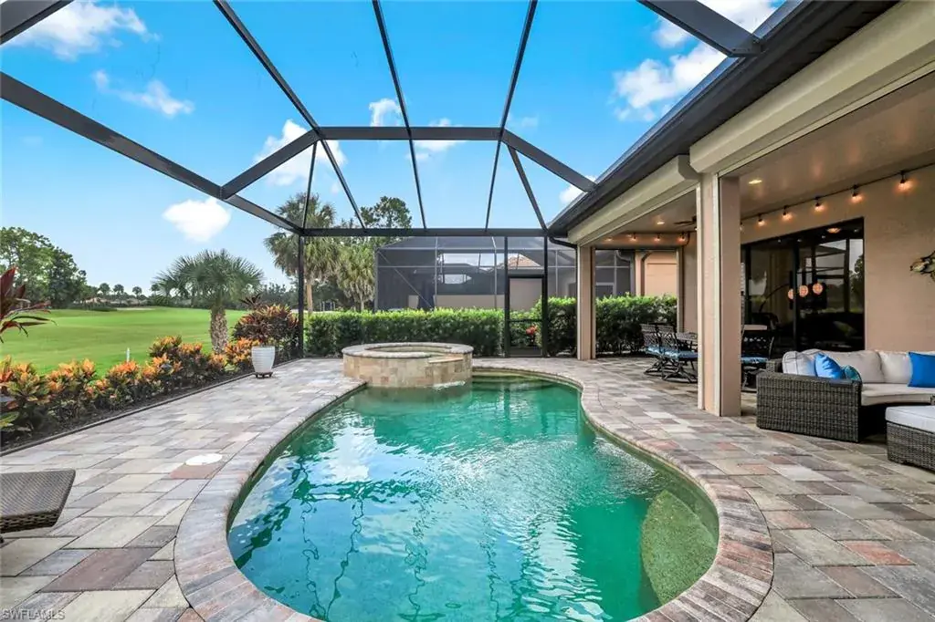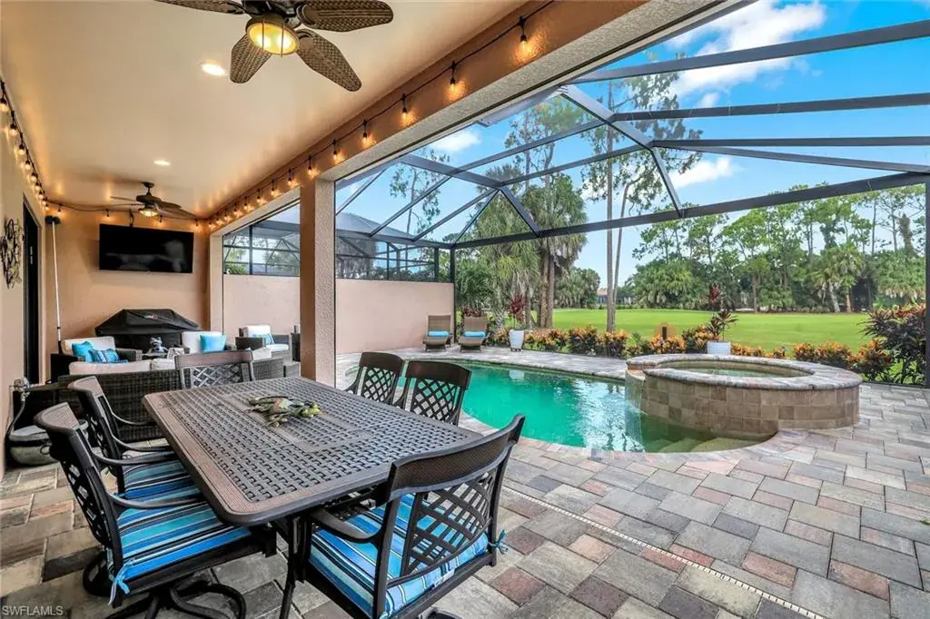 FANTASTIC NEW PRICE! Dreaming of an idealic golf view home in SWFL? Then this is the ONE! AMAZING extended lanai with picture frame screens enable SWEEPING fairway & green golf views of #5 on The Classics! The spacious lanai, featuring ample seating for dining and lounging pool-side, also has mounted TV and gas grill, so you can truly enjoy outdoor living at it’s finest! The fantastic outdoor space flows seamlessly with meticulously maintained interiors, so entertaining will be a breeze for you and your guests! Lighter, brighter spaces with new interior paint and upgraded lighting. When it’s time for a round of golf, tennis or pickleball, they are but a short distance away in this ammenity rich Lely Resort community. This Moorgate Point home has it all!!!! This 3+BR (flex space used as den/office/4th bedroom with murphy bed and discrete Hunter Douglas privacy screen), 2 Bath, turnkey villa is ALL TILE! NO CARPET OR LVP! $100K+ in UPGRADES including, but not limited to electric storm shutters on all windows, NEW 2023 extended lanai with picture window screen and upgraded pavers, 2023 NEW refrigerator, NEW shower enclosures in both baths, and NEW pool heater and variable speed pump, NEW interior and exterior lighting, and SO MUCH MORE! This property comes with an immediate membership to The Players Club & Spa, providing you and your guests with terrific resort-style amenities! This would include indoor/outdoor dining, entertainment, resort and lap pools, tiki-bar, 22’ waterfall, tennis, pickleball, spa and attended fitness center, and the opportunity to make friends for life. Isn’t it time you started living your best life here in Lely Resort? The answer is YES, your time is now!