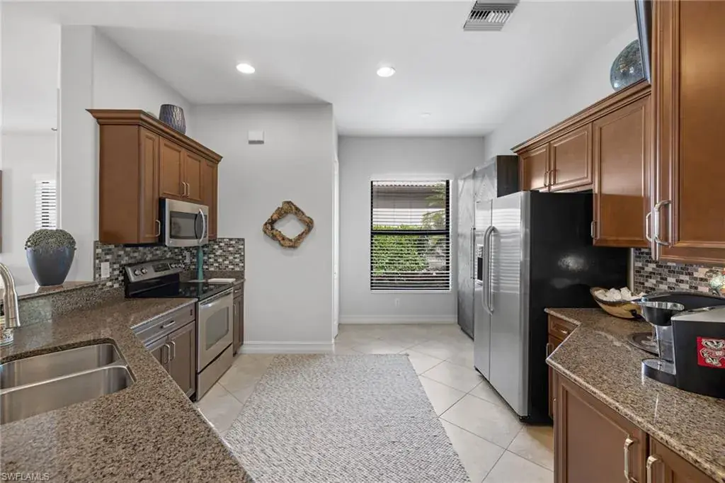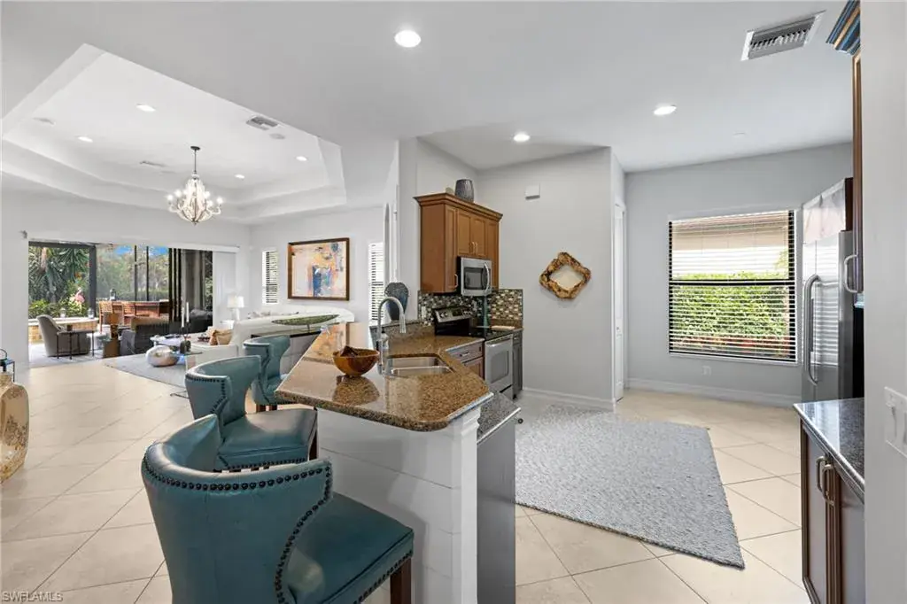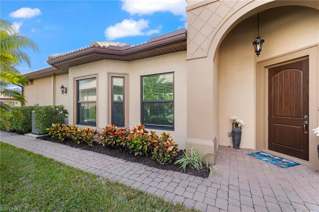 Perched on the picturesque 5th fairway of The Classics Country Club, this Armanita model home offers a harmonious blend of resort-style living, an impressive host of updates, and serene golf course views. Boasting breathtaking western exposure, the extended lanai—expanded by 5 feet and enhanced with a modern picture window cage and elegant leathered marble tile (all completed in 2022)—offers the perfect setting to relax in your private pool and spa while enjoying spectacular sunsets. Inside, the thoughtfully designed open floor plan is ideal for both entertaining and daily living. The gourmet kitchen showcases stainless steel appliances, bar seating, and ample counter space, seamlessly flowing into the great room, adorned with tray ceiling accents and diagonal tile flooring. The primary suite serves as a private retreat with soft, inviting tones, plank tile flooring, a tray ceiling, and an ensuite bath featuring dual sinks, a frameless glass shower, and a soaking tub. Updates include a freshly painted exterior (2022), a new A/C unit, a water heater, gutters, and downspouts (all 2022), ensuring comfort and modern convenience. Impact-resistant windows throughout and hurricane Kevlar shutters add peace of mind, while the flush-fitted water spigot and electrical outlet enhance functionality (all 2022 upgrades). A spacious garage provides abundant storage for all your needs. As a member of the exclusive Players Club, you’ll enjoy unparalleled amenities, including three resort-style pools, tennis, bocce, pickleball courts, on-site dining options, and a lively tiki bar. Situated in the heart of Lely Resort, this home offers access to one private and two public golf courses, with close proximity to Naples and Marco Island’s sandy beaches, vibrant 5th Avenue shopping, and an array of dining and entertainment options. This home represents the ultimate in Southwest Florida living, combining resort-style amenities, impressive upgrades, and a prime location. Don’t miss your chance to make it yours today! This home is being sold furnished (with exclusions).