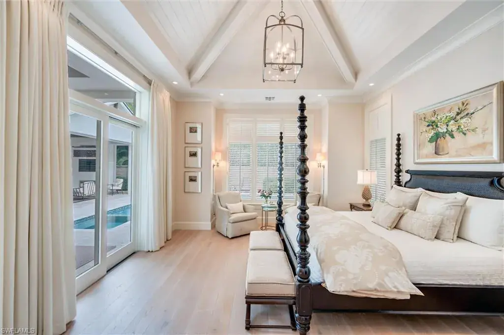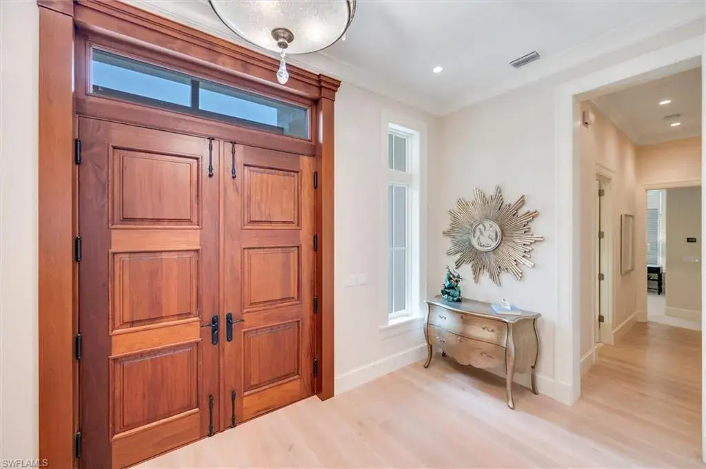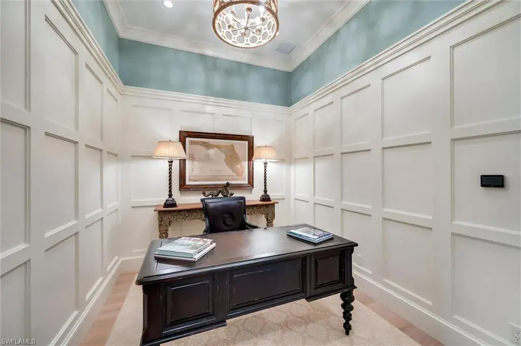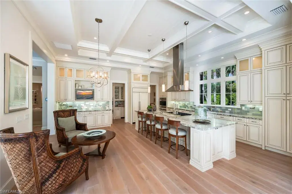 In the heart of the Moorings sits a picture-perfect single story home on a .36 acre southeast private corner lot. Prepare to be in awe with the attention to detail! Filled with natural light, the open floor 3933 under a/c, 5,473 total square foot plan is an ideal and manageable living space with a great flow. An innovative design with a one-of-a kind dramatic cupola featuring 4 bedrooms, 4 full baths, 2 half baths, a study, 3 car garage, gas heated pool and spa, an intimate outdoor living space and a lushly landscaped private side yard perfect for pets. Exceptional craftsmanship is found throughout the home with extensive custom millwork and moldings and beautifully stained and painted cypress tongue & groove vaulted ceilings. Fireplaces, a summer kitchen with a Viking grill, and remote-controlled screening and shutters make the outdoor space cozy and perfect for entertaining. The spectacular oversized gourmet kitchen offers Wolf, Bosch and Sub-Zero appliances as well as custom maplewood cabinetry, exotic quartz countertops, an expansive working island and butler’s prep area with full pantry. Extremely striking are the handcrafted European white oak hardwood floors, magnificent lighting fixtures, chandeliers and wall sconces, and the carefully selected stones and natural materials – marble, onyx, quartz, granite, and shell stone – adding warmth to the spaces. A professionally interior designed home, extraordinarily beautiful, and offered turnkey with luxurious custom furniture, original commissioned artwork, sculptures, fitness equipment, fine china, exquisite accessories, and home audio/visual throughout. Other special and mechanical features include two 2022 Lennox HVAC’s with an 8 duct-zoning system and digital thermostats in every room; two tankless water heaters; 2022 gas pool heater & pump; 500 gallon propane tank; and a professional landscape design! Every detail of the home is simply perfect and only requires a discriminating buyer with a suitcase. No weather-related insurance claims, and no water damage. Location, location, location! Within one-half mile to Moorings Private Beach, an exclusive amenity privileged to this residence, and a short distance to world-class fine dining and boutique shopping on 5th Avenue, Third Street and Venetian Village. Hospitals, parks, challenging golf courses and marinas all nearby. Come fall in love with paradise!