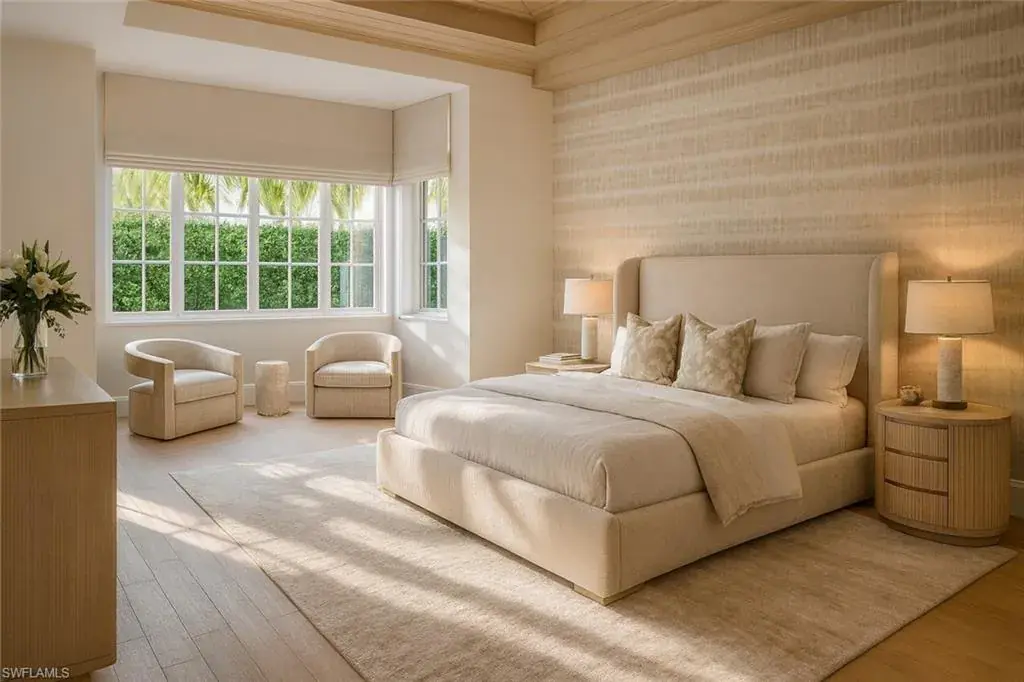 Positioned on a rare, gated corner double lot, and offering serene, wide water views, 275 Spring Line Drive is a fully reimagined estate that prioritizes privacy, scale, and refined execution. Currently undergoing a comprehensive top-to-bottom renovation with curated interiors by Freestyle, the property offers immediate access to deepwater boating along one of Naples’ most prestigious bayfront corridors. Every square foot of this custom residence has been reconsidered for both aesthetic sophistication and livable utility. The home spans multiple wings and includes a separate carriage house with three garage bays, supplementing the primary two-car garage for a total of five. Boating infrastructure includes two private docks and a jet ski platform, all set behind secure gates and framed by manicured grounds. The main residence features a fully equipped chef’s kitchen with Wolf/Sub-Zero appliances, 6-burner gas range, dual Miele dishwashers, and a walk-through butler’s pantry. Adjacent, a custom bar connects directly to the great room. A formal dining area anchors the front of the home with views of the garden, while a club/media lounge and fitness suite support leisure and wellness at scale. The primary suite occupies a secluded bayfront wing, offering direct access to the pool and spa. The bathroom is clad in stone and fitted with dual vanities, soaking tub, oversized shower, and two water closets with Toto Neorest 700 intelligent toilets. Separate dressing rooms complete the primary suite. Outdoor spaces include a saltwater pool with integrated spa, fire pit lounge, and expansive entertaining terraces. The home is elevated on an 11’ slab and was unaffected by storm surge. A 60kW full-home generator ensures uninterrupted function. Offered fully furnished, this residence will be delivered in October 2025.
