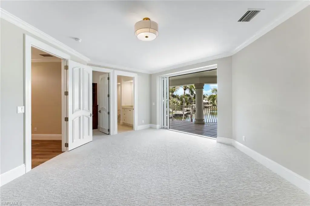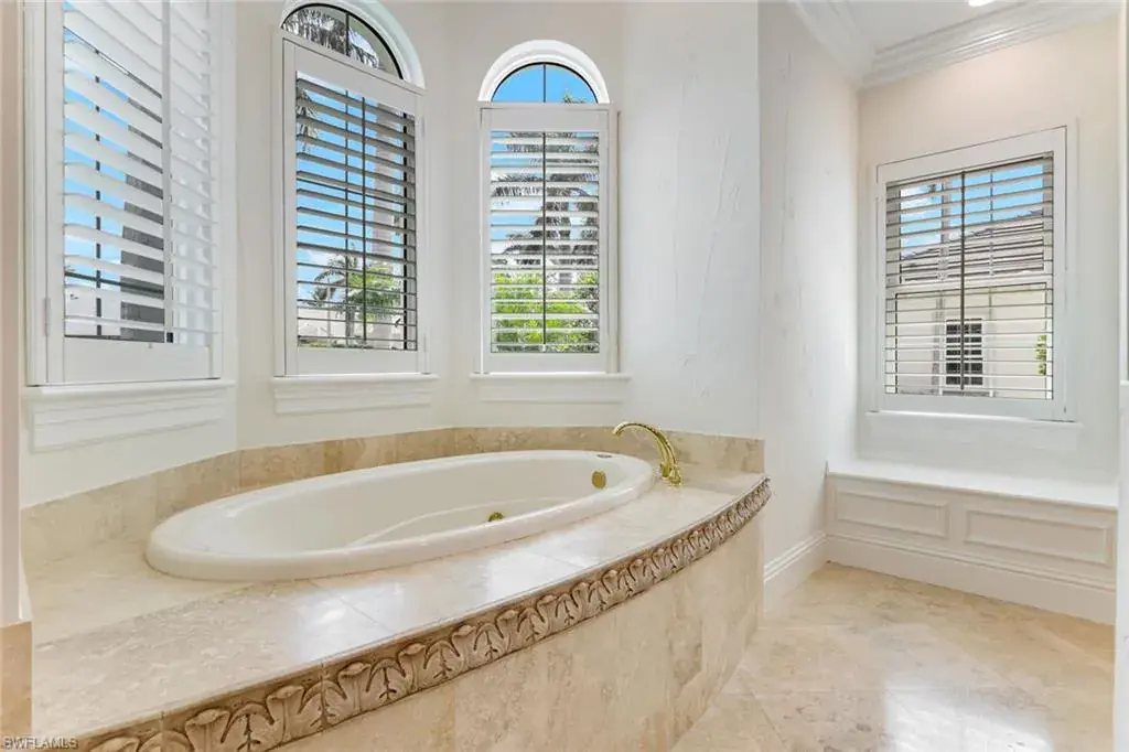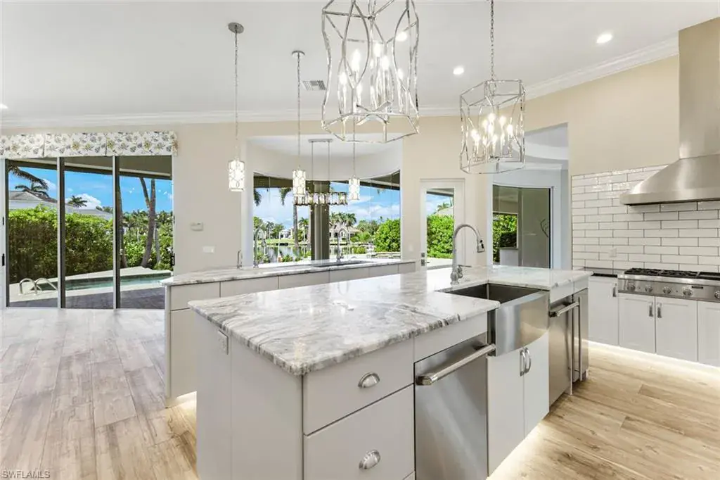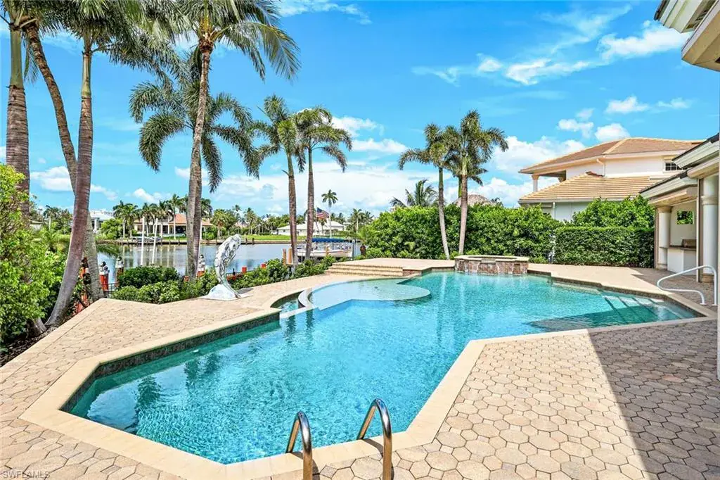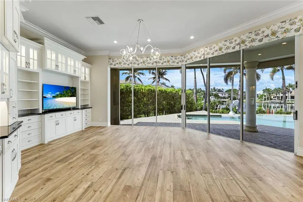As you step into the formal living room, you’re greeted by awe-inspiring water views framed by floor-to-ceiling windows, complemented by a cozy gas fireplace. Enjoy spectacular sunsets from your new residence in The Moorings, situated on .31 acres with southwest rear exposure on Compass Pass, where you’ll find your boat dock with a lift that can accommodate a substantial-sized boat. Quick, direct Gulf access with one bridge is a boater’s delight. Five bedrooms plus a den, a large bonus room, five and a half baths, as well as an oversized attached garage with a circular drive provide ample space for your car collection and street-legal golf cart. The generously sized family room, with pocketing sliding doors opening up to your amazing outdoor living space, will surely become a favorite spot for relaxing and enjoying time together. The sprawling master suite, with dual vanities, a jetted tub, walk-in shower, his-and-her custom closet systems, a separate library or den with beautiful French doors, and an additional first-floor en suite bedroom, offers ultimate comfort. Upstairs, you’ll find three inviting bedrooms with custom closets and en suite baths, plus a pleasant bonus room with a wraparound balcony overlooking the fabulous pool and bay, perfect for a game room or media room. The grand gourmet kitchen, featuring a Thermador appliance package with a six-burner gas range and griddle, two dishwashers, a double wall oven, and a microwave drawer, is sure to excite any foodie. Dual Sub-Zero refrigeration, ample custom under-lit cabinetry with two islands, a fantastic oversized sink, and an ice maker make it perfect for entertaining. The impressive pool, with its expansive sundeck, jacuzzi, and summer kitchen, sits amid a beautifully landscaped, fully fenced backyard, ensuring privacy and security for your loved ones. Nestled on prestigious Mooring Line Drive, you’re just moments away from Old Naples, the Venetian Village, Waterside Shops, and the exclusive Moorings private beach.