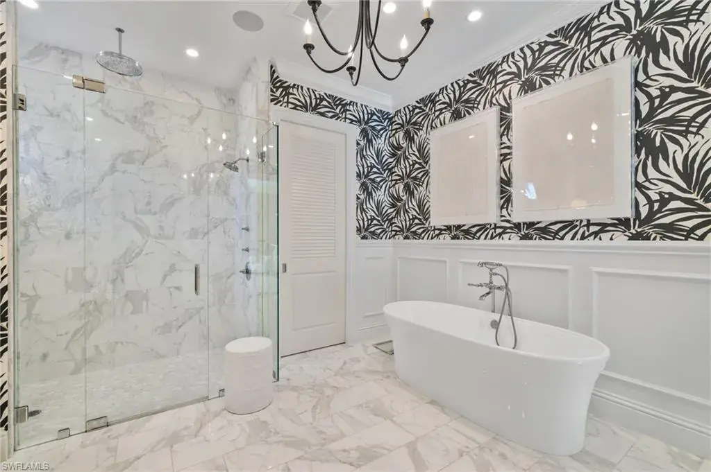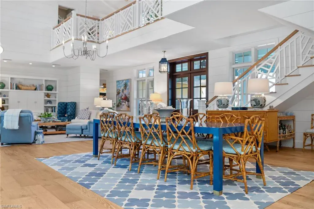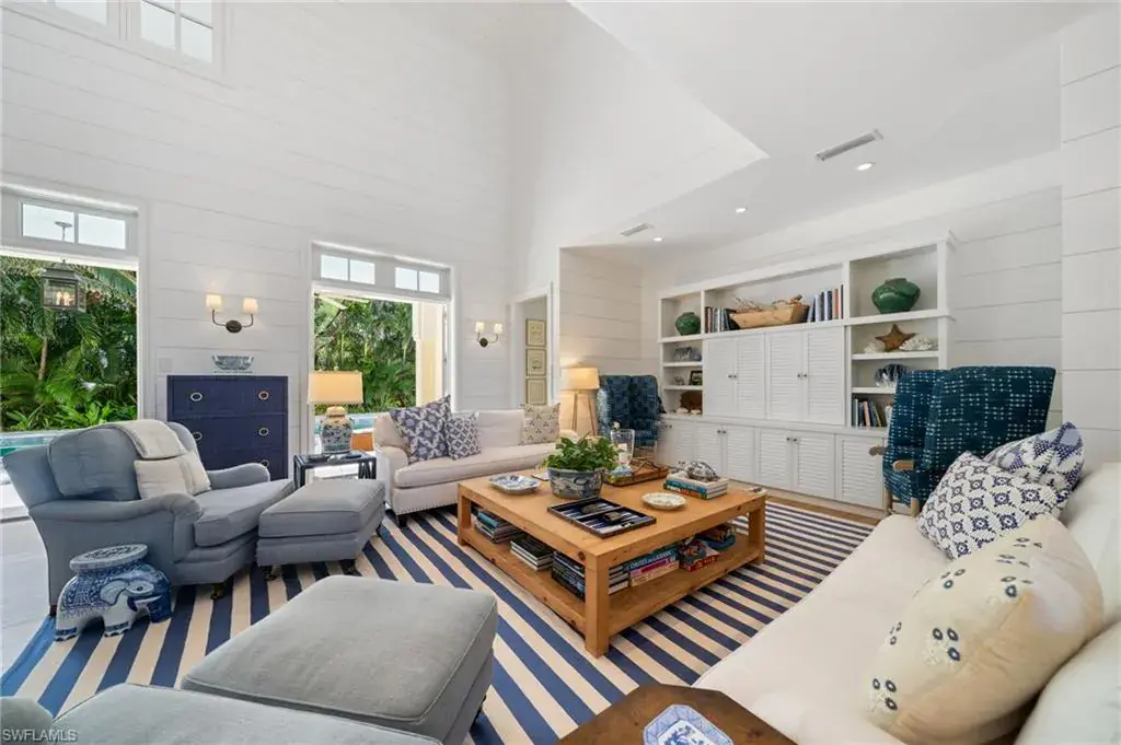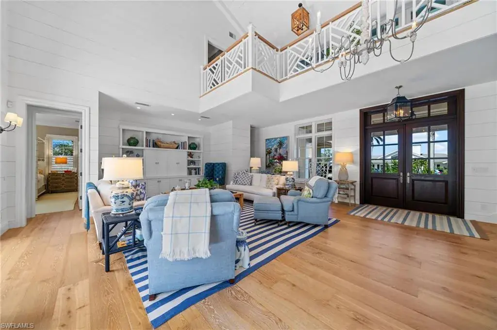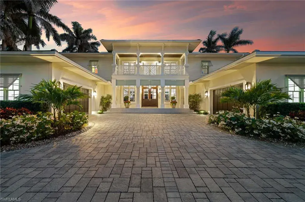 Designed, built, and decorated by a renowned interior designer, this stunning four bedroom, five bathroom estate blends timeless Southern charm with modern luxury. The interior of this home has remained completely unaffected by hurricanes or flooding, with no water intrusion to the interior during any storm event. Boasting two master suites, one on the main level and another upstairs, both feature spa-like ensuite baths with heated floors for ultimate comfort. Step inside to an awe-inspiring great room with soaring ceilings, seamlessly flowing out to a screened in lanai that overlooks an oversized resort style pool, complete with a sun shelf and spa. Custom wide plank oak flooring by Legno Bastone enhances the warmth and elegance of every space. At the heart of the home, the chef designed kitchen is a culinary dream, outfitted with a gas Wolf range, SubZero refrigeration, two beverage drawers, a warming drawer, two dishwashers, and a built-in microwave drawer. A banquette, oversized island, and formal dining area provide multiple dining options, while a nearby wet bar with a wine fridge adds convenience. Outdoor living is equally impressive, featuring a fully equipped summer kitchen, pool deck dining under the stars, and a screened in dining area, all protected by forty two SWAT Mosquito sprayers. Upstairs, discover two additional spacious ensuite bedrooms and a versatile family room that doubles as a sleeping porch for family sleepovers. This home also includes two oversized garages, a custom laundry room with a second refrigerator, sink, and standalone Scotsman ice maker, a Kinetico water filtration system, a Sonos sound system, Lutron smart lighting, and WiFi controlled heating and cooling. Built with solid concrete walls, steel beams, and a poured concrete second floor, this residence offers exceptional durability and safety. Thoughtfully designed to create a sanctuary of comfort, style, and security, this home is truly one of Naples’ finest residences.