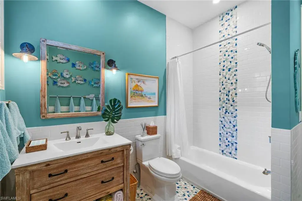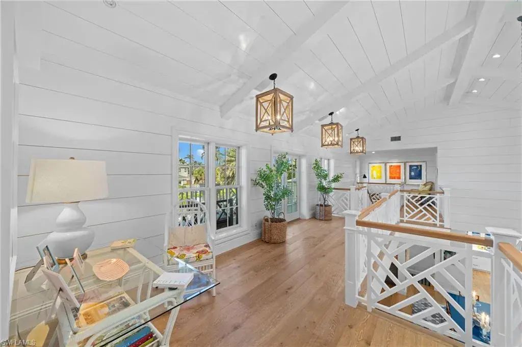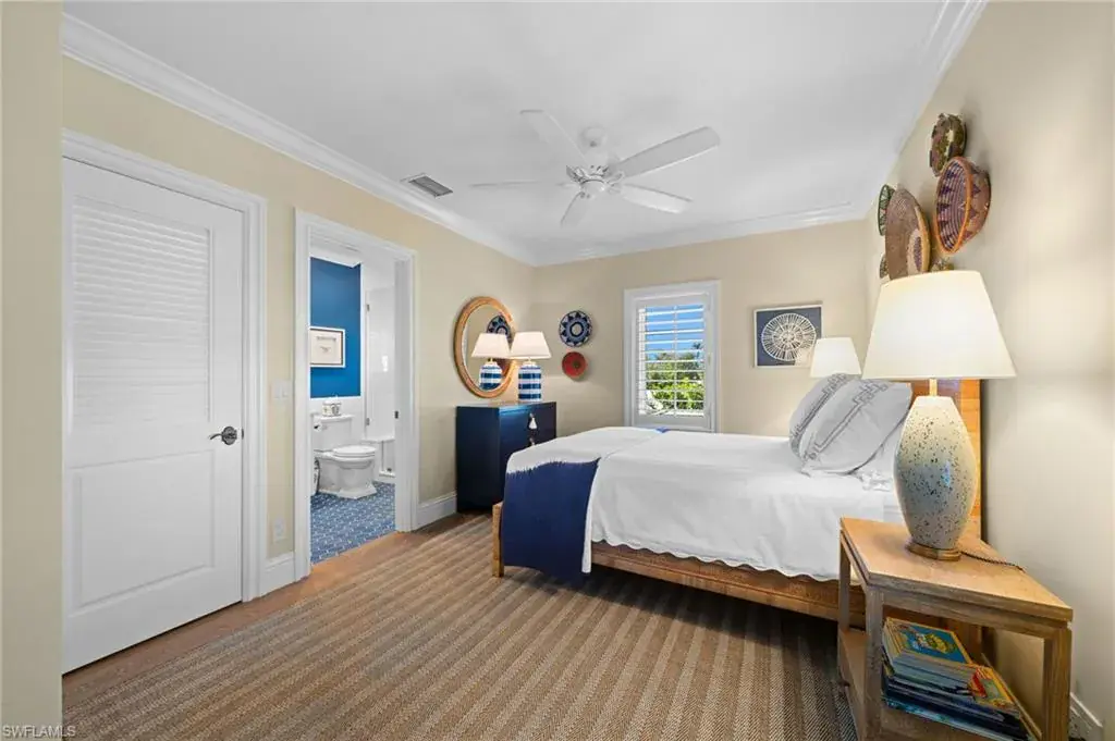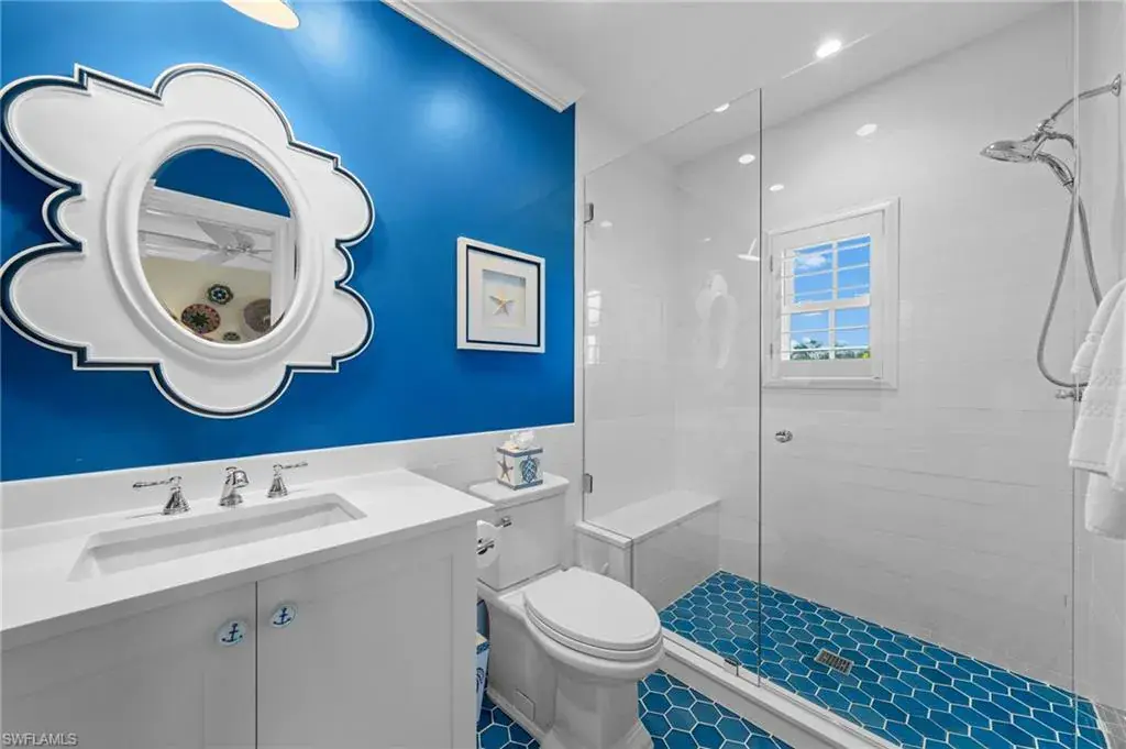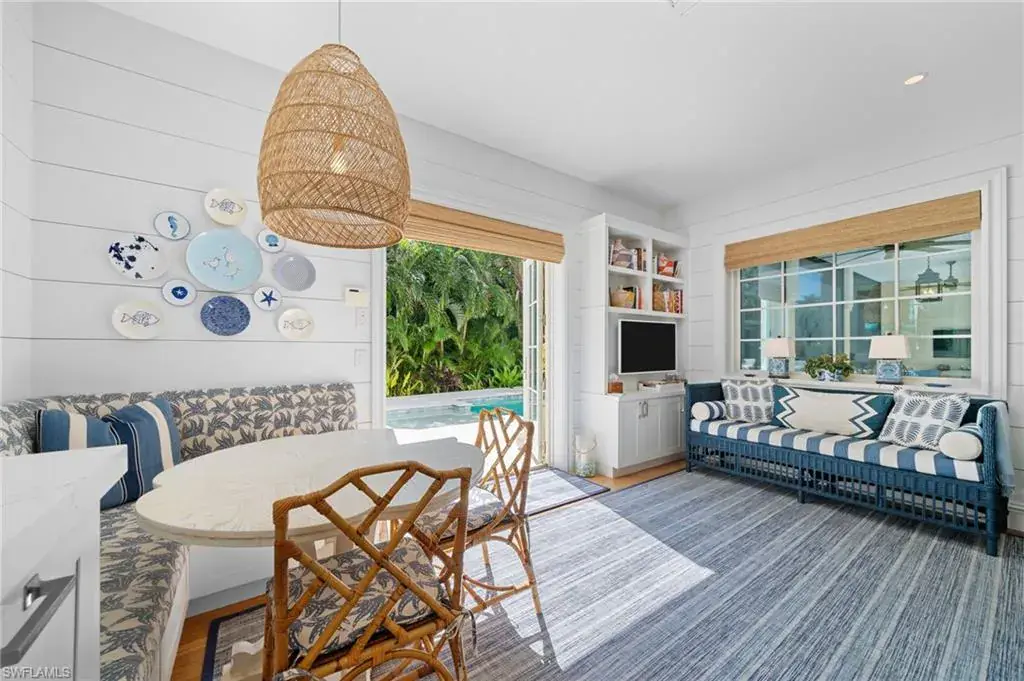 Designed, built, and decorated by a renowned interior designer, this stunning four bedroom, five bathroom estate blends timeless Southern charm with modern luxury. The interior of this home has remained completely unaffected by hurricanes or flooding, with no water intrusion to the interior during any storm event. Boasting two master suites, one on the main level and another upstairs, both feature spa-like ensuite baths with heated floors for ultimate comfort. Step inside to an awe-inspiring great room with soaring ceilings, seamlessly flowing out to a screened in lanai that overlooks an oversized resort style pool, complete with a sun shelf and spa. Custom wide plank oak flooring by Legno Bastone enhances the warmth and elegance of every space. At the heart of the home, the chef designed kitchen is a culinary dream, outfitted with a gas Wolf range, SubZero refrigeration, two beverage drawers, a warming drawer, two dishwashers, and a built-in microwave drawer. A banquette, oversized island, and formal dining area provide multiple dining options, while a nearby wet bar with a wine fridge adds convenience. Outdoor living is equally impressive, featuring a fully equipped summer kitchen, pool deck dining under the stars, and a screened in dining area, all protected by forty two SWAT Mosquito sprayers. Upstairs, discover two additional spacious ensuite bedrooms and a versatile family room that doubles as a sleeping porch for family sleepovers. This home also includes two oversized garages, a custom laundry room with a second refrigerator, sink, and standalone Scotsman ice maker, a Kinetico water filtration system, a Sonos sound system, Lutron smart lighting, and WiFi controlled heating and cooling. Built with solid concrete walls, steel beams, and a poured concrete second floor, this residence offers exceptional durability and safety. Thoughtfully designed to create a sanctuary of comfort, style, and security, this home is truly one of Naples’ finest residences.