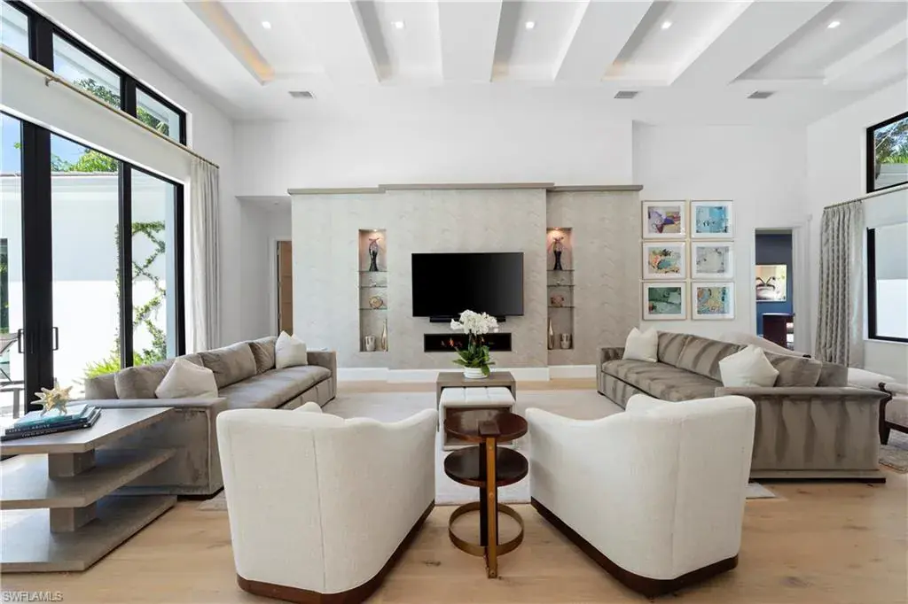 Desired “West of Crayton” location, this newly built 4+Bed/5 Bath Moorings home has it all. Less than a mile to your private beach and on a quiet street enter to find an open floor plan with an abundance of natural light, voluminous detailed ceilings & decorative beams. Fully pocketing impact sliders allow for seamless integration of the indoor/outdoor space. Ideal southern exposure provides sun all day on your outdoor oasis complete with pool + spa, built in grill and lounge w/ fireplace and T.V. The expansive great room floor plan features wide plank oak flooring & opens to dining room with custom bar and kitchen complete with island seating, ample counter space, and Thermador appliances. Primary suite features dual walk-in closets, a spa like bathroom with a shower & soaking tub, dual sinks, makeup vanity and skylights for even more natural light. Three additional guest rooms (all ensuite) w/ a den/office that can easily handle overflow guests. This fully-fenced property is landscaped with privacy in mind & complete with circular, paver driveway and 3-car garage. Added bonus of “turnkey” furnished + significant rental income for those not ready for full time life in Naples!