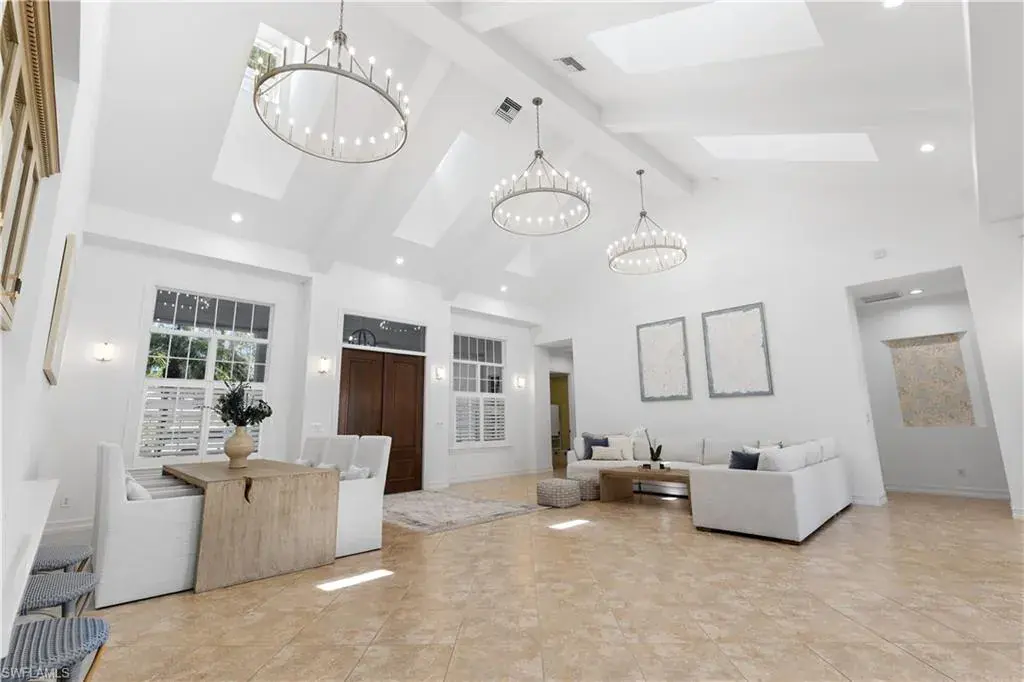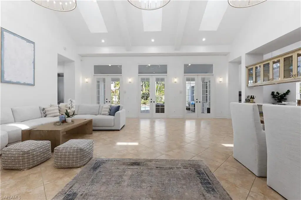 Soaring ceilings with multiple skylights fill this stunning 4 bedroom plus den pool home with abundant natural light. Designed for both family living and effortless entertaining, the layout includes a private living suite—ideal for a live-in nanny or in-law. The spacious kitchen is a host’s dream, featuring dual dishwashers, an ice machine, two sinks, a separate breakfast bar with a wine cooler, and more. A durable metal roof and accordion shutters provide enhanced hurricane protection. Nestled in the prestigious Moorings community, this home offers an upscale lifestyle with mature surroundings, exceptional Gulf and beach access, and close proximity to world-renowned shopping, dining, and entertainment. A true haven for boaters, golfers, and beach lovers alike.
