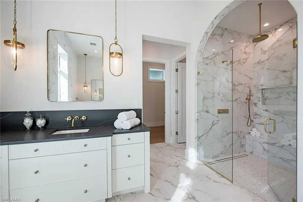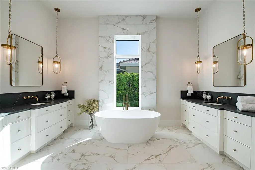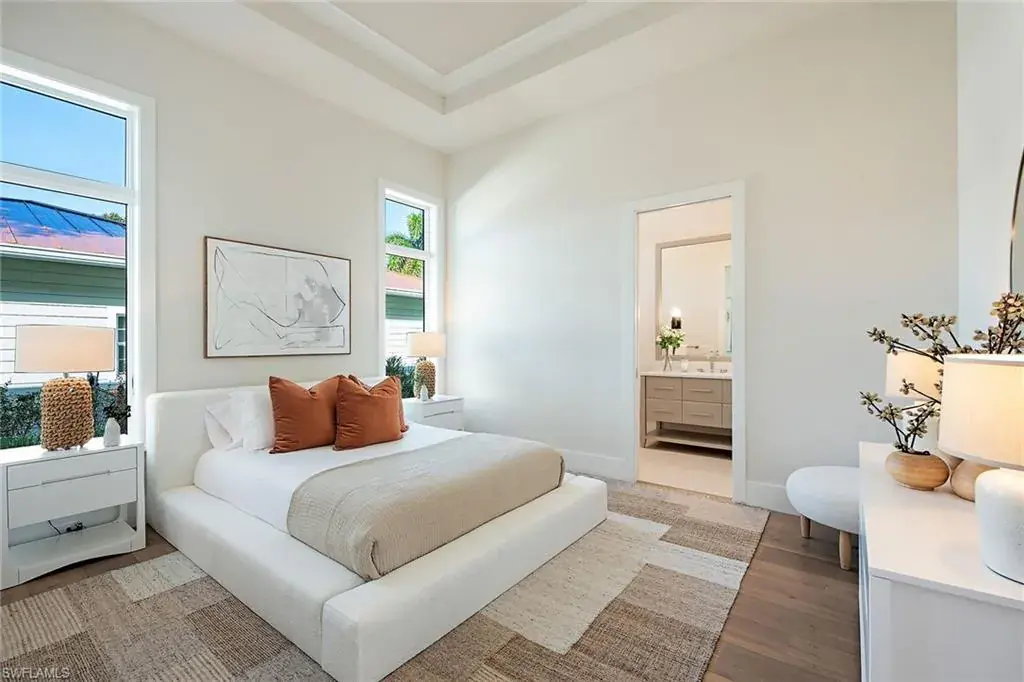 New construction in X-500 flood zone, a luxurious transitional oasis! Go into the grand foyer of this exquisite five-bedroom, five-bath residence, and be immediately enamored by its breathtaking vaulted ceilings and the seamless flow between indoor and outdoor spaces. This stunning home in the Moorings showcases distinctive architectural details that elevate its charm and sophistication. Prepare to entertain in style in the gourmet kitchen, equipped with elegant quartz countertops, state-of-the-art appliances, a built-in pantry, wine cooler, and refrigerator drawers. The spacious center island, complete with a breakfast bar, is ideal for gatherings and culinary delights. Throughout the home, you’ll find exquisite porcelain tile and white oak wood flooring, complemented by solid-core 8-foot interior doors. Modern conveniences abound with a generator, a built-in Sonos music system and pre-wiring for security cameras, marrying elegance with cutting-edge functionality. The expansive owner’s suite is a retreat, featuring quartz countertops, a relaxing soaking tub, two beautifully designed walk-in closets, and private water closets for added privacy. Go into the magnificent great room, which opens seamlessly to your secure outdoor living area, complete with a stunning swimming pool and spa. Enjoy alfresco dining in the fully equipped summer kitchen, cozy up by the gas fireplace, and relax on the outdoor patios or under the covered lanai, featuring automated insect screens and hurricane-rated shutters. Ideally just a short distance from the beach, restaurants and shopping, this remarkable home also offers the opportunity for membership to the sought-after Moorings Private Beach Park. Crafted with precision and elegance by Lutgert Construction, this residence is a blend of luxury and lifestyle. Don’t miss the chance to make it your forever home.
