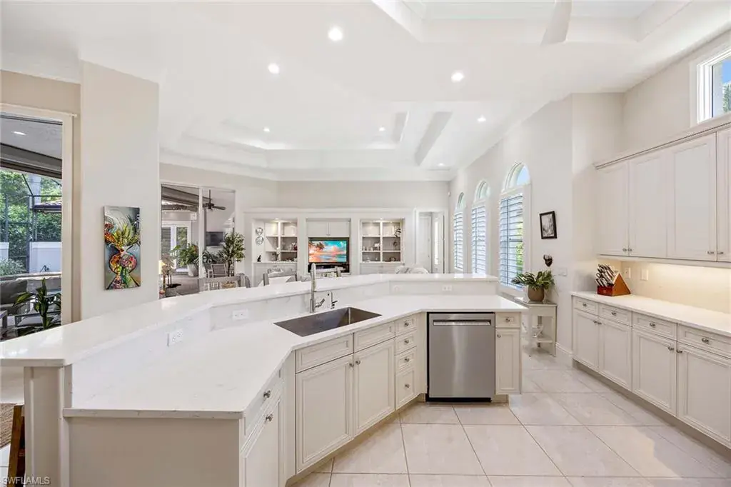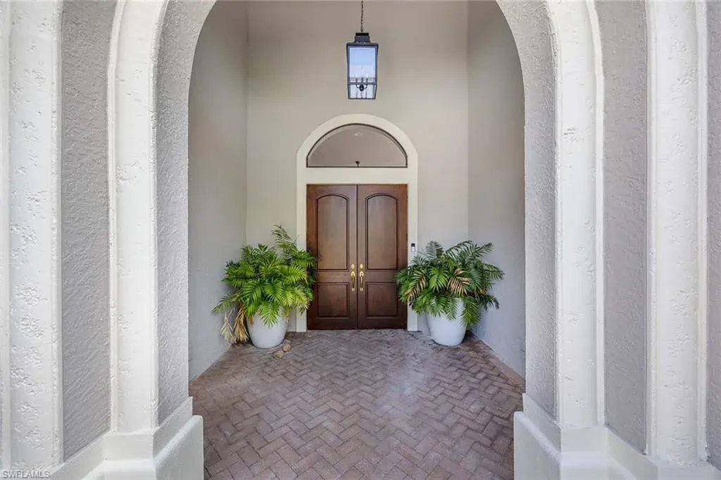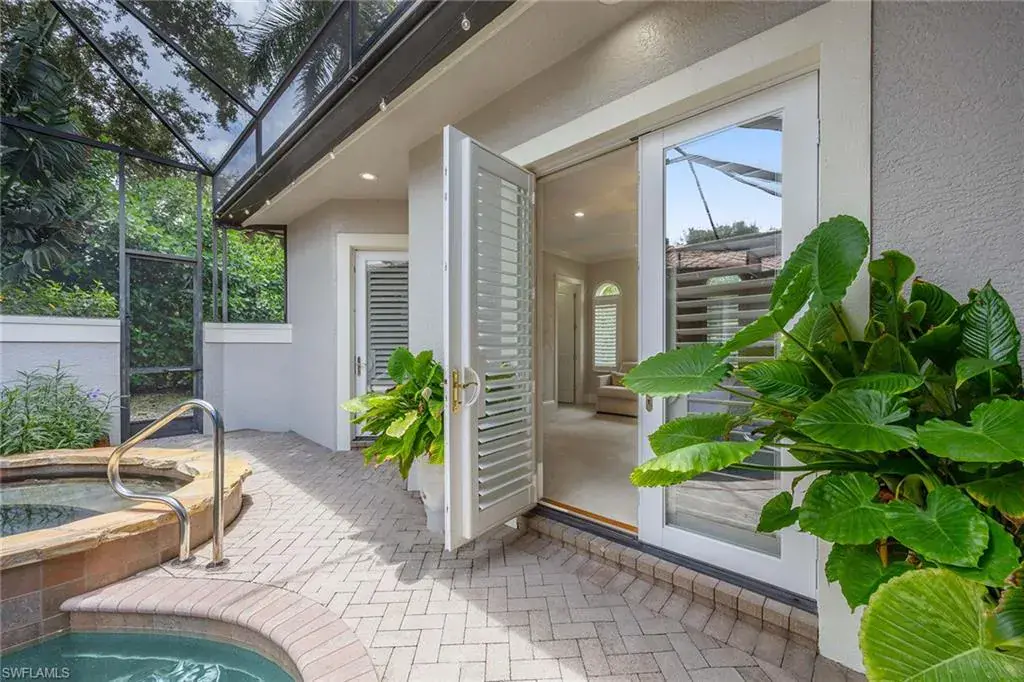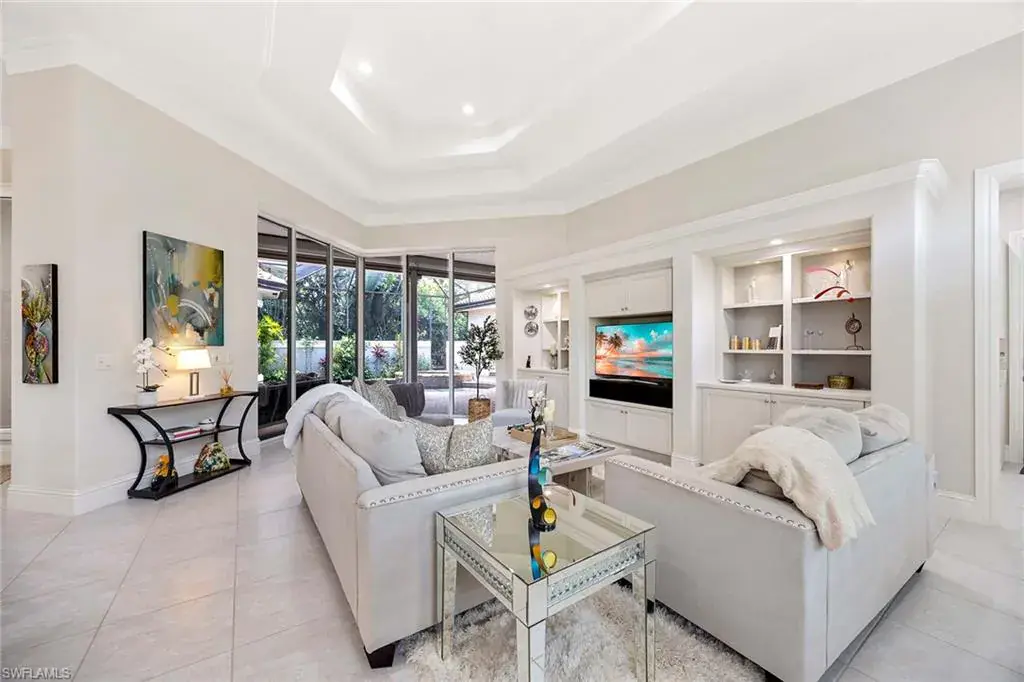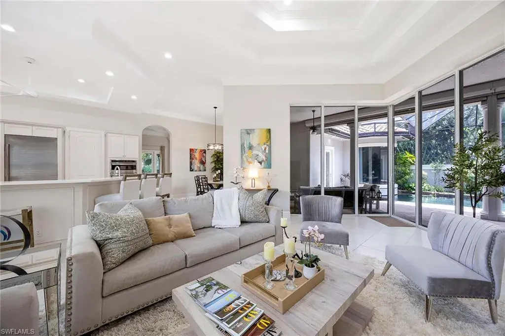 PRICED TO SELL! Turnkey furnished, updated and fabulous! Rarely available in Muirfield at Pelican Marsh, a private gated enclave of just 37 custom homes. This former model home offers 3,100 square feet of tastefully updated living space with three en-suite bedrooms, a saltwater lagoon-style pool and spa, outdoor kitchen, zero-corner sliders and a two-car garage with epoxy flooring. Newer roof (2018). Whole house generator (2020). Three air conditioners for total comfort. Enter through grand double doors into a stunning courtyard entry with pool and spa a Florida oasis. The open concept layout flows seamlessly with porcelain tile flooring throughout, combining leisure and formal dining areas with a beautifully renovated kitchen featuring a neutral white cabinetry, quartz countertops, a stainless-steel induction range with hood, built-in oven/microwave combo, large walk-in pantry and counter-height seating. The elegant living room with a gas fireplace (propane) opens to serene lake and fountain views with eastern exposure. The spacious primary suite offers a cozy sitting area overlooking the pool, dual custom closets, jetted tub, dual vanities and a separate shower. Residents of Pelican Marsh enjoy 24/7 staffed gatehouse, private golf club, clubhouse, tennis and pickleball center, The Court restaurant, fitness center, bocce, biking paths, playground and more. One of the best locations in Naples. All just minutes from white sand beaches, fine dining and everything Naples!